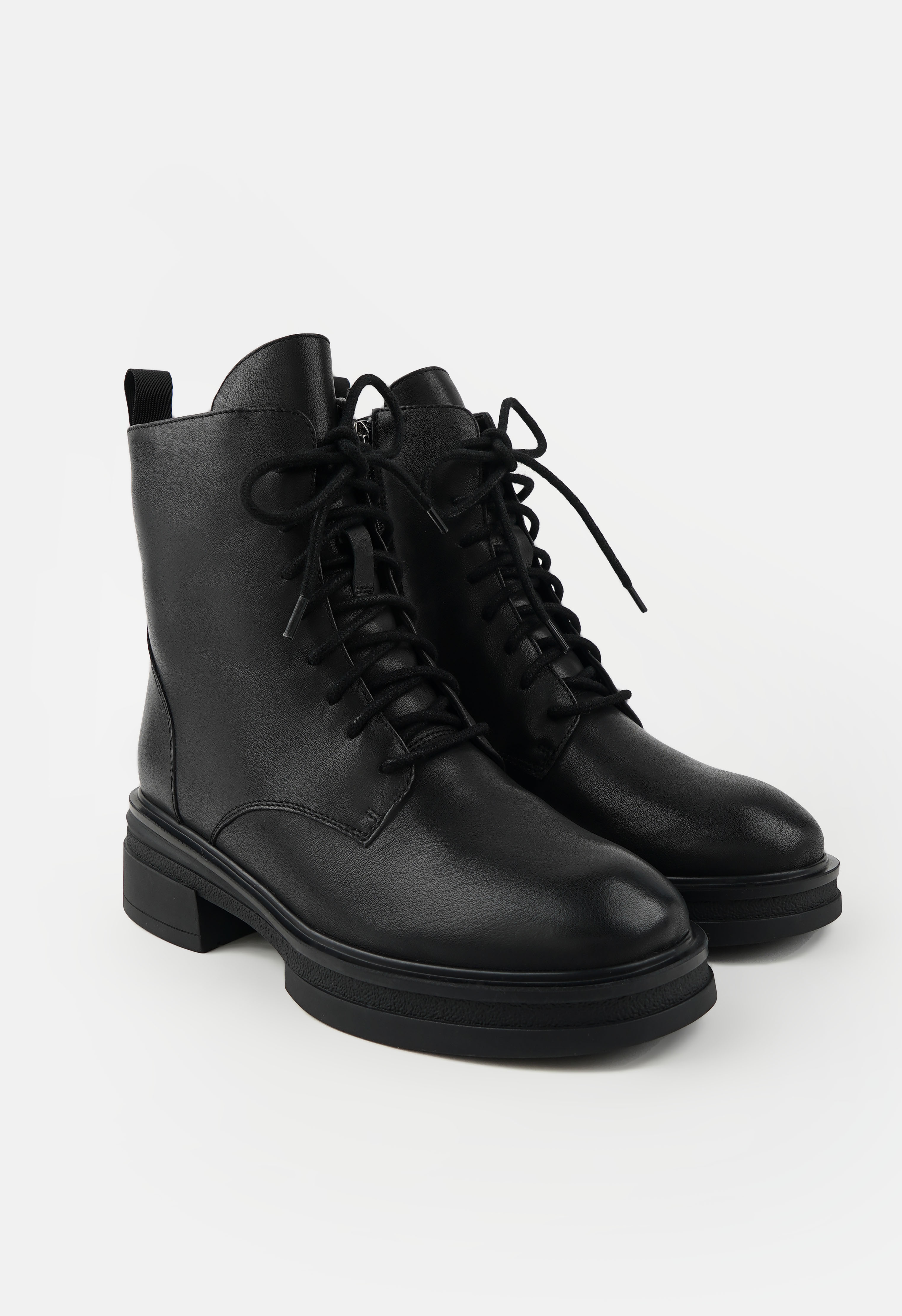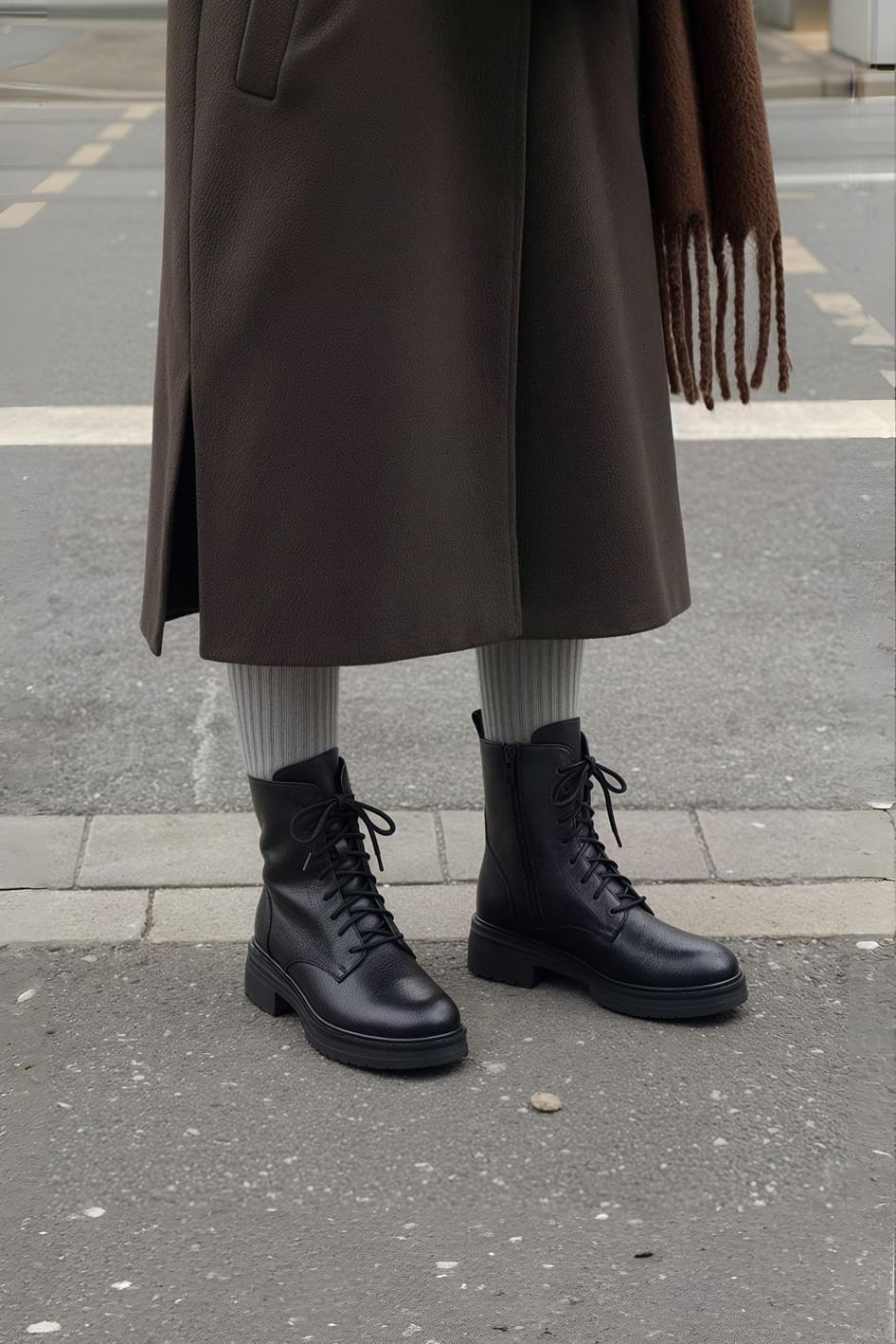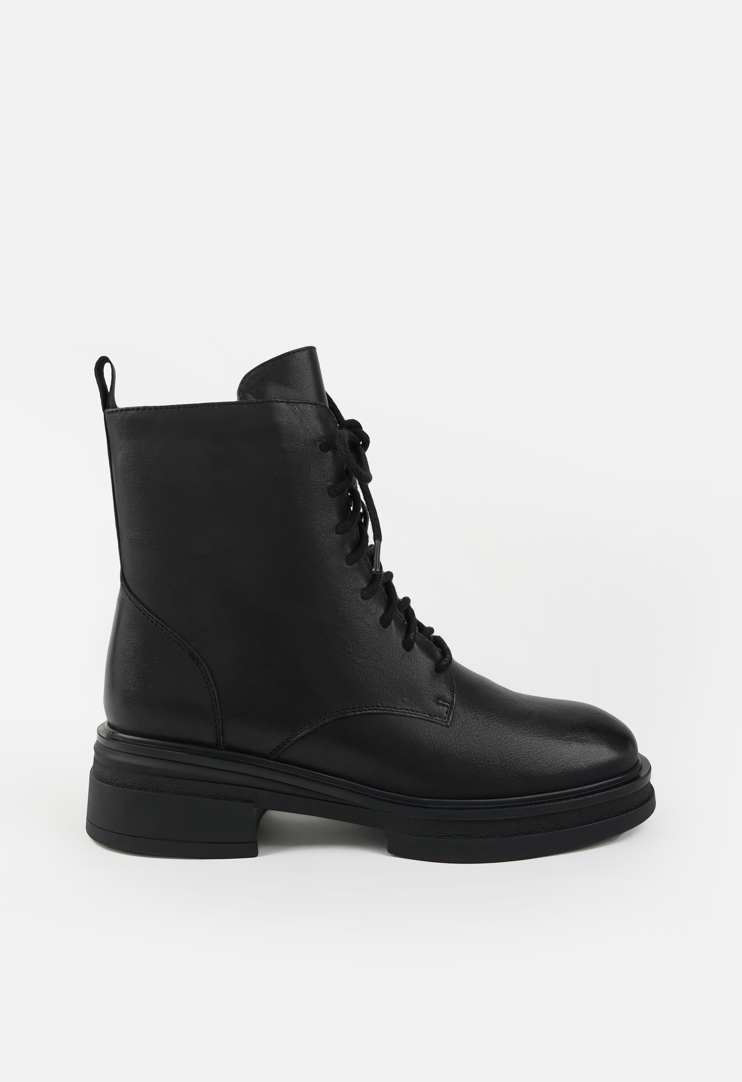 Ботинки черного цвета из натуральной кожи с подкладкой из мягкого меха – сочетание практичности и элегантного стиля для холодного сезона. Гибкая подошва и широкий каблук делают ходьбу легкой и уверенной, а округлый мысок обеспечивает комфорт при повседневной носке. Молния вместе со шнуровкой позволяет идеально подстроить посадку, в то время как металлическая фурнитура придает модели современный и выразительный акцент. Эти ботинки станут универсальной парой, легко сочетаясь с повседневными и более нарядными образами, подчеркивая ваш уверенный и стильный образ.
