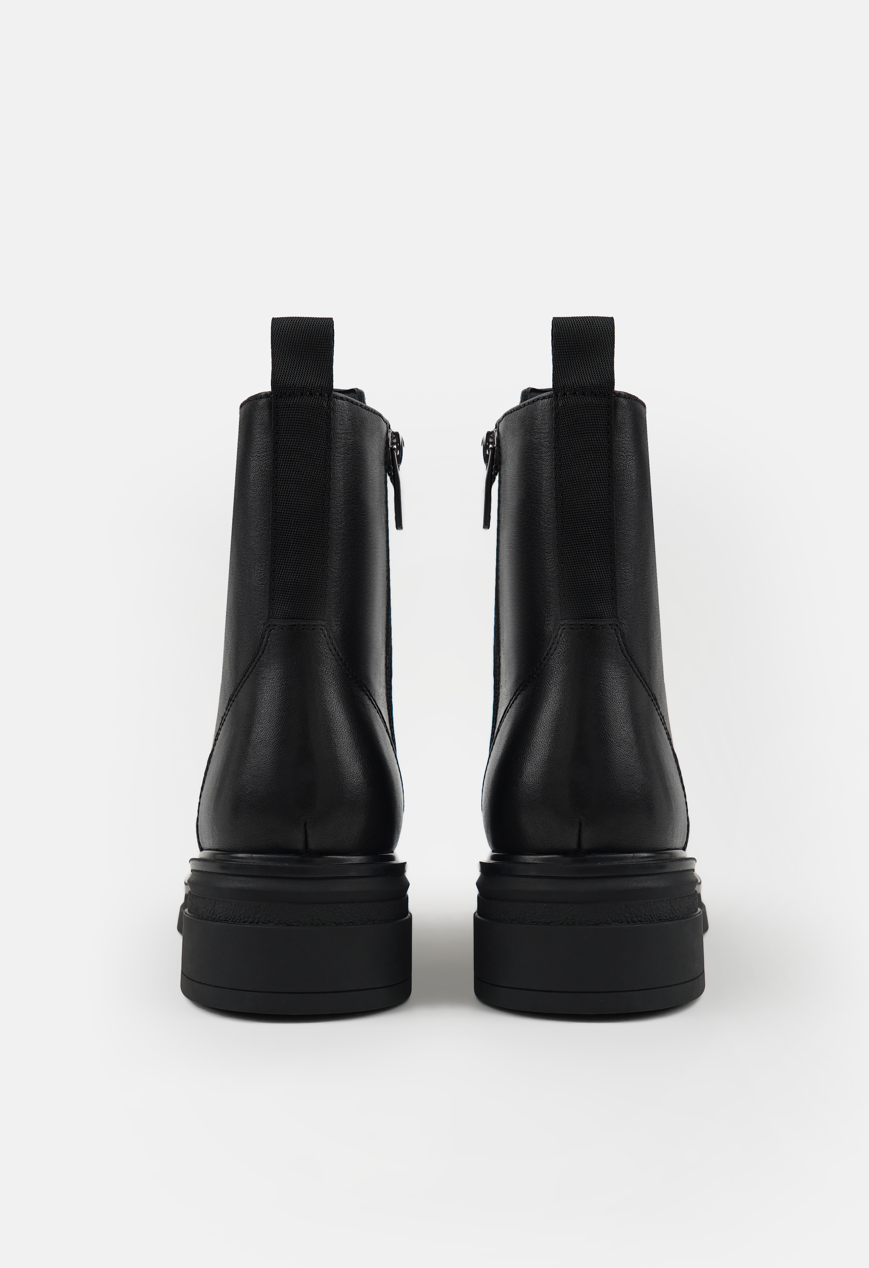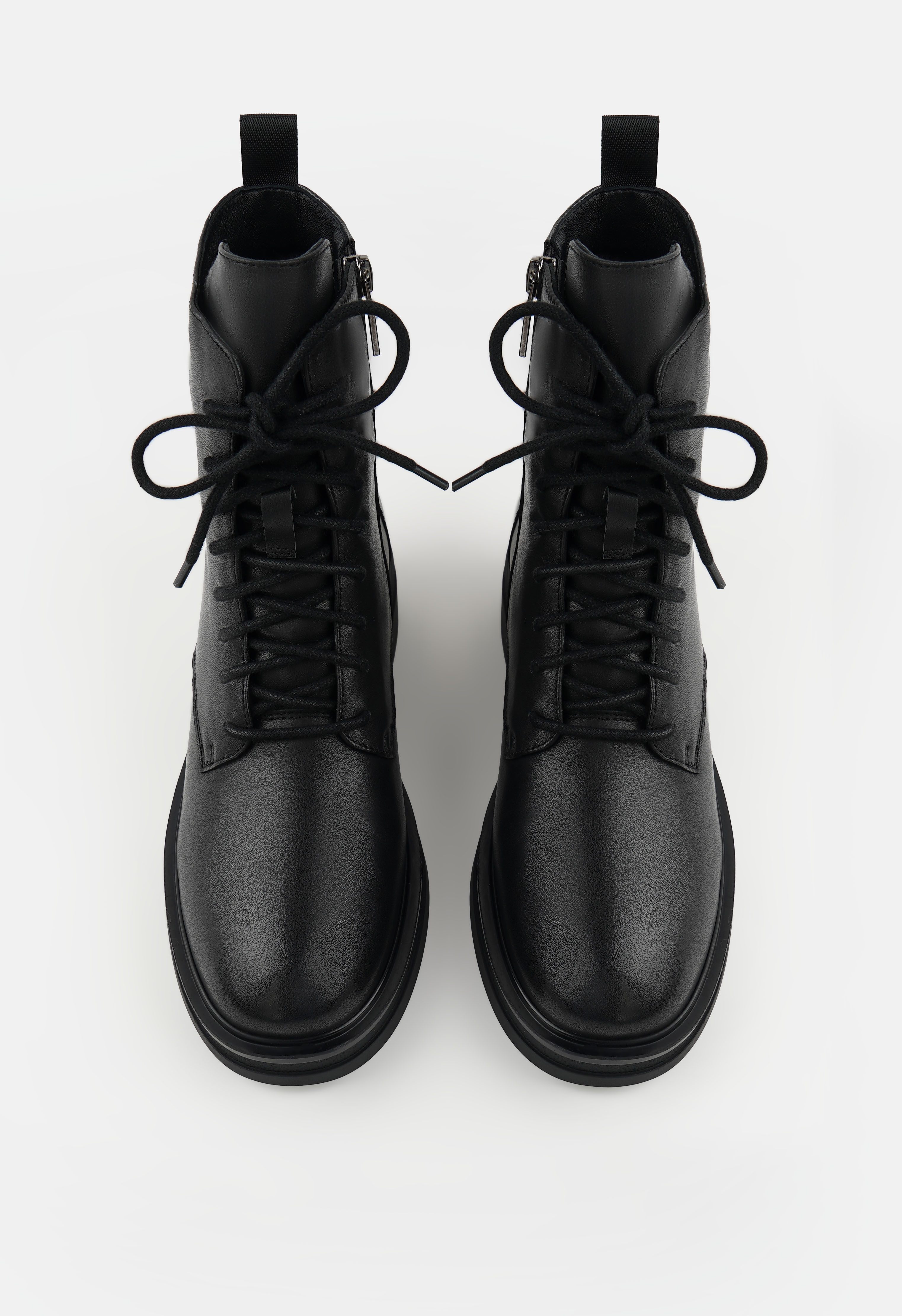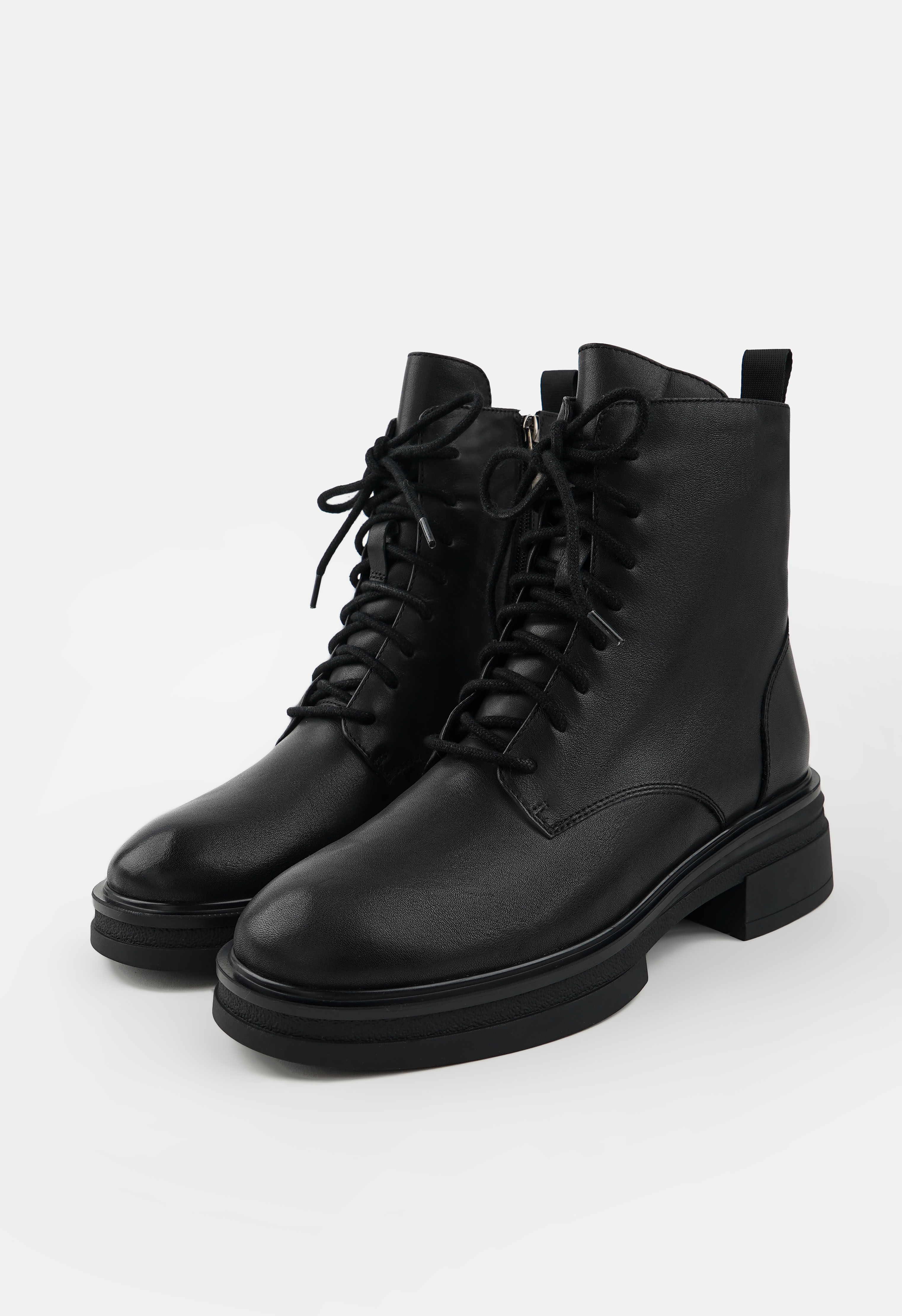 Ботинки черного цвета из натуральной кожи с подкладкой из мягкого меха – сочетание практичности и элегантного стиля для холодного сезона. Гибкая подошва и широкий каблук делают ходьбу легкой и уверенной, а округлый мысок обеспечивает комфорт при повседневной носке. Молния вместе со шнуровкой позволяет идеально подстроить посадку, в то время как металлическая фурнитура придает модели современный и выразительный акцент. Эти ботинки станут универсальной парой, легко сочетаясь с повседневными и более нарядными образами, подчеркивая ваш уверенный и стильный образ.