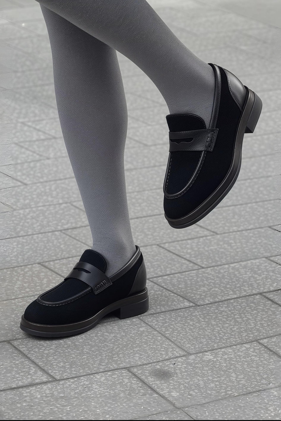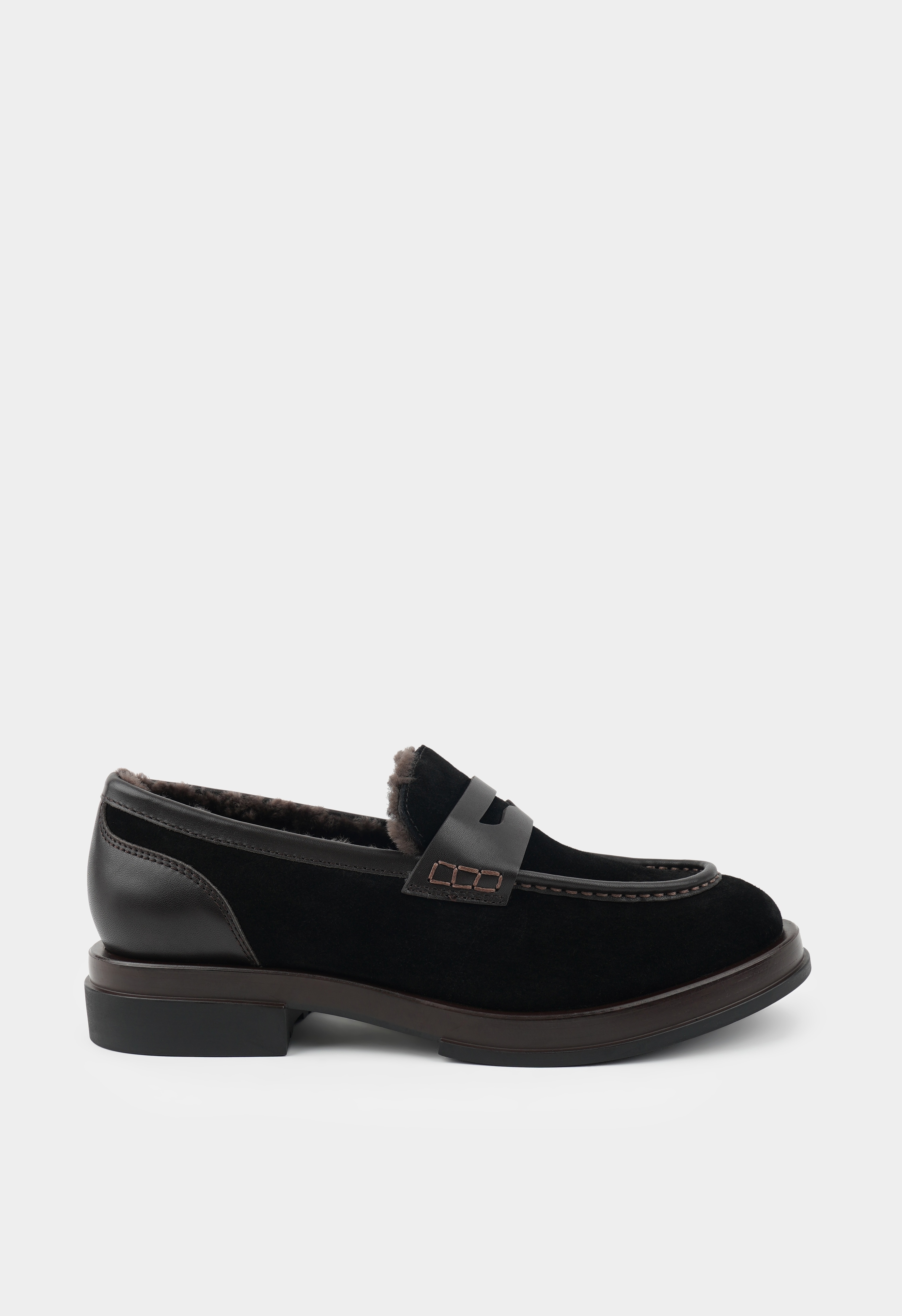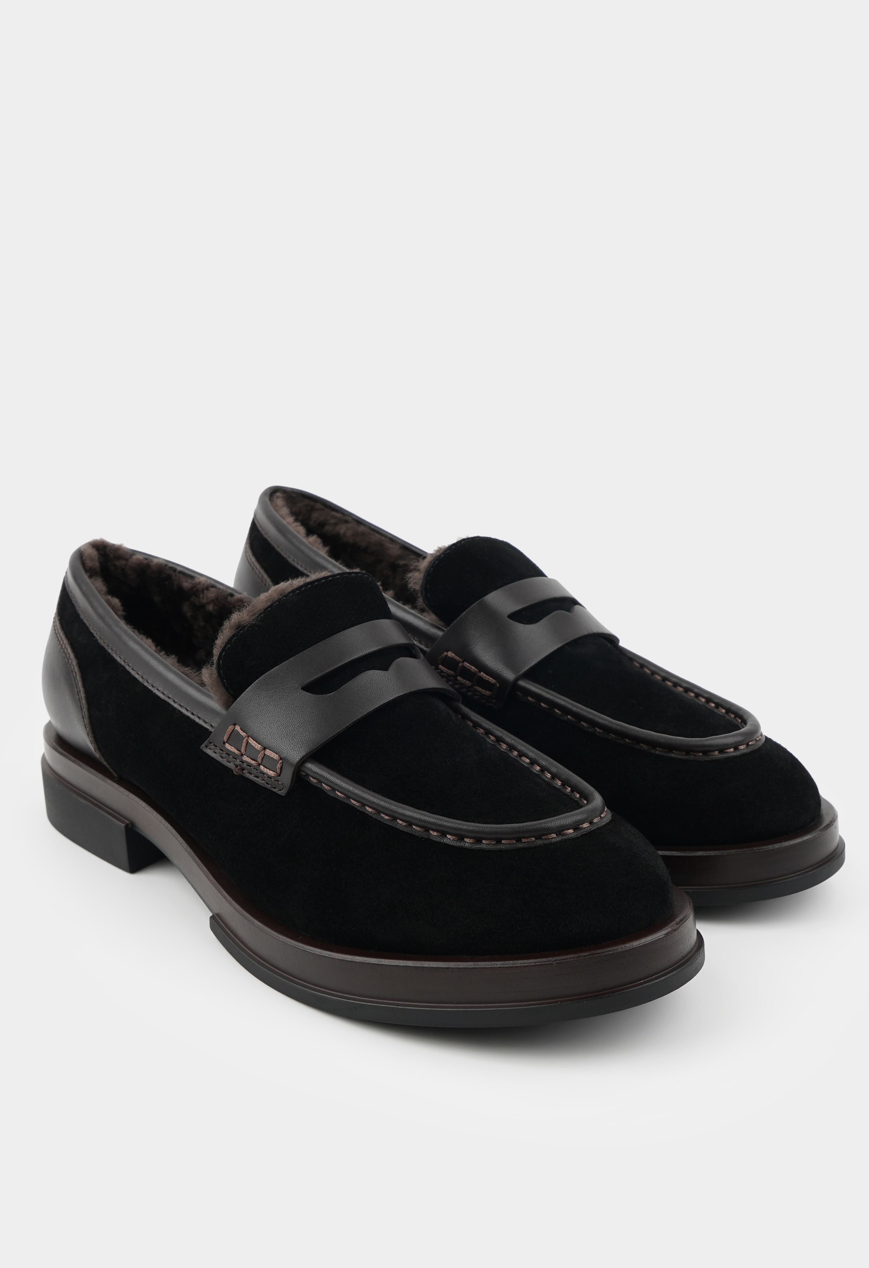 Лоферы из натуральной замши с теплым мехом внутри – это идеальное сочетание элегантного стиля и зимнего комфорта. Глубокий черный цвет делает их универсальными, а округлый мысок и широкий каблук обеспечивают удобство на каждый день. Жесткая подошва дает уверенную опору и долговечность, сохраняя при этом изящество силуэта. Модель легко впишется в современный гардероб, станет уместной и в деловом образе, и в повседневных прогулках, даря ощущение уюта и безупречного стиля в холодное время года.