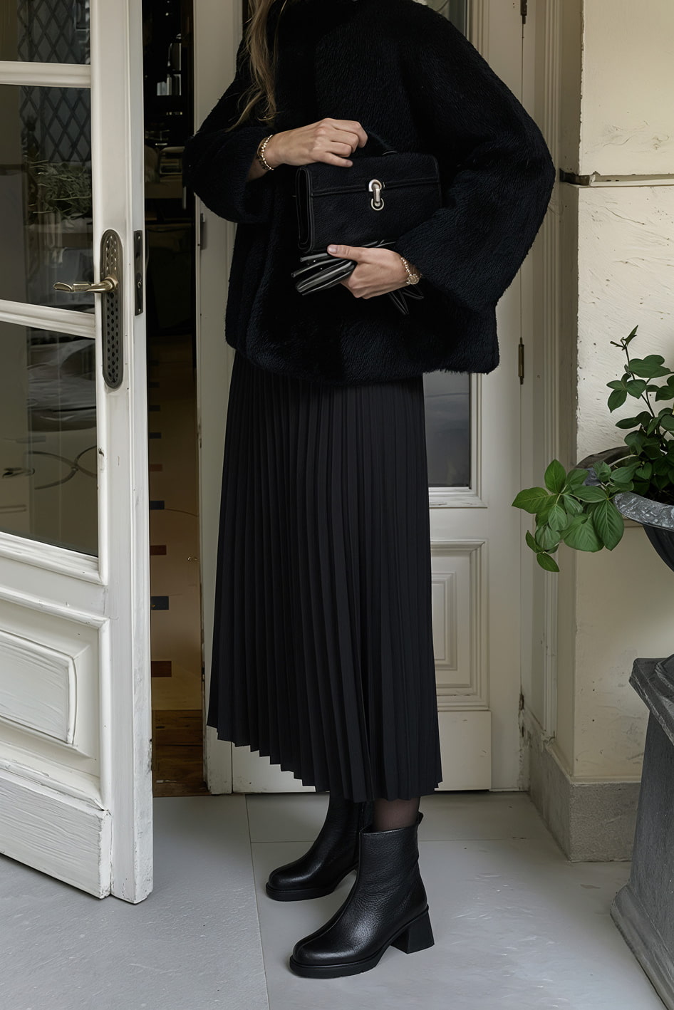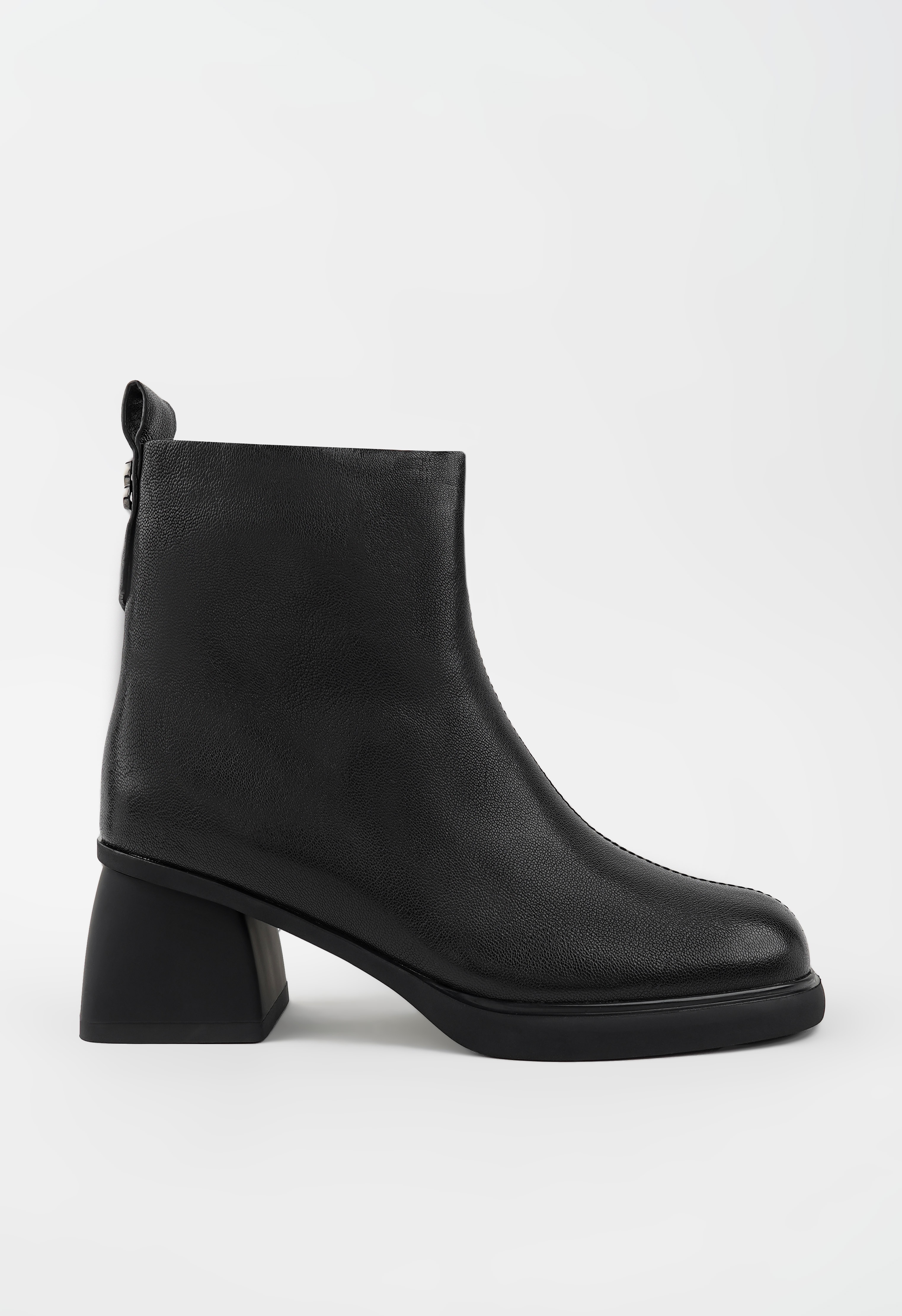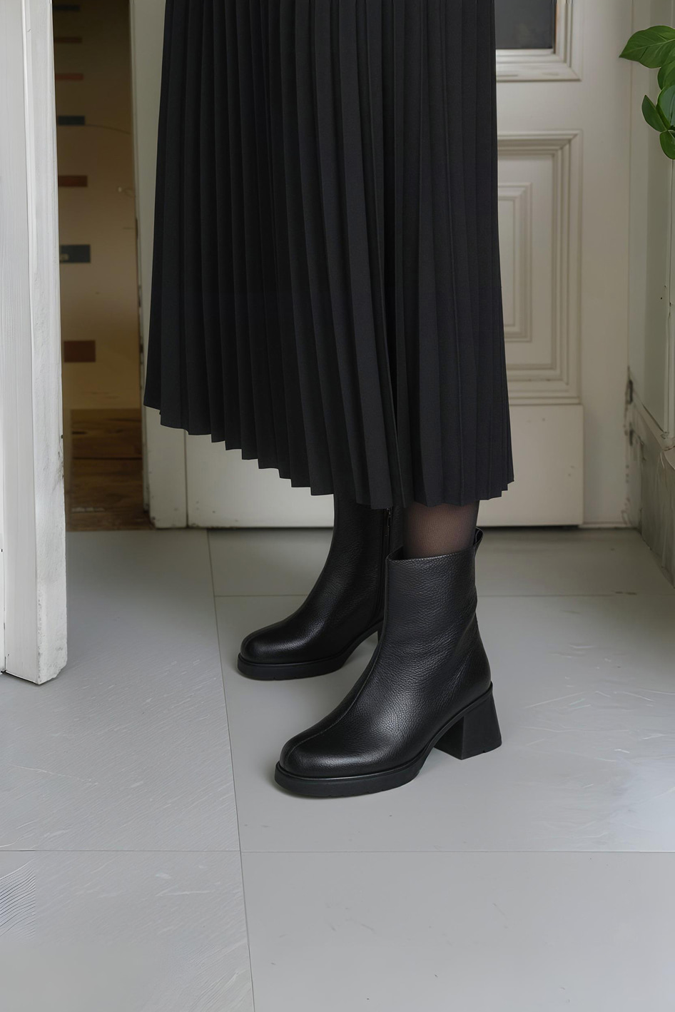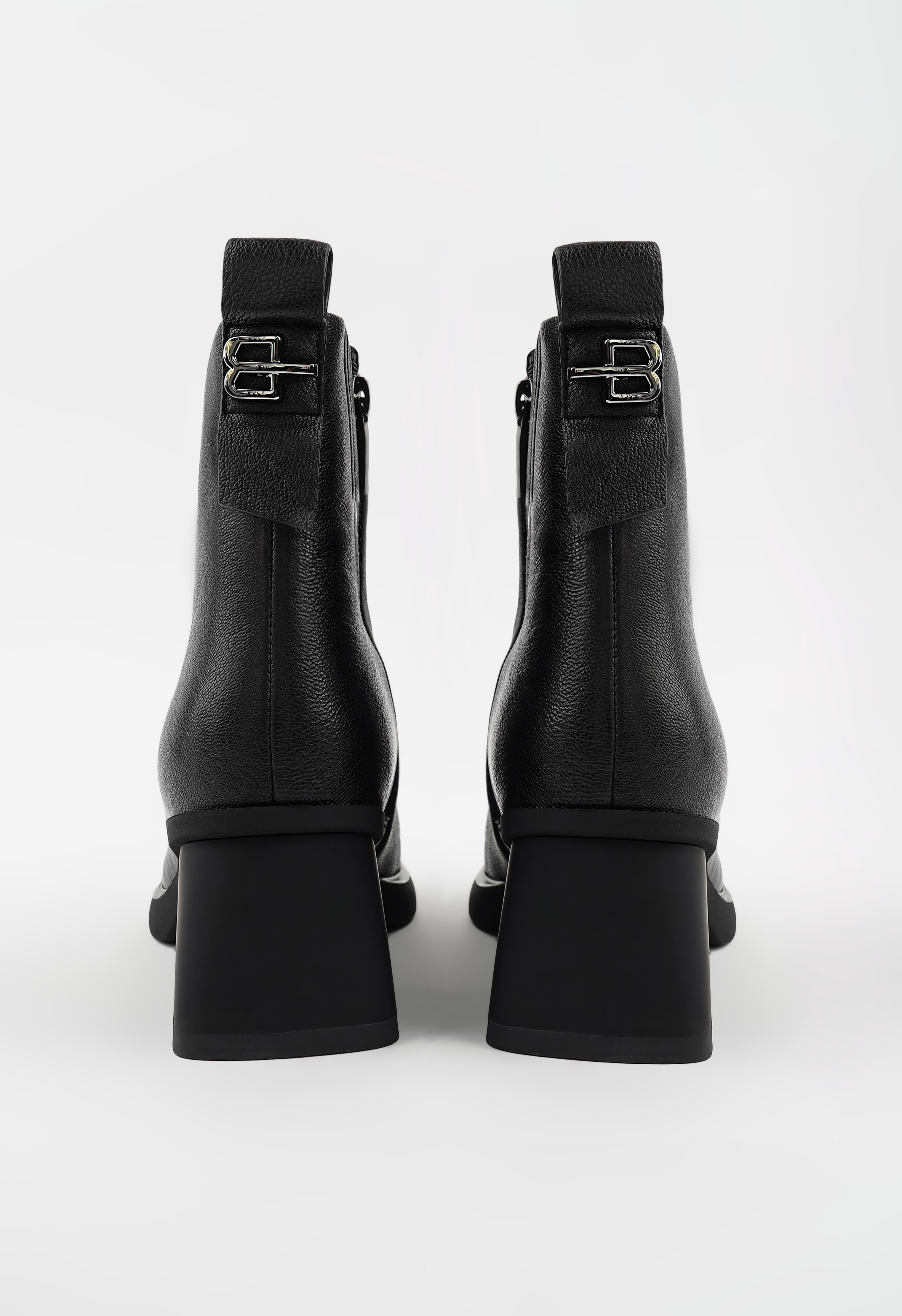 Черные ботильоны из натуральной кожи с мягким натуральным мехом внутри – это гармония стиля и тепла для прохладных дней. Гибкая подошва и округлый мысок делают их невероятно удобными в ежедневной носке, а трапециевидный каблук добавляет устойчивости и визуально вытягивает силуэт. Элегантная металлическая фурнитура и практичная молния подчеркивают современный характер модели. Эти ботильоны легко впишутся как в повседневные, так и в более строгие образы, даря уверенность, комфорт и безупречный стиль в любой ситуации.