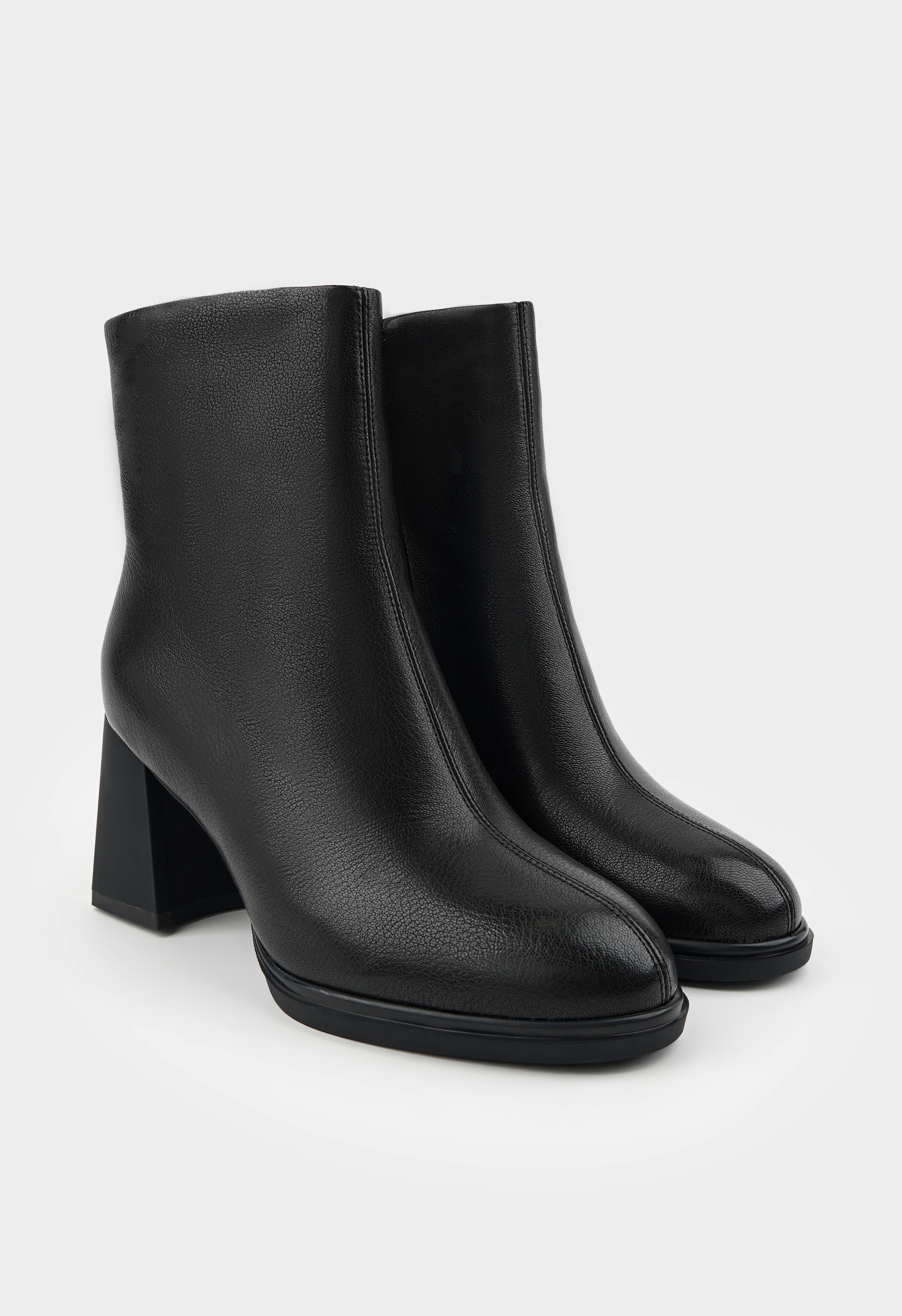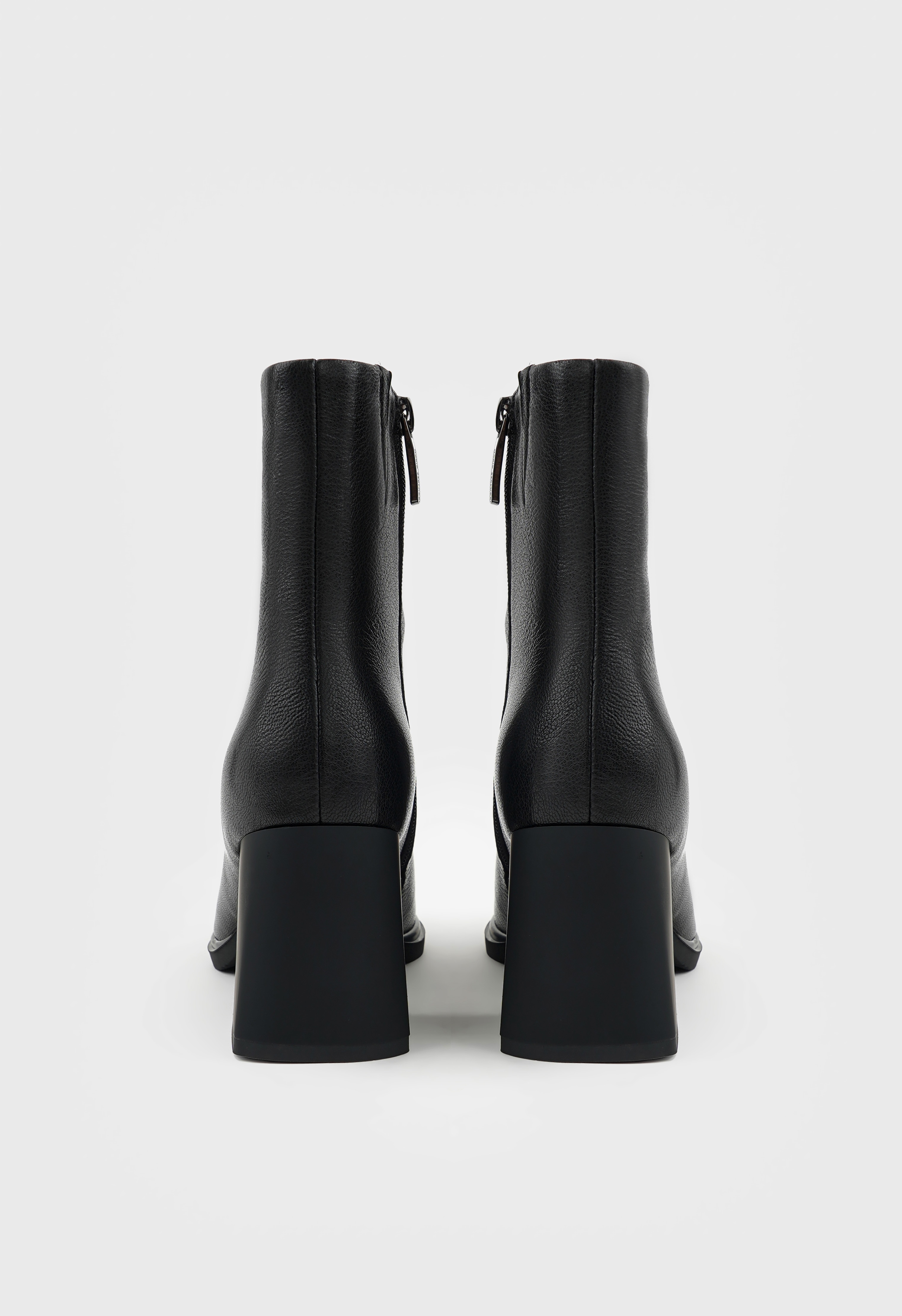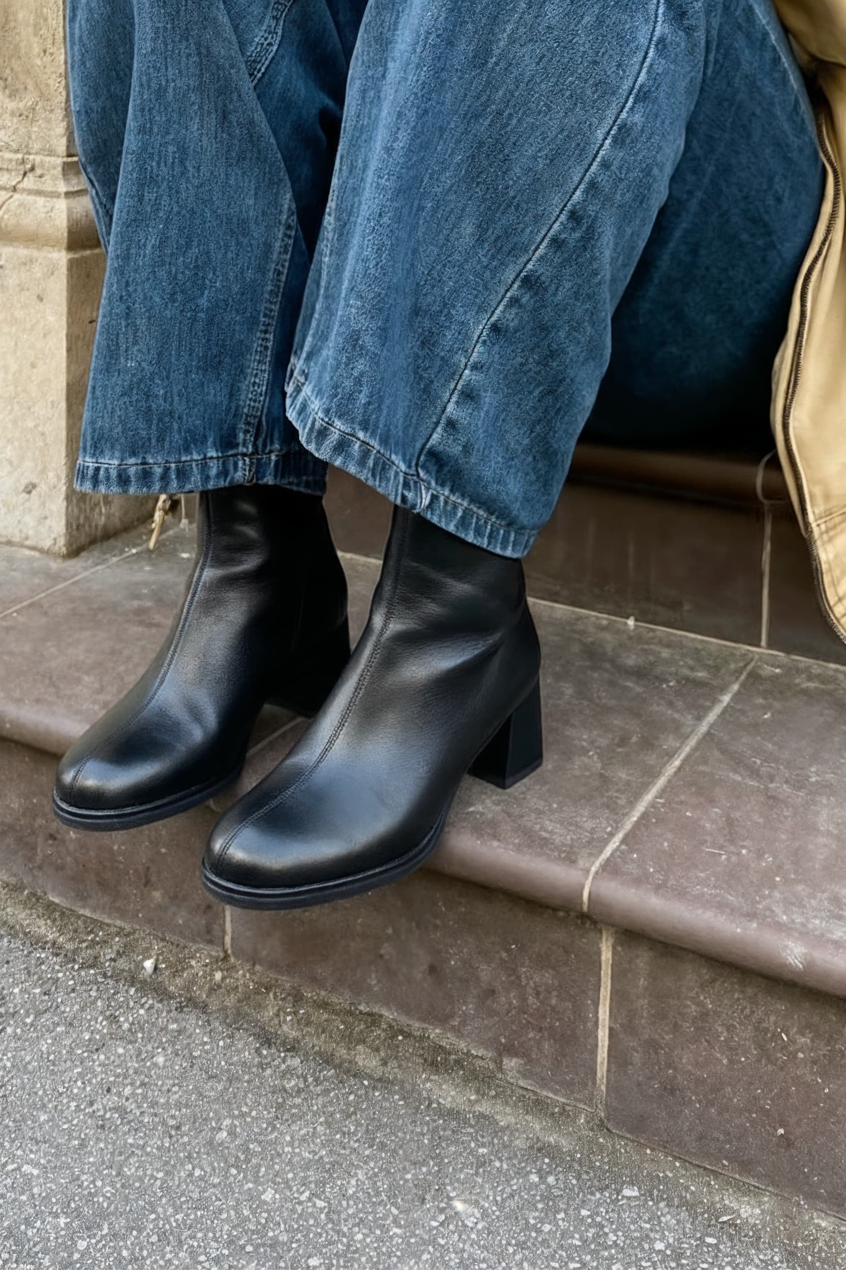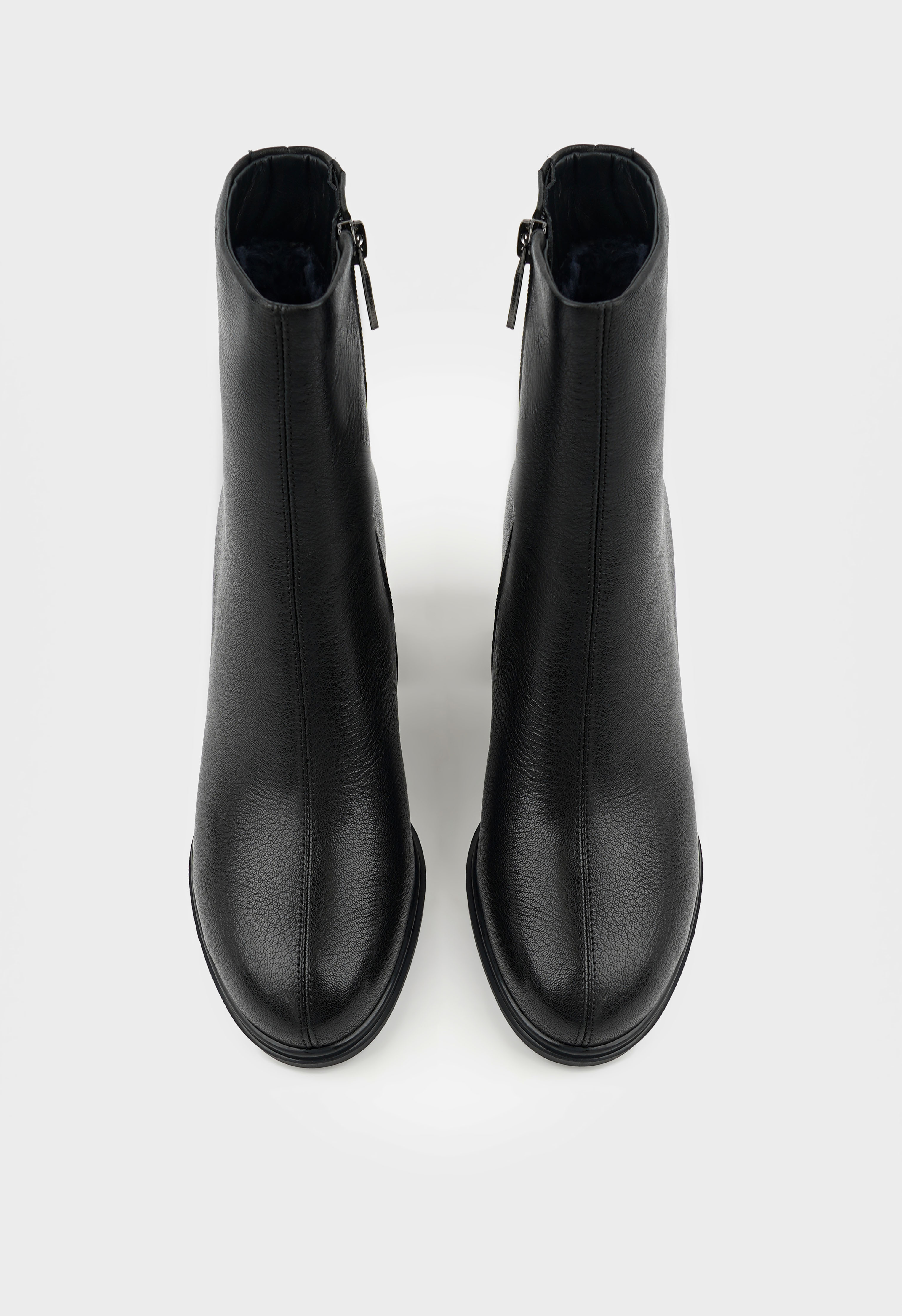 Ботильоны из натуральной кожи с мягким натуральным мехом внутри – идеальный союз стиля и тепла. Черный цвет делает их универсальными, а округлый мысок и скошенный каблук придают образу женственность и легкую дерзость. Гибкая подошва обеспечивает комфорт при каждом шаге, в то время как молния и фурнитура в цвете металлик добавляют современный акцент.