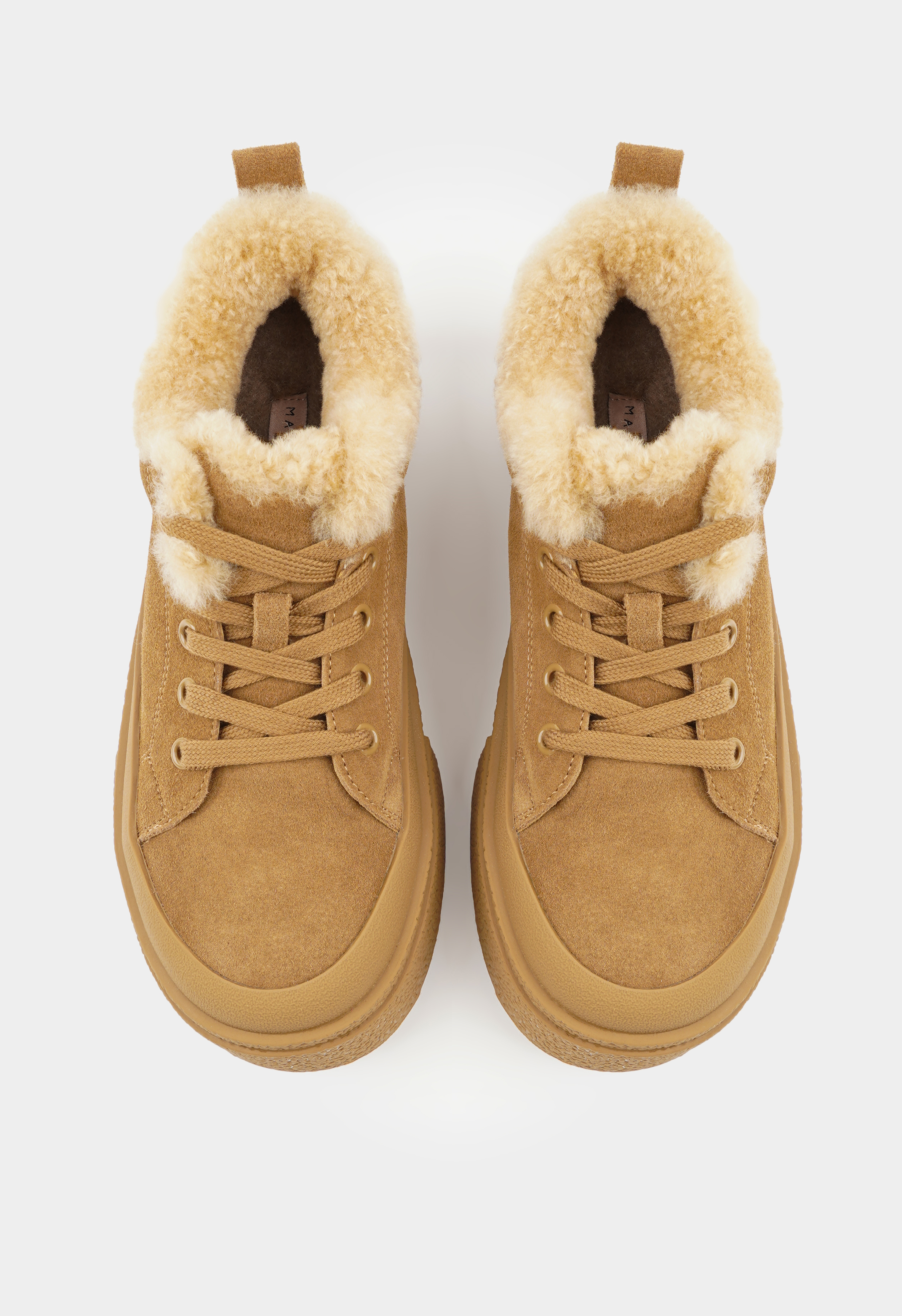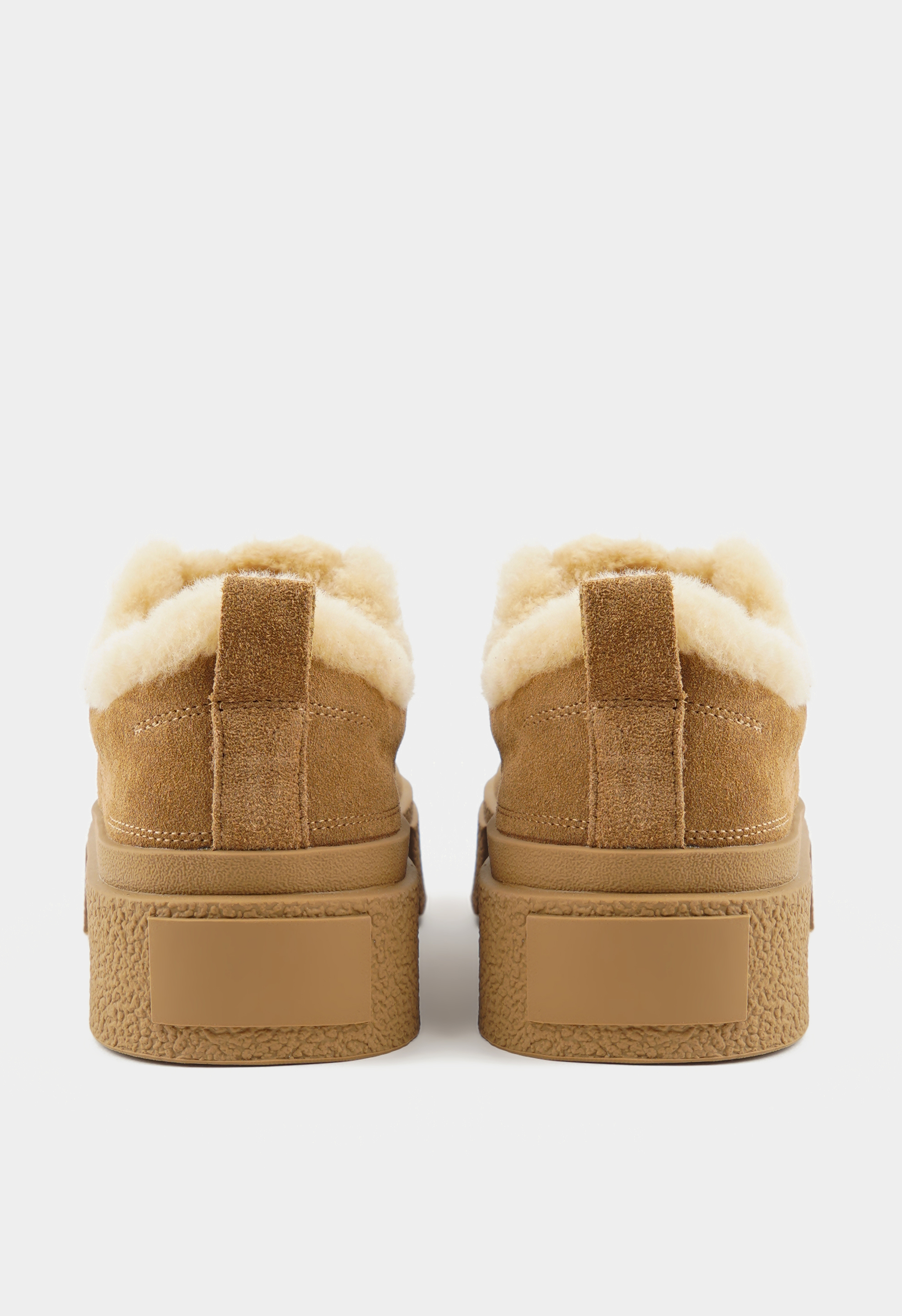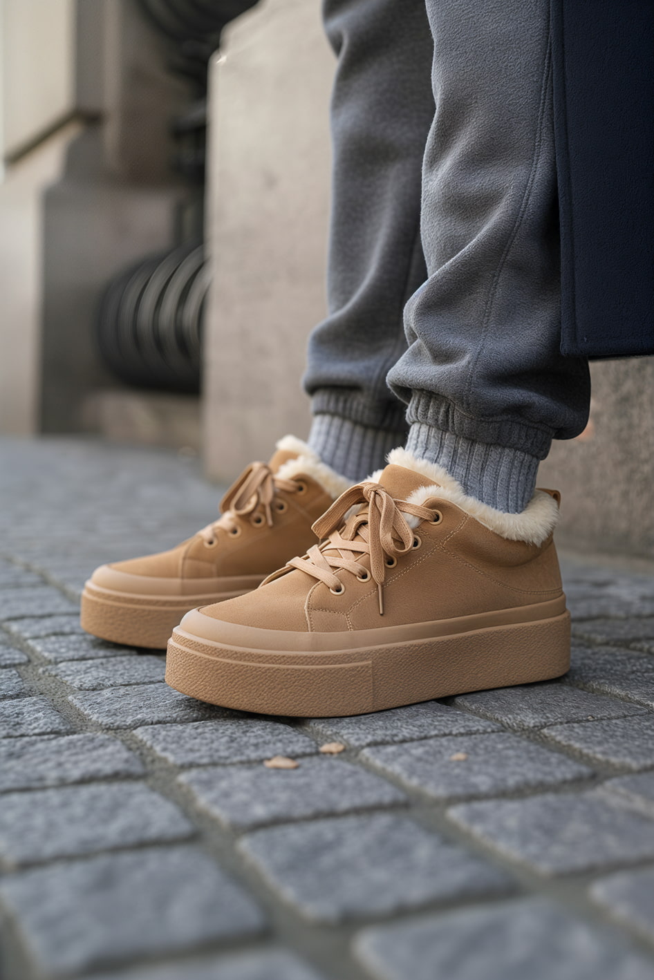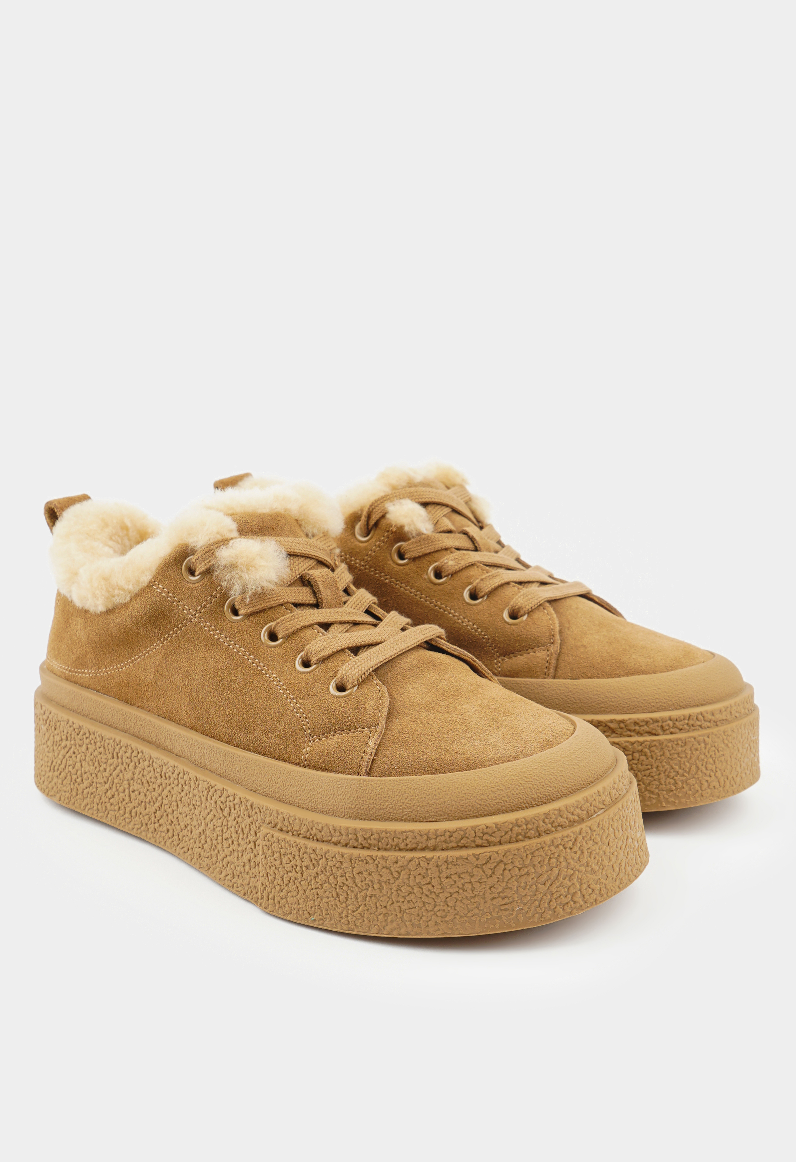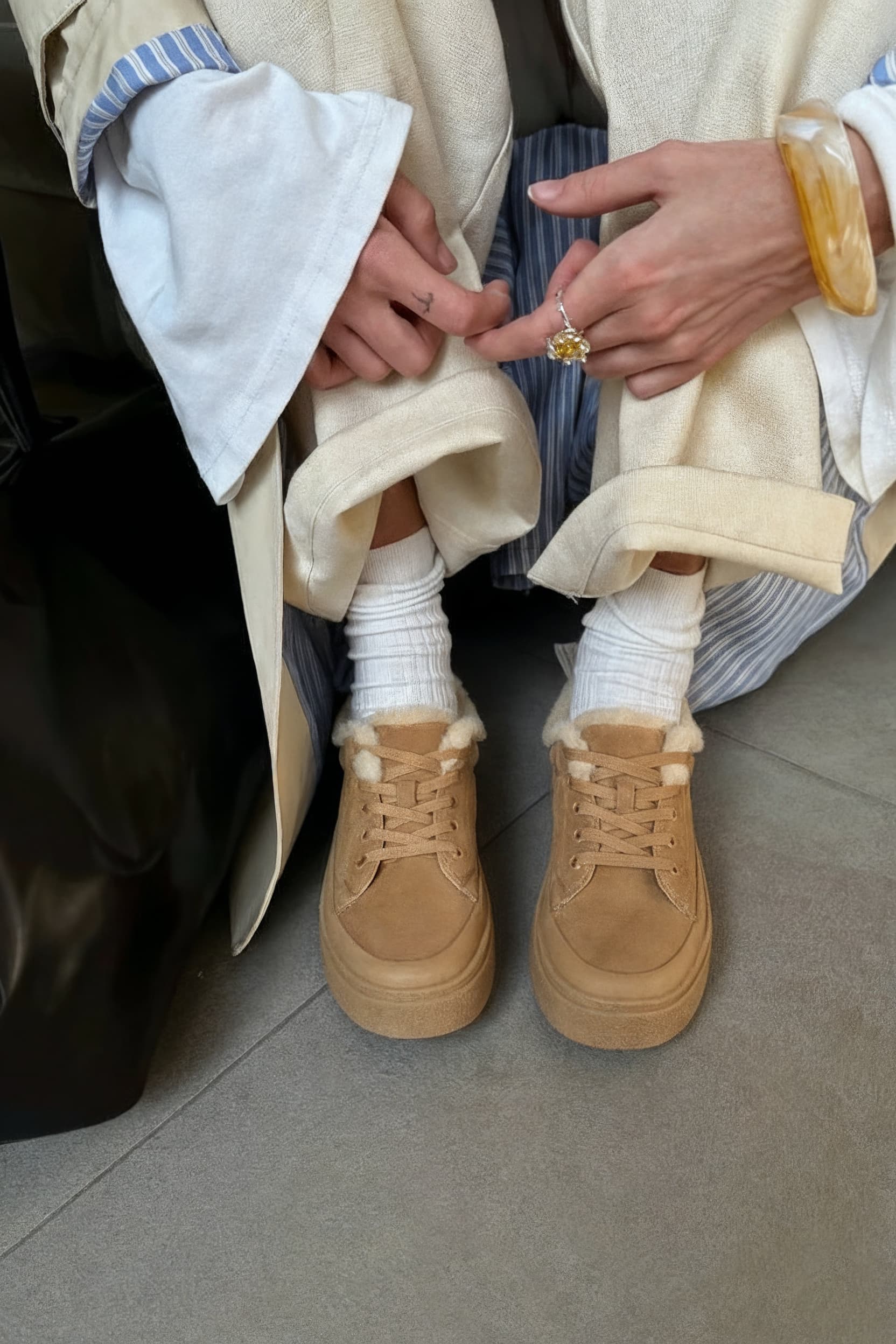 Кеды из натуральной замши в нежном бежевом оттенке – уют и стиль, которые идут с вами в ногу с любыми планами. Внутри – мягкая натуральная шерсть, дарящая тепло даже в самые прохладные дни, а жесткая подошва с платформой обеспечивает надежную поддержку и защиту. Округлый мысок и шнуровка с коричневой фурнитурой создают гармоничный и современный образ, легко сочетающийся с джинсами, брюками или платьем.