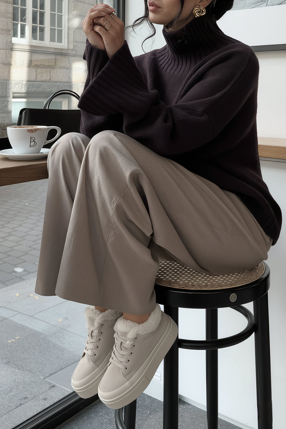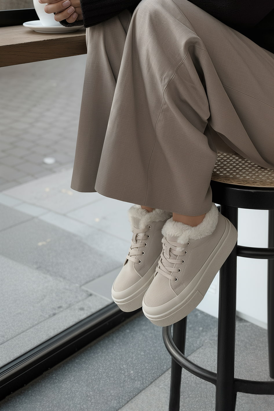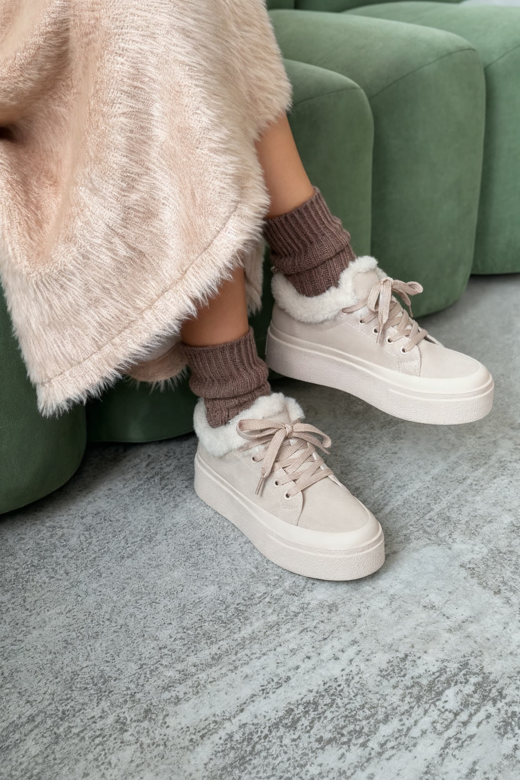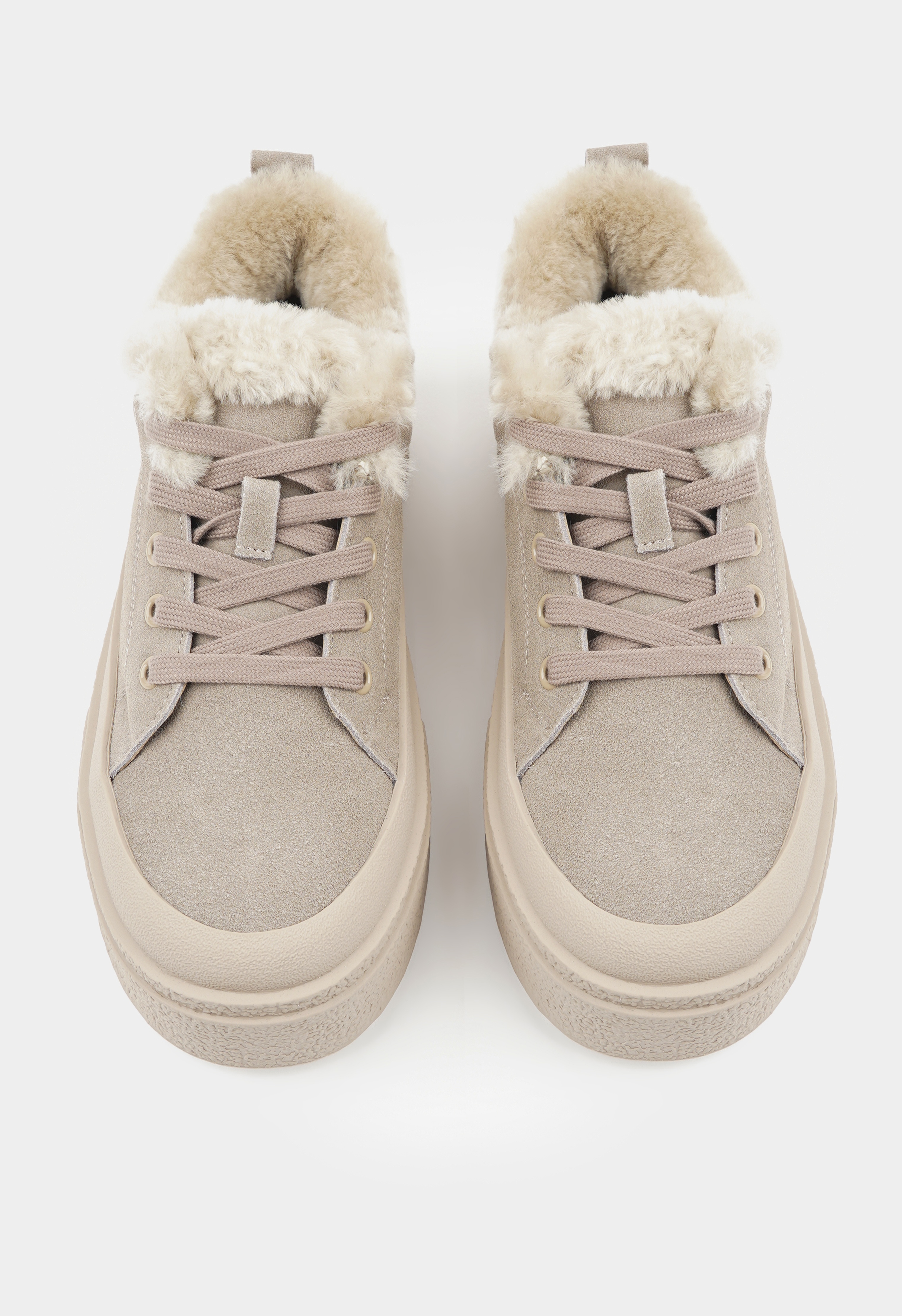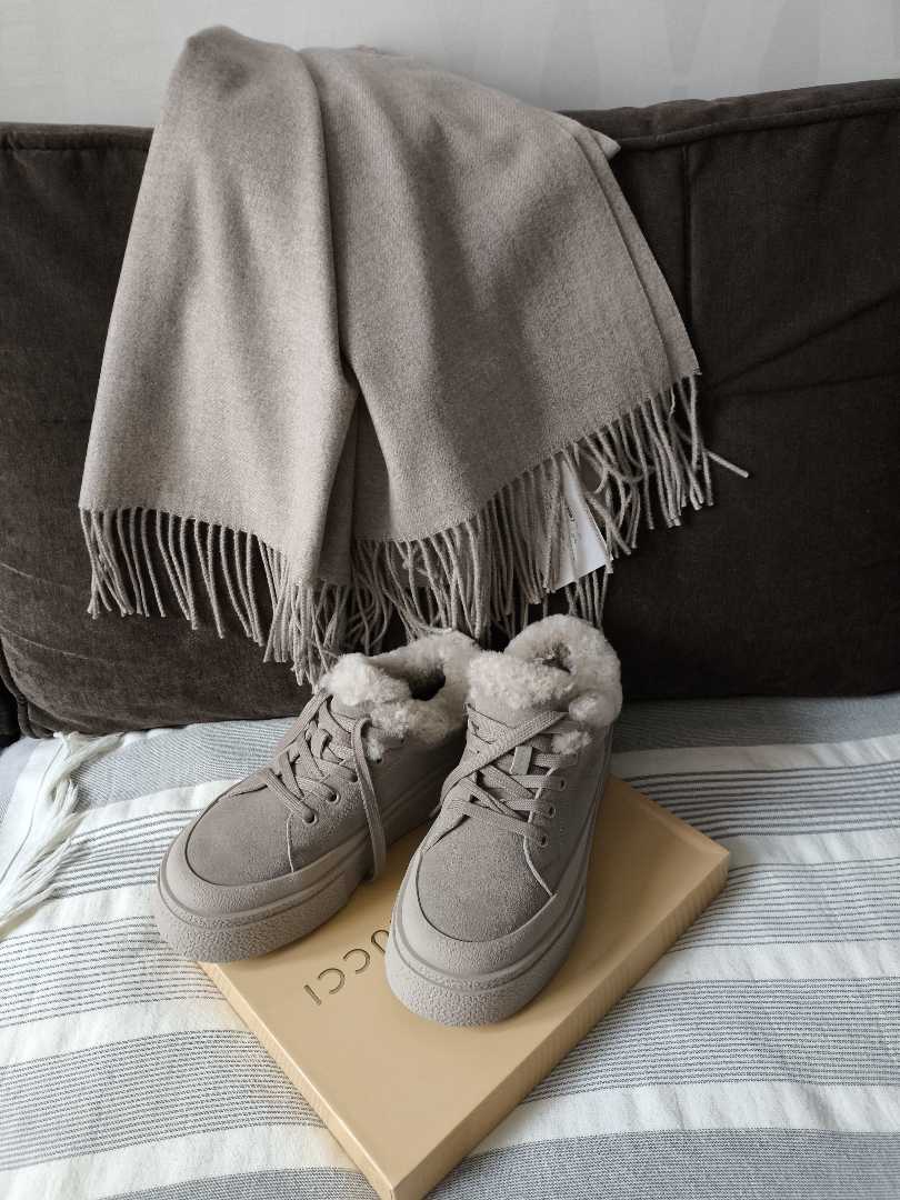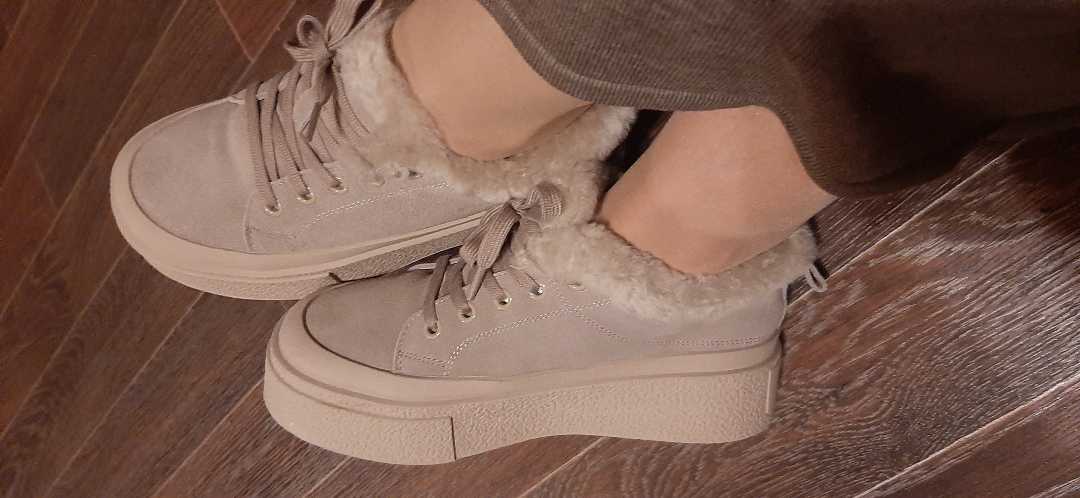 Кеды из натуральной замши в нежном сером оттенке – уют и стиль, которые идут с вами в ногу с любыми планами. Внутри – мягкая натуральная шерсть, дарящая тепло даже в самые прохладные дни, а жесткая подошва с платформой обеспечивает надежную поддержку и защиту. Округлый мысок и шнуровка с серой фурнитурой создают гармоничный и современный образ, легко сочетающийся с джинсами, брюками или платьем.