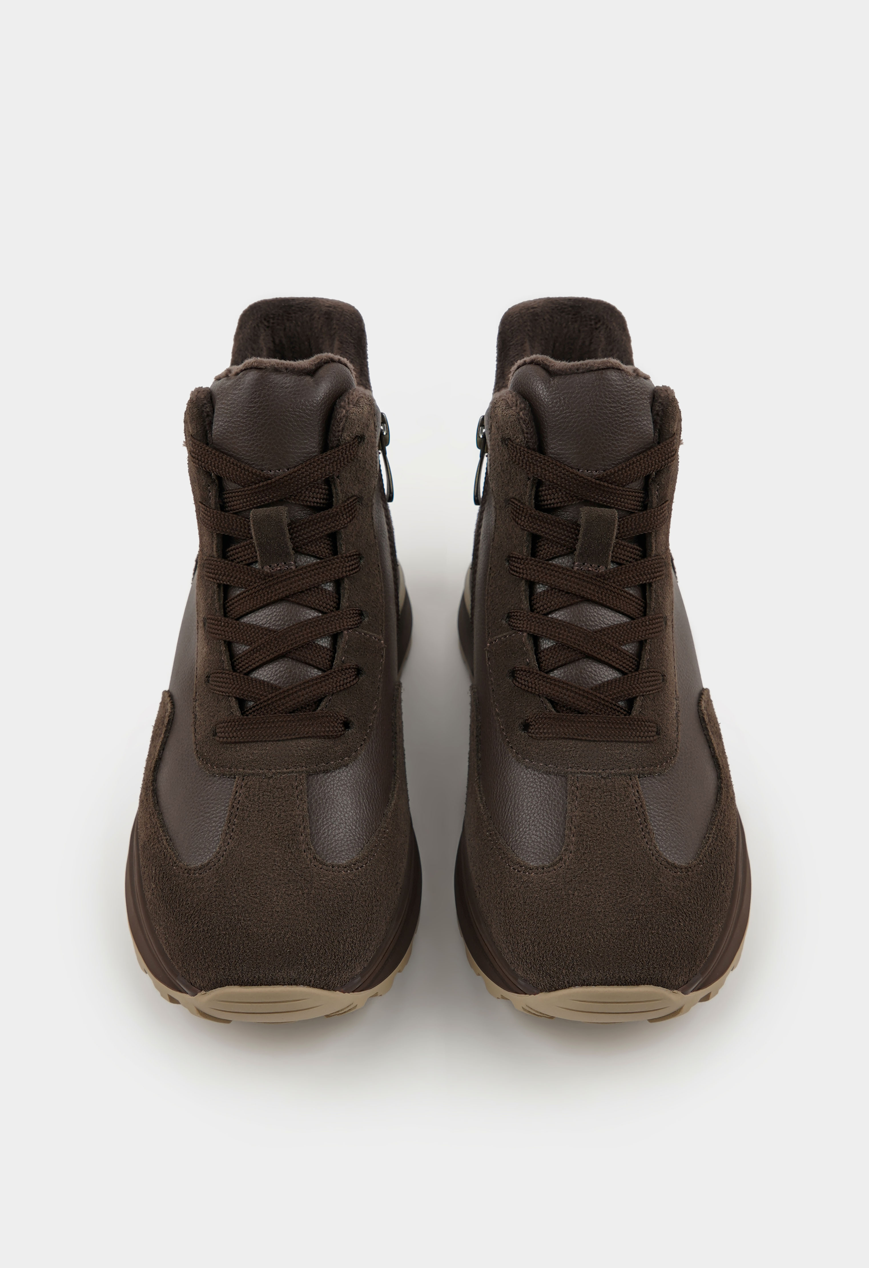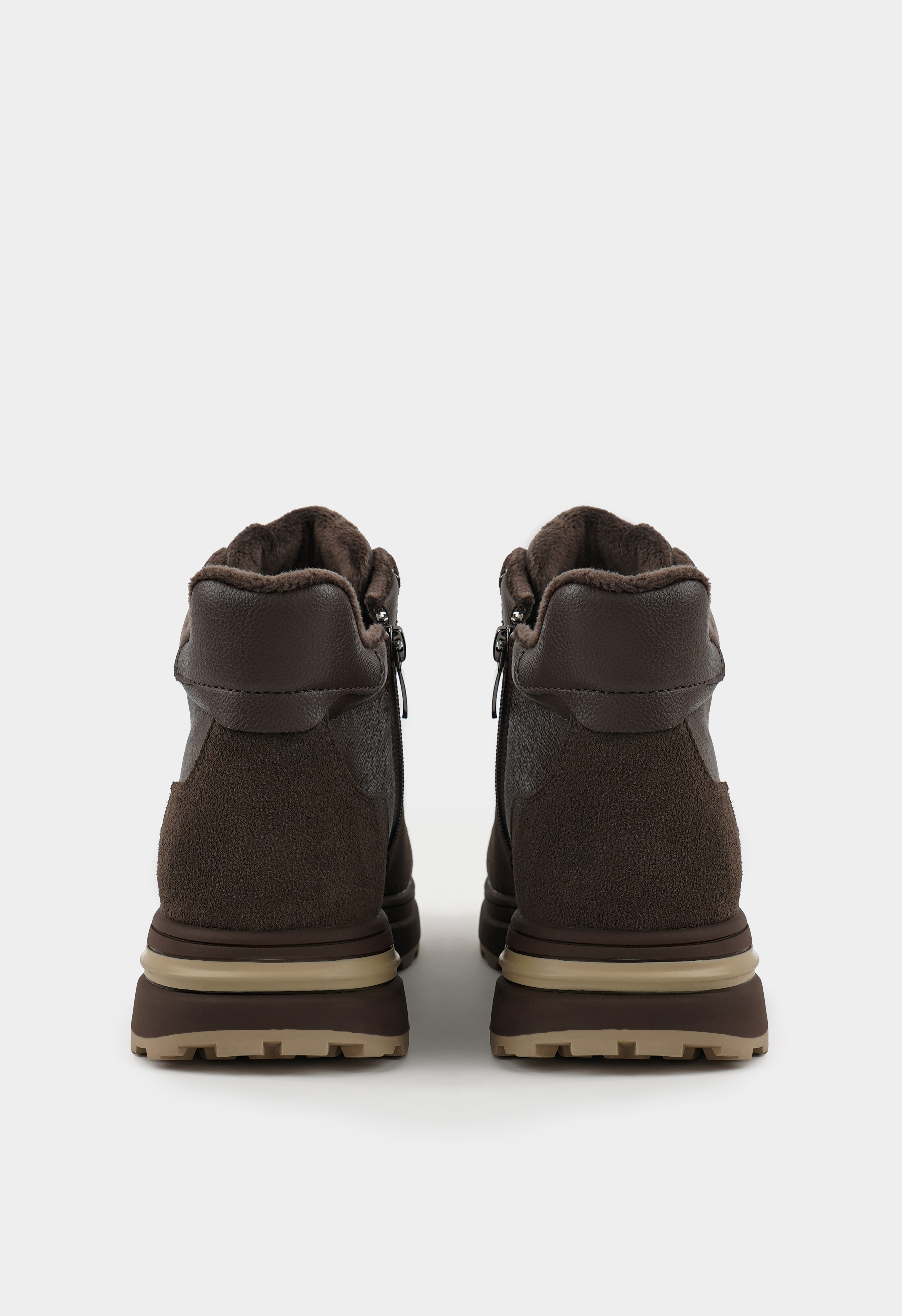 Комфортные ботинки в коричневом цвете созданы для тех, кто хочет чувствовать уверенность и уют в любую погоду. Сочетание натуральной кожи и замши придает модели выразительный, фактурный вид и повышает износостойкость, а внутренняя отделка из шерсти обеспечивает мягкость и приятное тепло. Жесткая подошва гарантирует устойчивость, округлый мысок делает обувь удобной даже при длительной ходьбе, в то время как сочетание молнии и шнуровки позволяет легко подгонять посадку. Эффектная фурнитура в цвете металлик добавляет современный акцент, платформа делает шаг легким и придает силуэту стильную динамику.