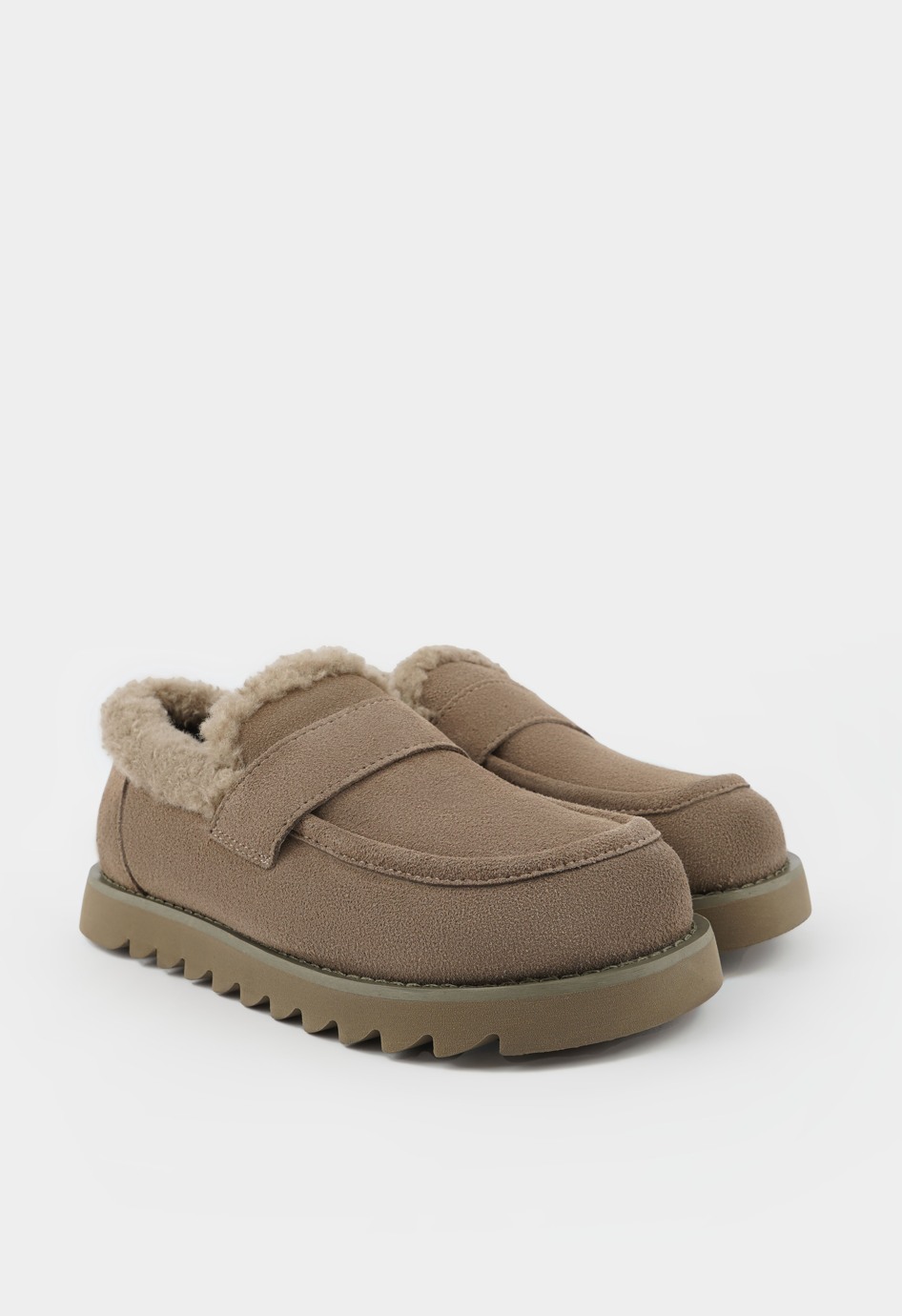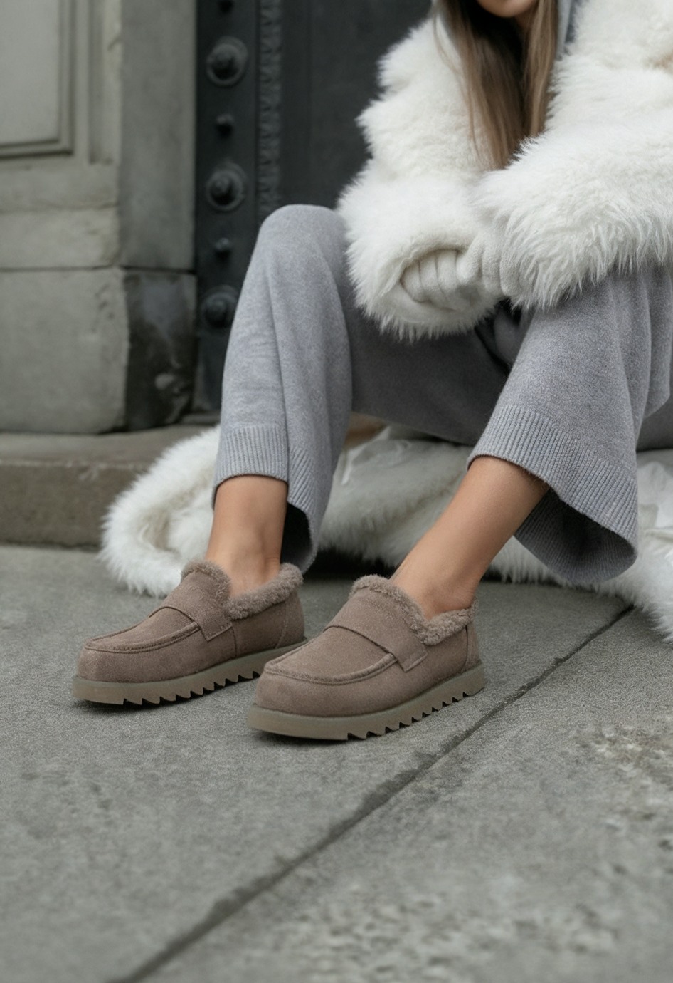 Эти стильные бежевые лоферы из благородной натуральной замши с выразительной платформой и классическим округлым мыском создают уютный и одновременно статусный образ для холодного сезона. Модель с жесткой износостойкой подошвой обеспечивает надежную устойчивость, а роскошная подкладка из натуральной шерсти мягко согревает в любые морозы. Универсальная пара станет идеальным дополнением городского гардероба, безупречно сочетаясь с утепленными джинсами, грубыми свитерами и практичными пальто, даря непревзойденный комфорт и уверенность в каждом шаге.