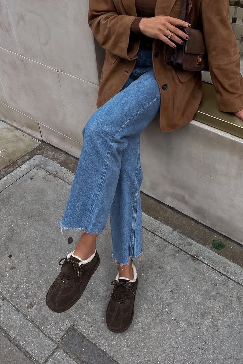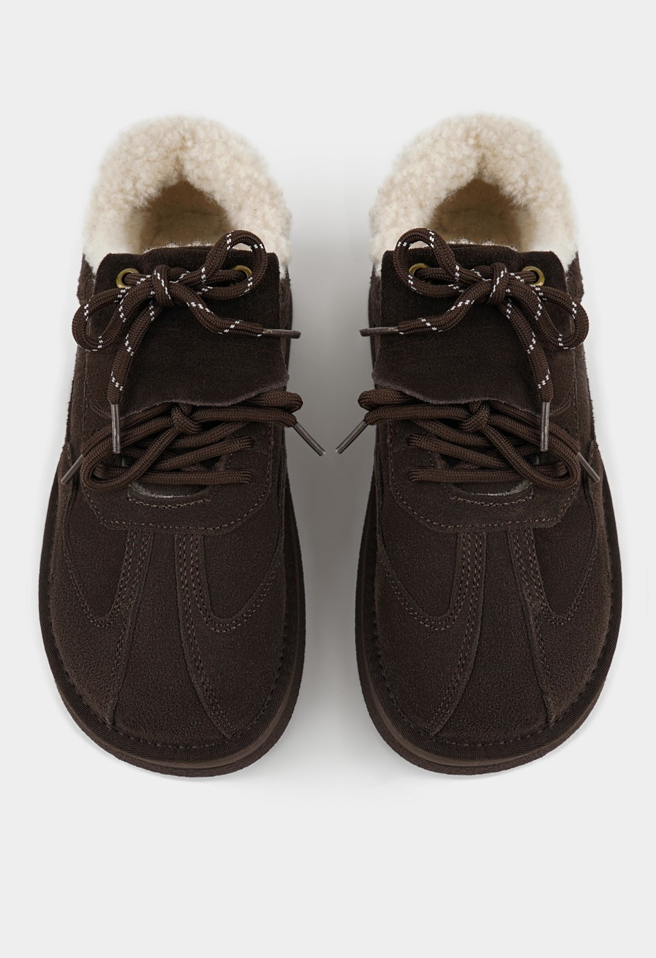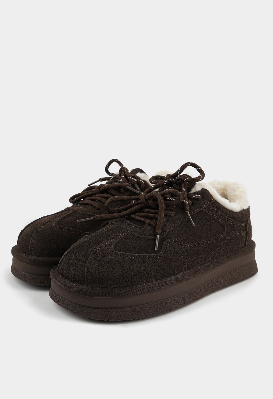 Актуальные полуботинки коричневого цвета станут стильным акцентом вашего зимнего гардероба, сочетая практичность и элегантность. Модель выполнена из мягкой натуральной замши, внутренняя отделка из натуральной шерсти обеспечивает комфорт и тепло в любую погоду. Жесткая подошва гарантирует устойчивость на разных поверхностях, округлый мысок делает обувь удобной для повседневной носки, а бронзовая фурнитура и аккуратная шнуровка добавляют утонченные детали в дизайн. Благодаря платформе шаг остается уверенным и легким, а образ – современным и гармоничным.