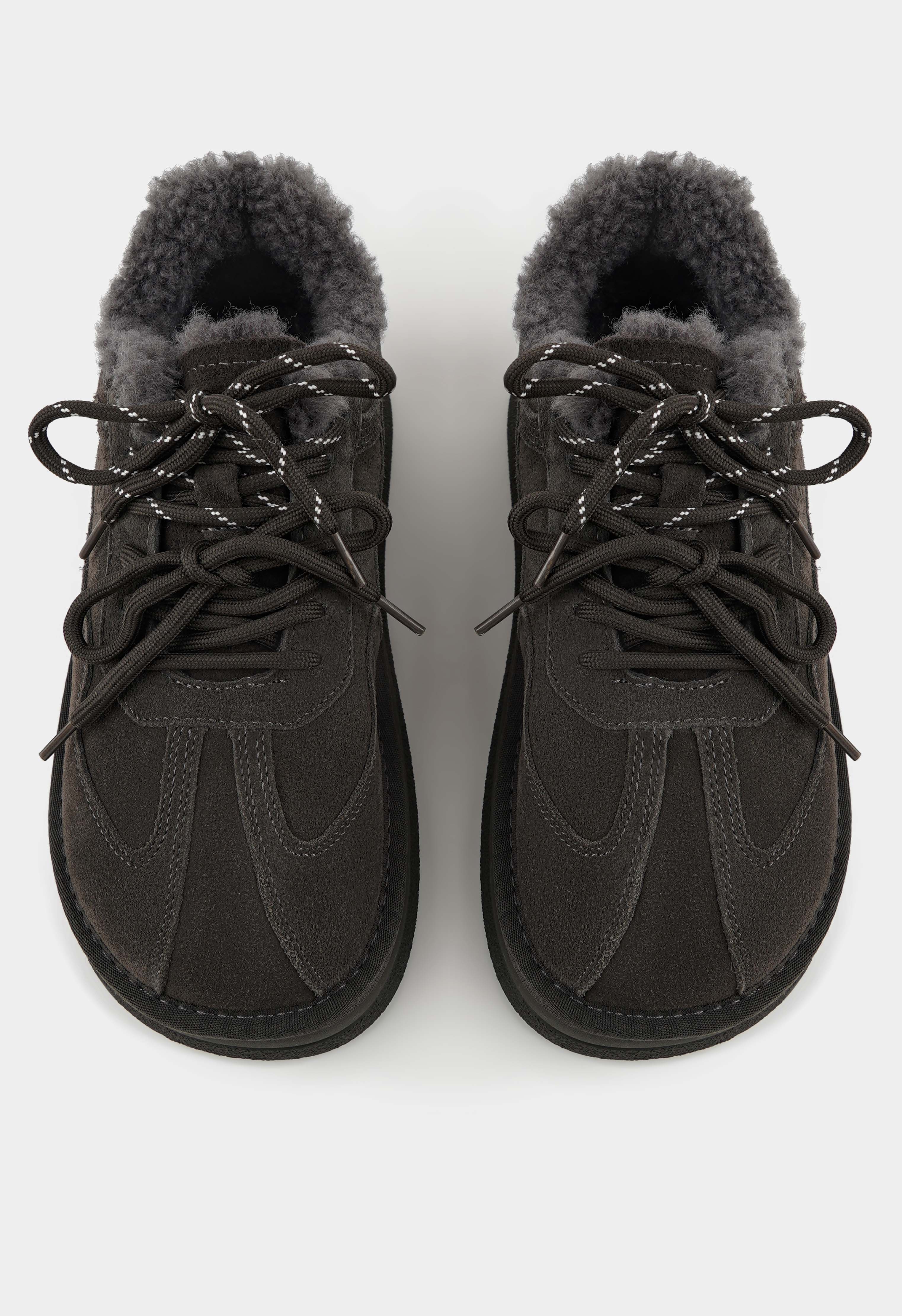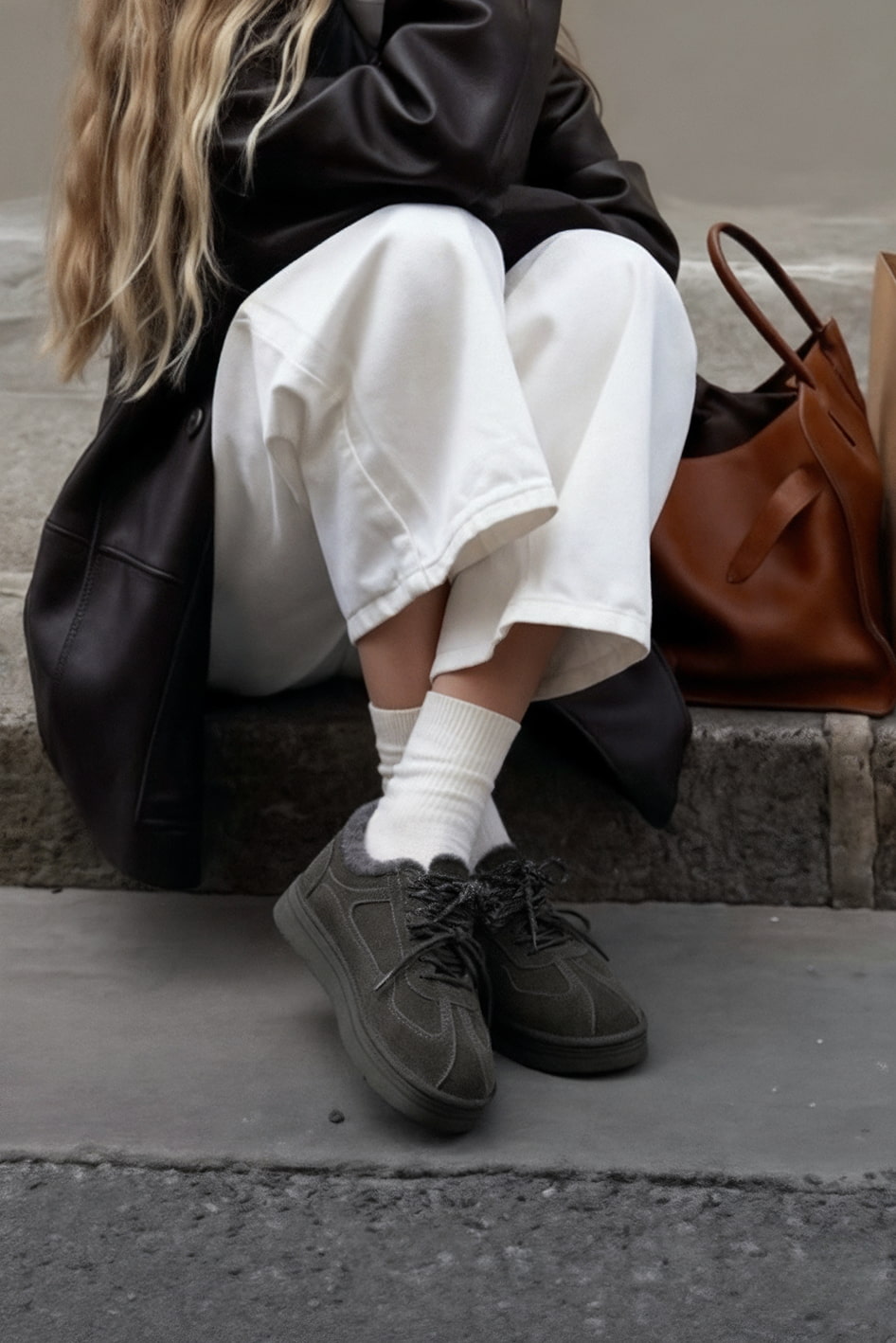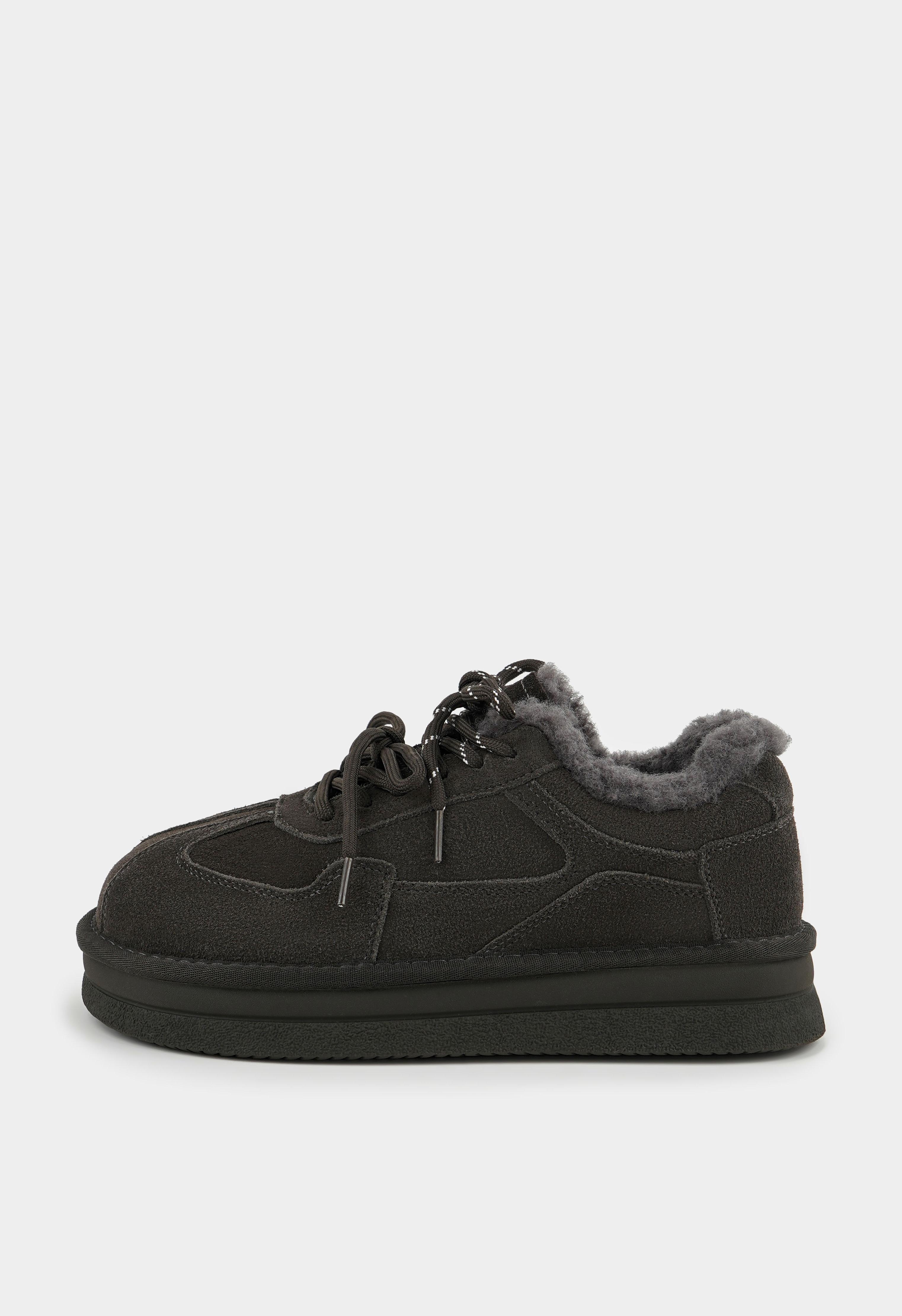 Актуальные полуботинки серого цвета станут стильным акцентом вашего зимнего гардероба, сочетая практичность и элегантность. Модель выполнена из мягкой натуральной замши, внутренняя отделка из натуральной шерсти обеспечивает комфорт и тепло в любую погоду. Жесткая подошва гарантирует устойчивость на разных поверхностях, округлый мысок делает обувь удобной для повседневной носки, а бронзовая фурнитура и аккуратная шнуровка добавляют утонченные детали в дизайн. Благодаря платформе шаг остается уверенным и легким, а образ – современным и гармоничным.