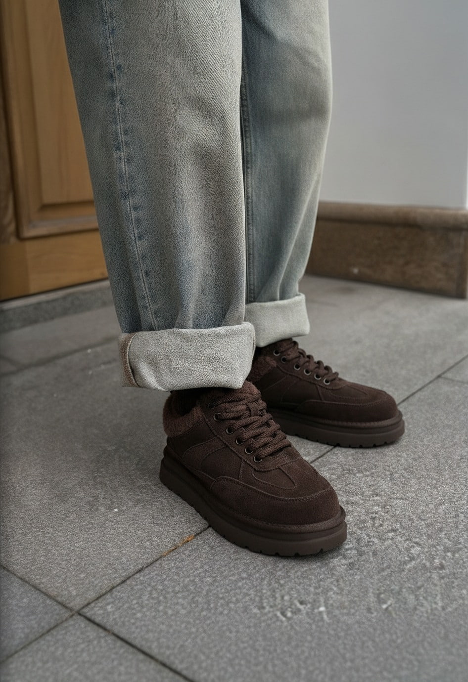 Кроссовки в коричневом цвете – идеальный вариант для тех, кто предпочитает практичную и стильную обувь на каждый день. Благодаря жесткой подошве модель отличается устойчивостью и долговечностью, а округлый мысок обеспечивает свободу движений и комфорт при ходьбе. Выполненные из мягкой натуральной замши, они выглядят изысканно и при этом отлично держат форму, в то время как внутренняя отделка из натуральной шерсти дарит тепло и уют даже в прохладную погоду. Удобная шнуровка позволяет точно регулировать посадку, коричневая фурнитура гармонично дополняет дизайн. Аккуратная платформа придает образу современное внешний вид и легкость.