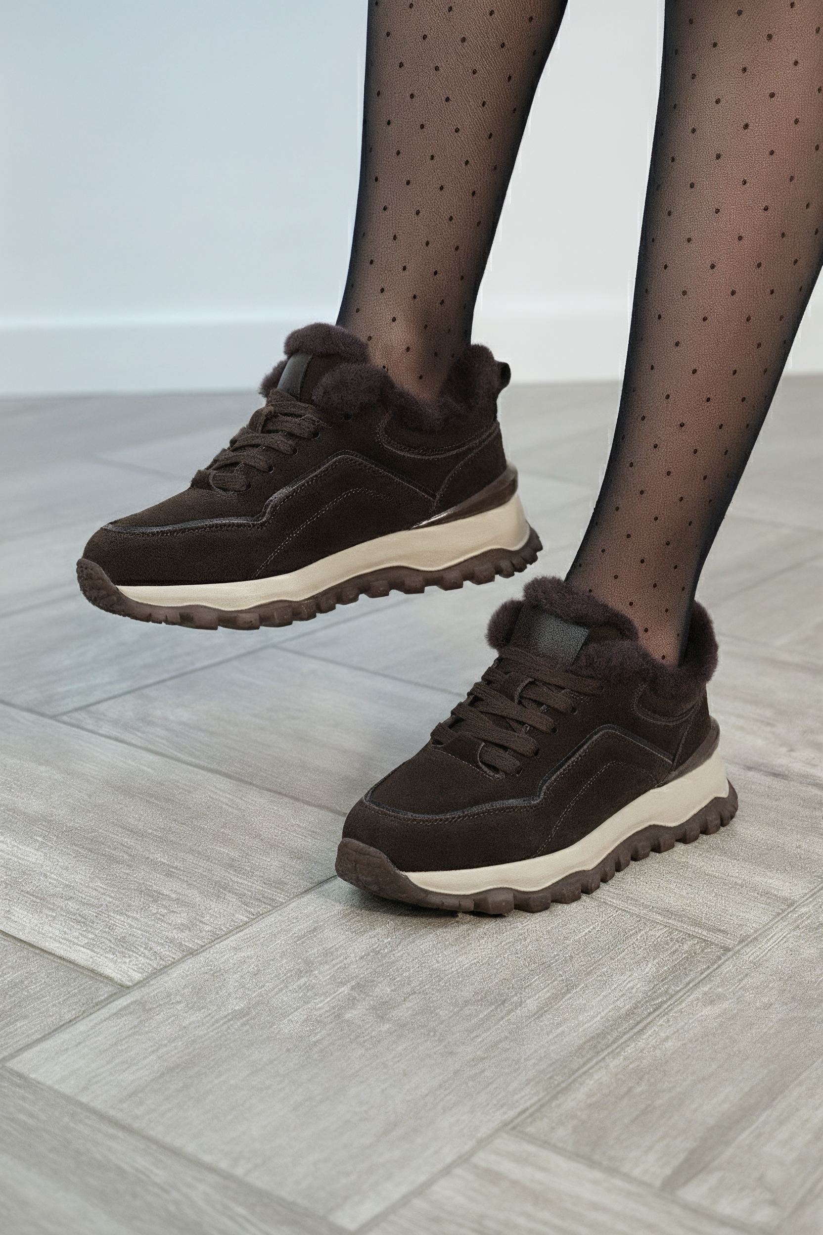 Базовые ботинки коричневого цвета – идеальный выбор для тех, кто ценит комфорт и лаконичный стиль в повседневной обуви. Натуральная замша придает модели мягкость и благородство, а внутренняя отделка из натуральной шерсти дарит тепло и уют в холодные зимние дни. Жесткая подошва обеспечивает устойчивость и надежность при ходьбе, округлый мысок делает обувь удобной, в то время как шнуровка позволяет легко подстроить посадку под ногу. Платформа добавляет легкий визуальный акцент и делает шаг уверенным, превращая эту модель в практичное и стильное дополнение к любому гардеробу.