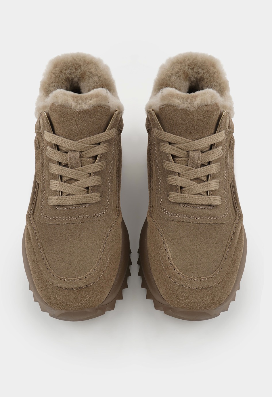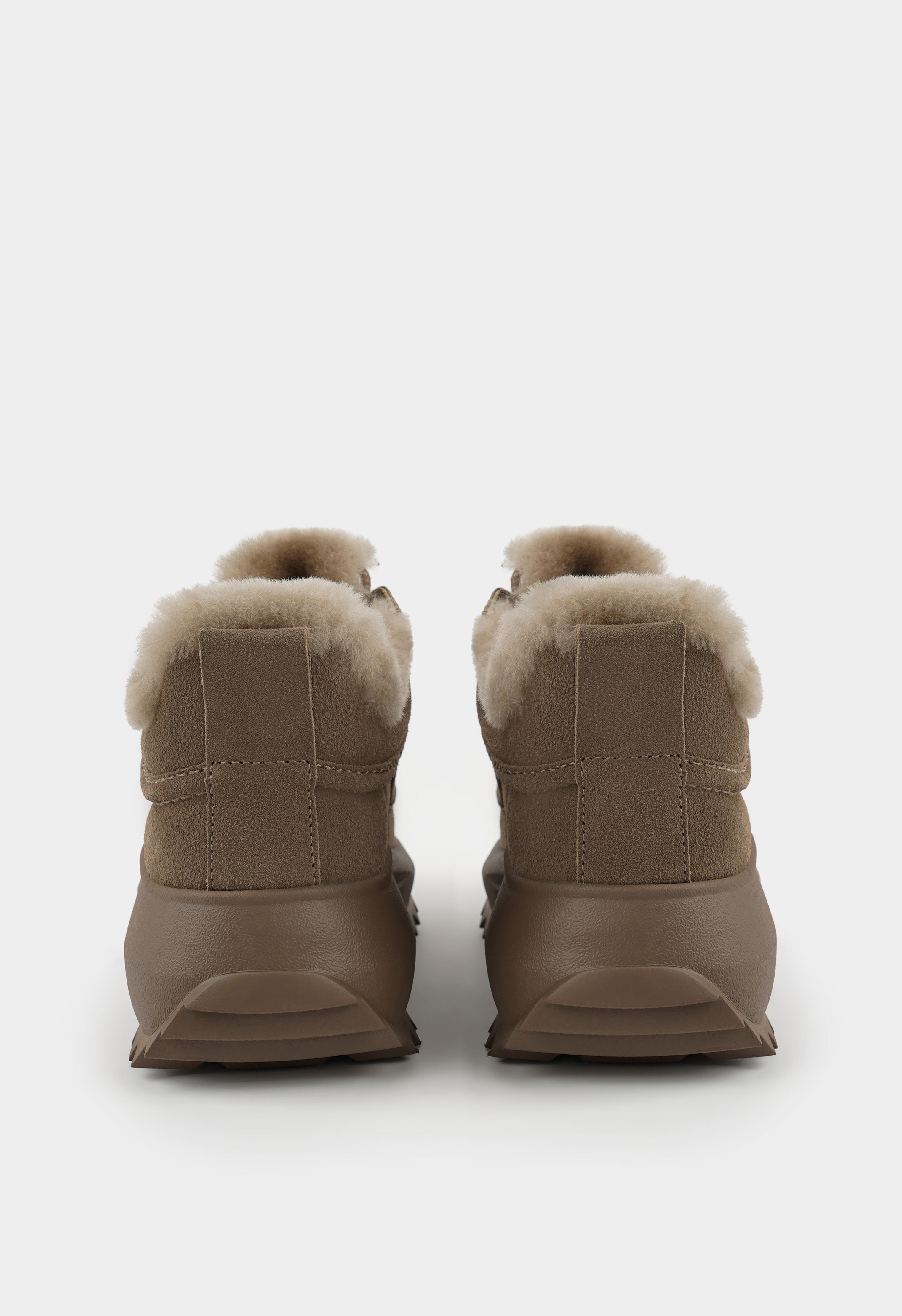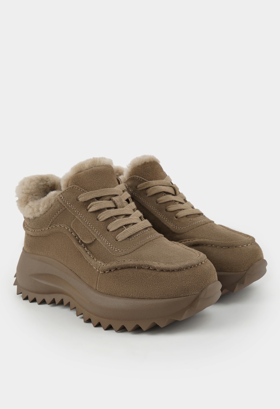 Ботинки коричневого цвета – стильное решение для тех, кто ищет баланс между комфортом и современным дизайном. Верх из натуральной замши выглядит утонченно и легко сочетается с повседневными образами, в то время как подкладка из натуральной шерсти обеспечивает мягкость и тепло в прохладную погоду. Жесткая подошва делает шаг устойчивым, округлый мысок способствует удобной посадке, а шнуровка добавляет функциональности и подчеркивает повседневный силуэт. Платформа придает модели выразительность, создавая обувь, которая сочетает практичность и элегантный стиль.