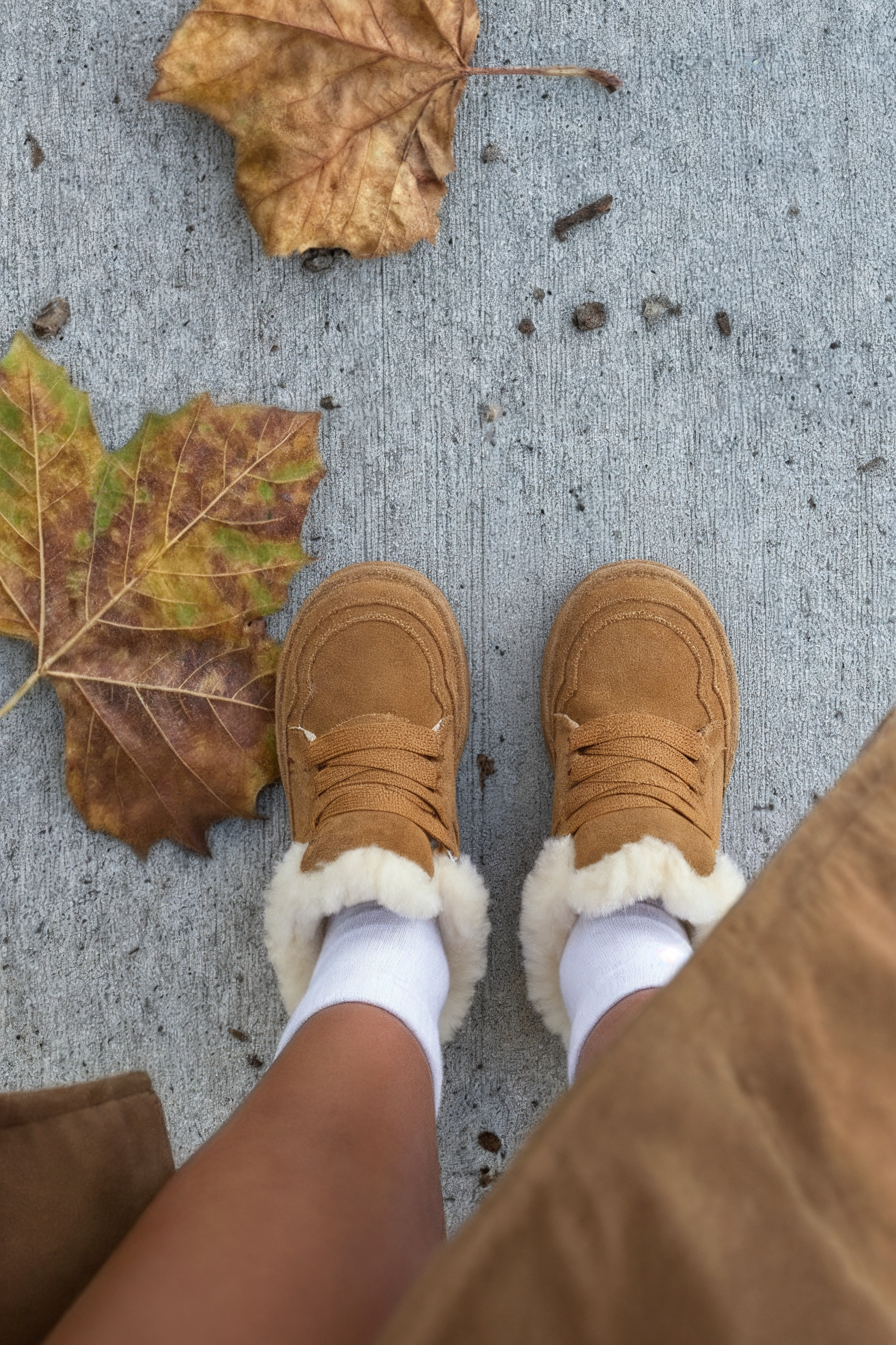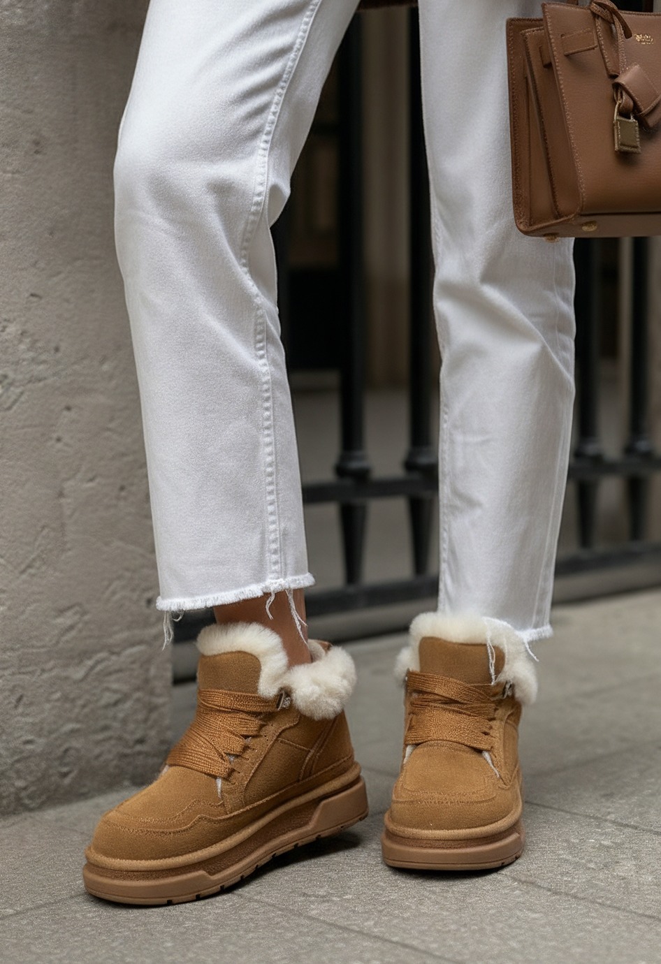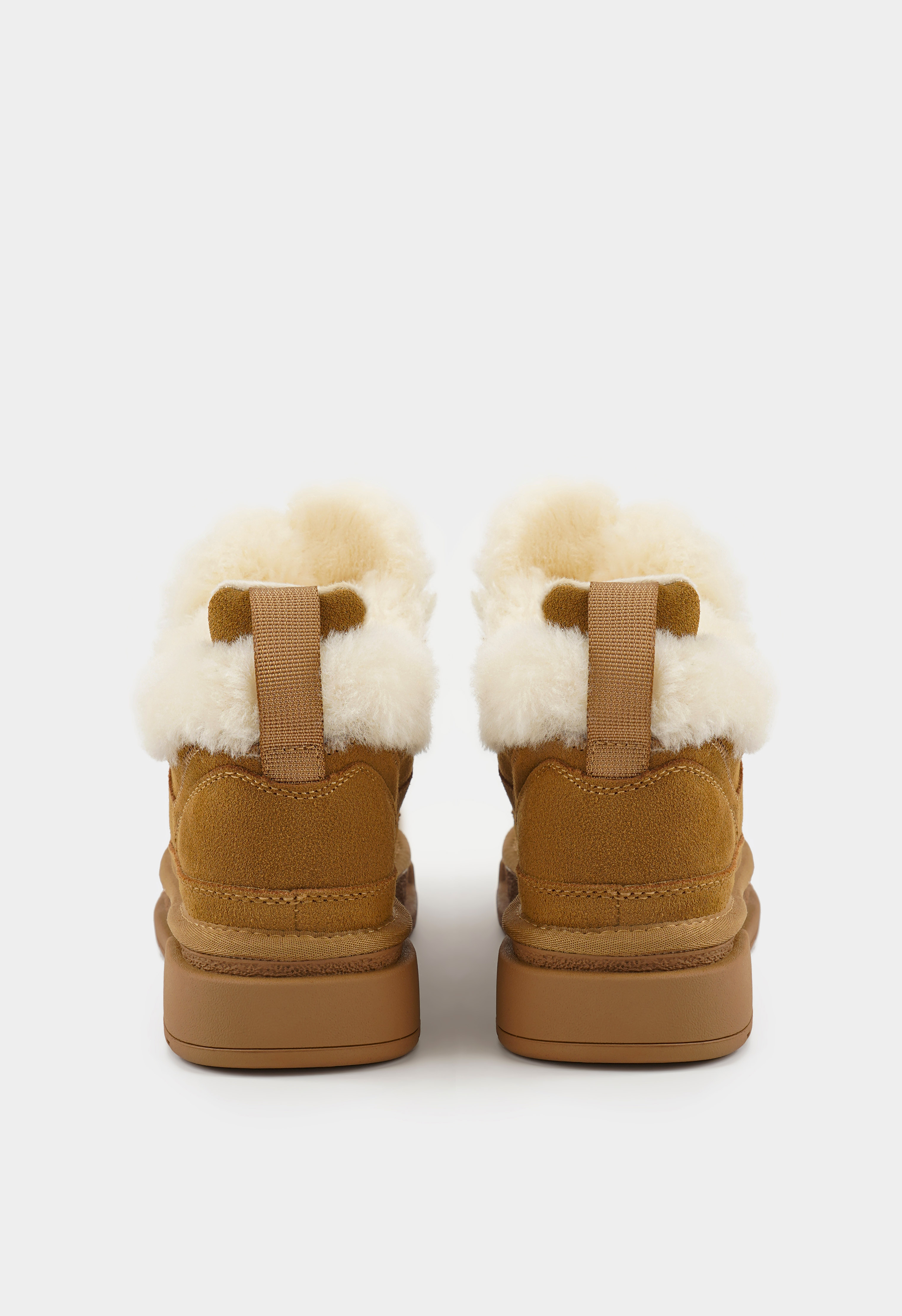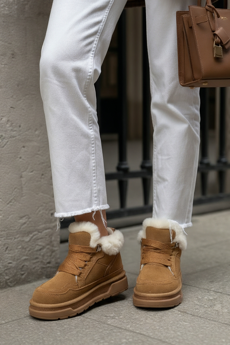 Универсальные ботинки в рыжем цвете станут надежным и стильным решением для холодного сезона. Верх выполнен из мягкой натуральной замши, которая подчеркивает практичность модели, внутренняя отделка из натуральной шерсти обеспечивает уют и комфорт при любой погоде. Жесткая подошва гарантирует устойчивость, округлый мысок делает обувь удобной для длительной носки, аккуратная шнуровка позволяет подогнать обувь по ноге, а серебряная фурнитура добавляет утонченный блеск. Платформа придает шагу легкость и уверенность, создавая гармоничное сочетание практичности и современного стиля.