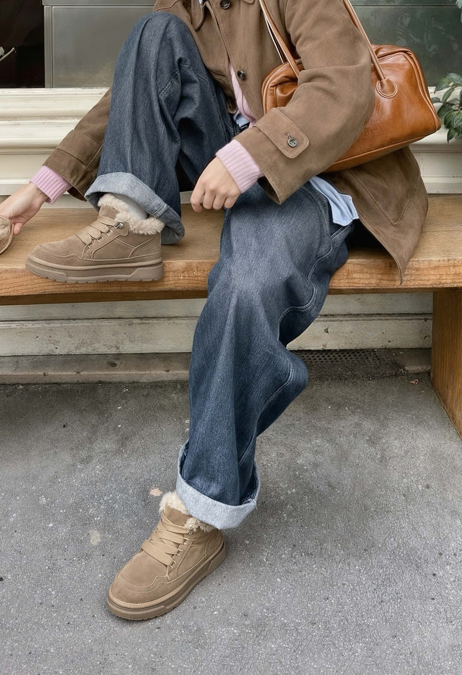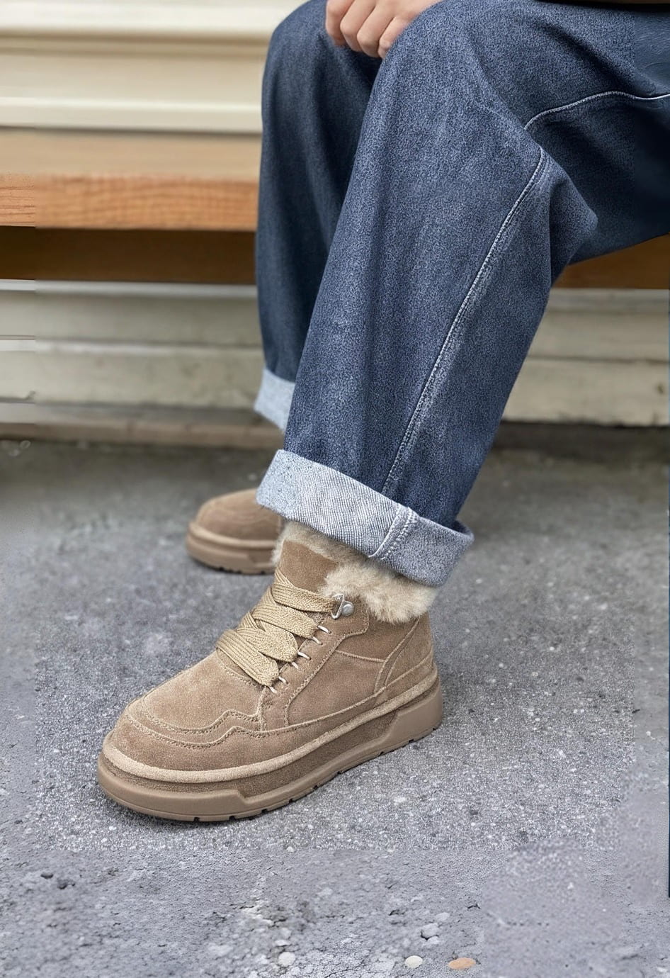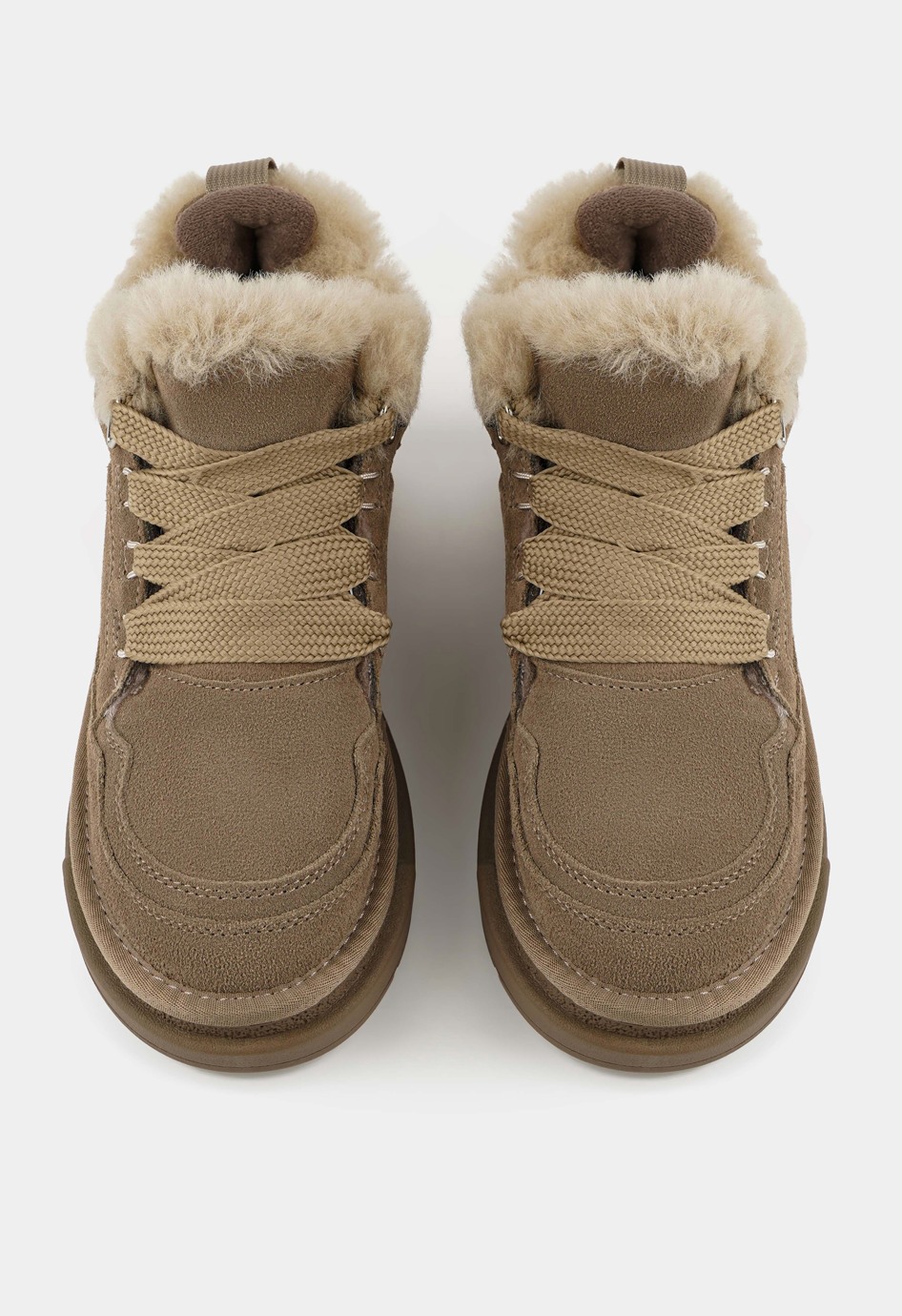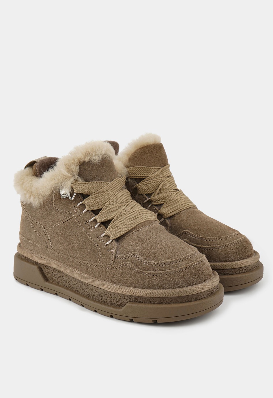 Универсальные ботинки в сером цвете станут надежным и стильным решением для холодного сезона. Верх выполнен из мягкой натуральной замши, которая подчеркивает практичность модели, внутренняя отделка из натуральной шерсти обеспечивает уют и комфорт при любой погоде. Жесткая подошва гарантирует устойчивость, округлый мысок делает обувь удобной для длительной носки, аккуратная шнуровка позволяет подогнать обувь по ноге, а серебряная фурнитура добавляет утонченный блеск. Платформа придает шагу легкость и уверенность, создавая гармоничное сочетание практичности и современного стиля.