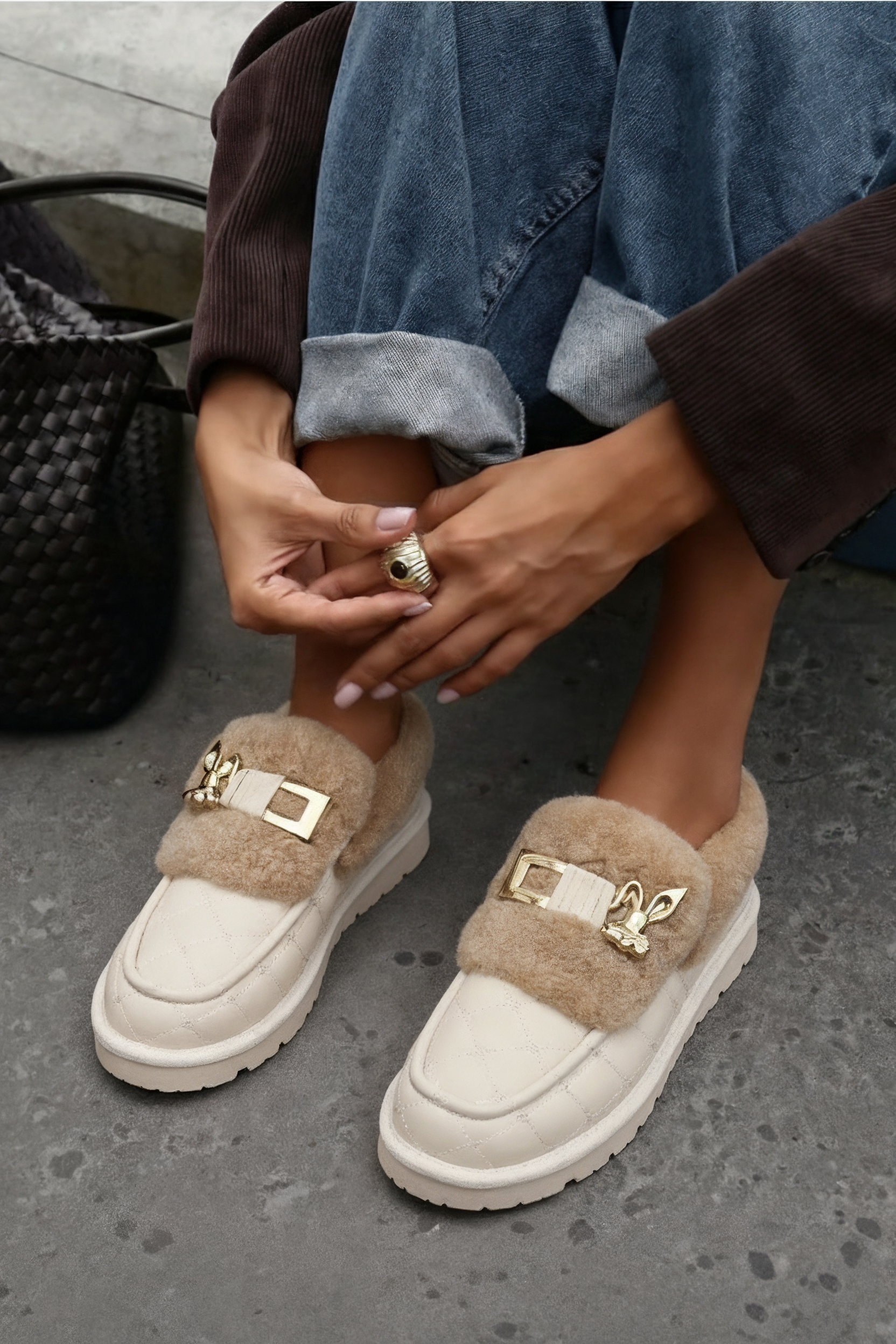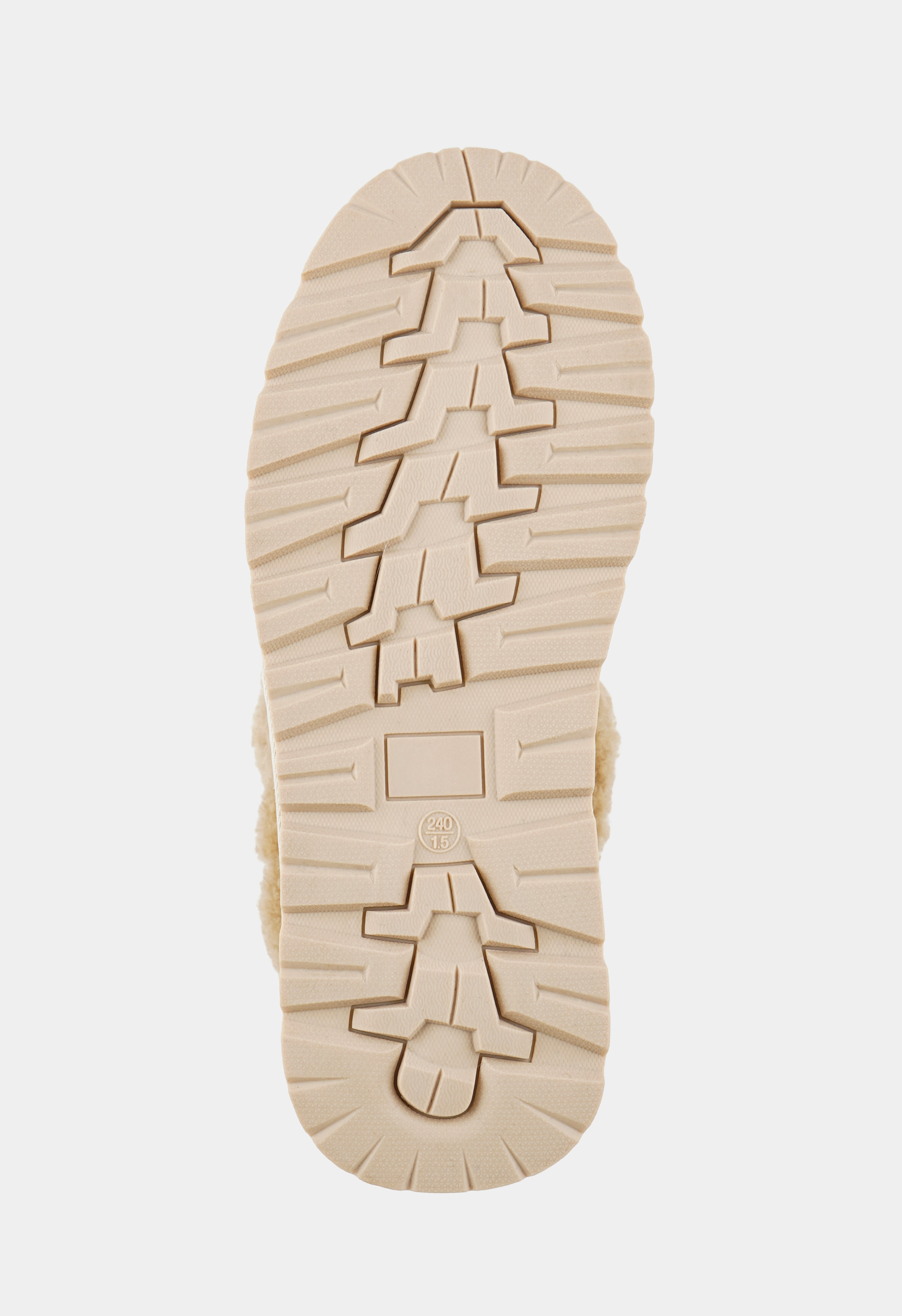 Современные угги молочного цвета – стильная и практичная пара, которая станет универсальным элементом вашего гардероба. Изготовленные из натуральной кожи, они отличаются прочностью и элегантным внешним видом, мягкая внутренняя отделка из натуральной шерсти поддерживает комфорт и тепло в любую погоду. Гибкая подошва подстраивается под движения стопы, обеспечивая легкость и устойчивость при ходьбе. Округлый мысок делает обувь удобной для повседневной носки, в то время как изящная золотая фурнитура добавляет нотку утонченности. Платформа придает модели современный характер и легко дополняет как классические, так и базовые образы.