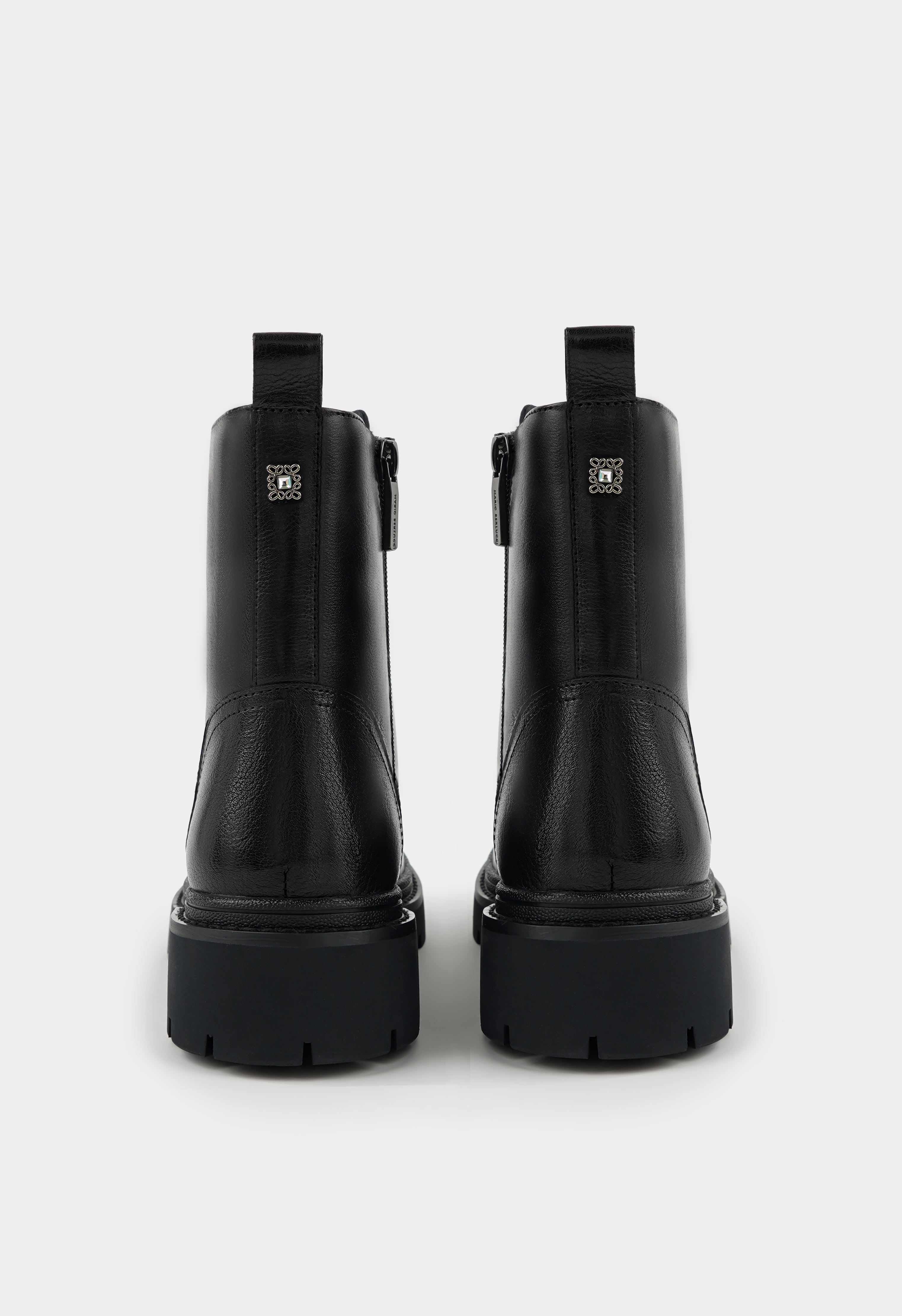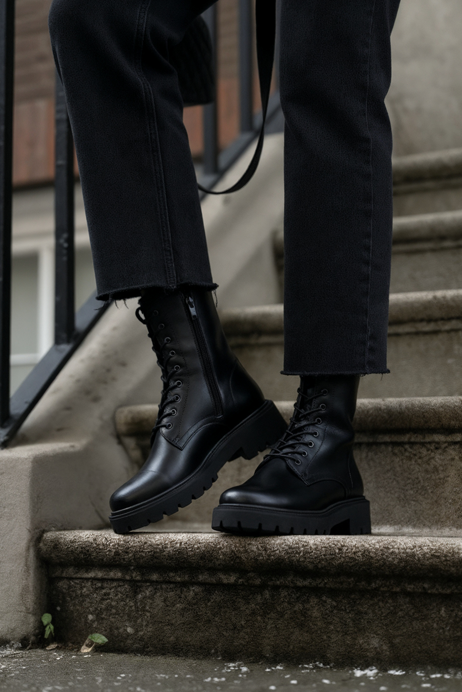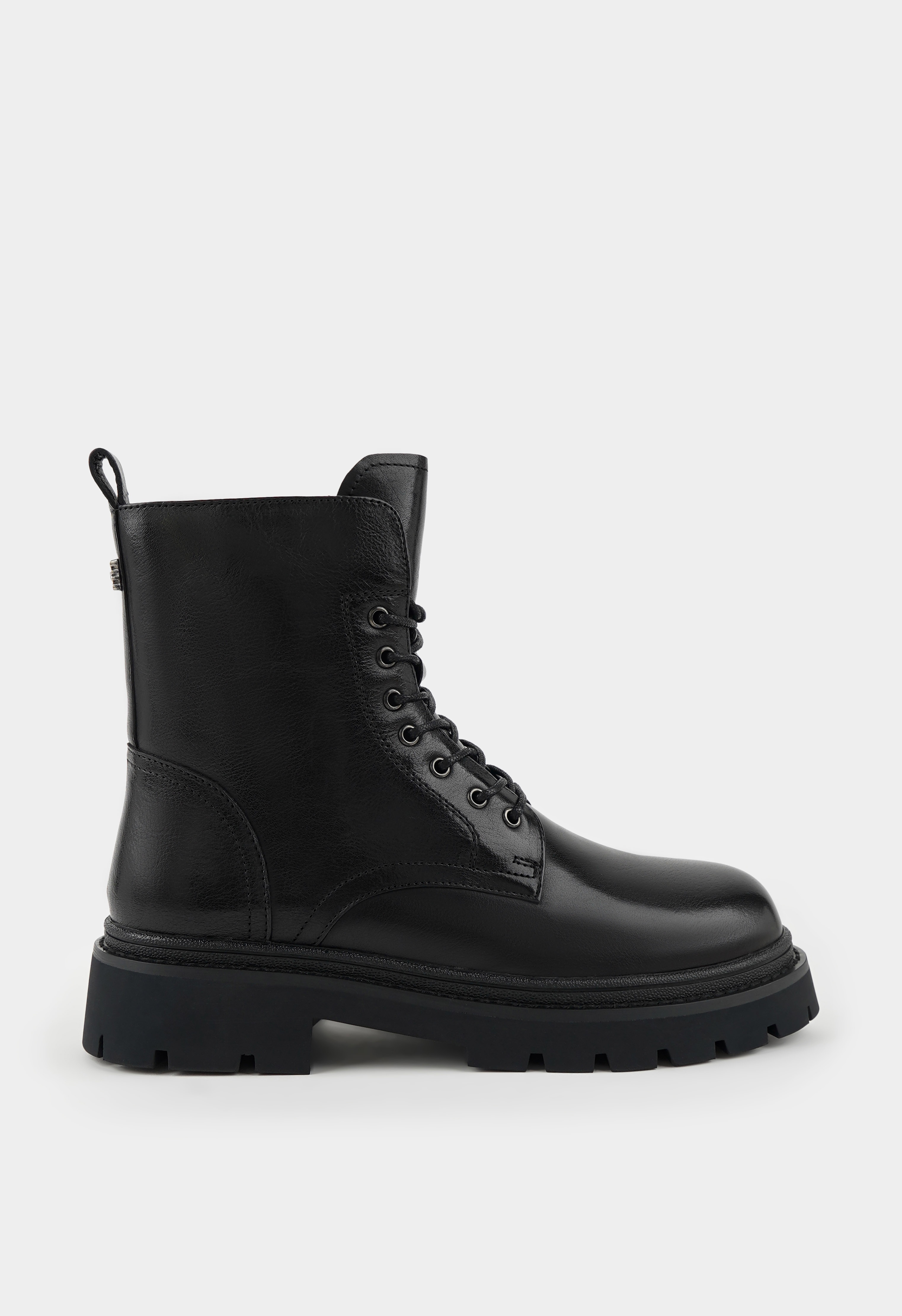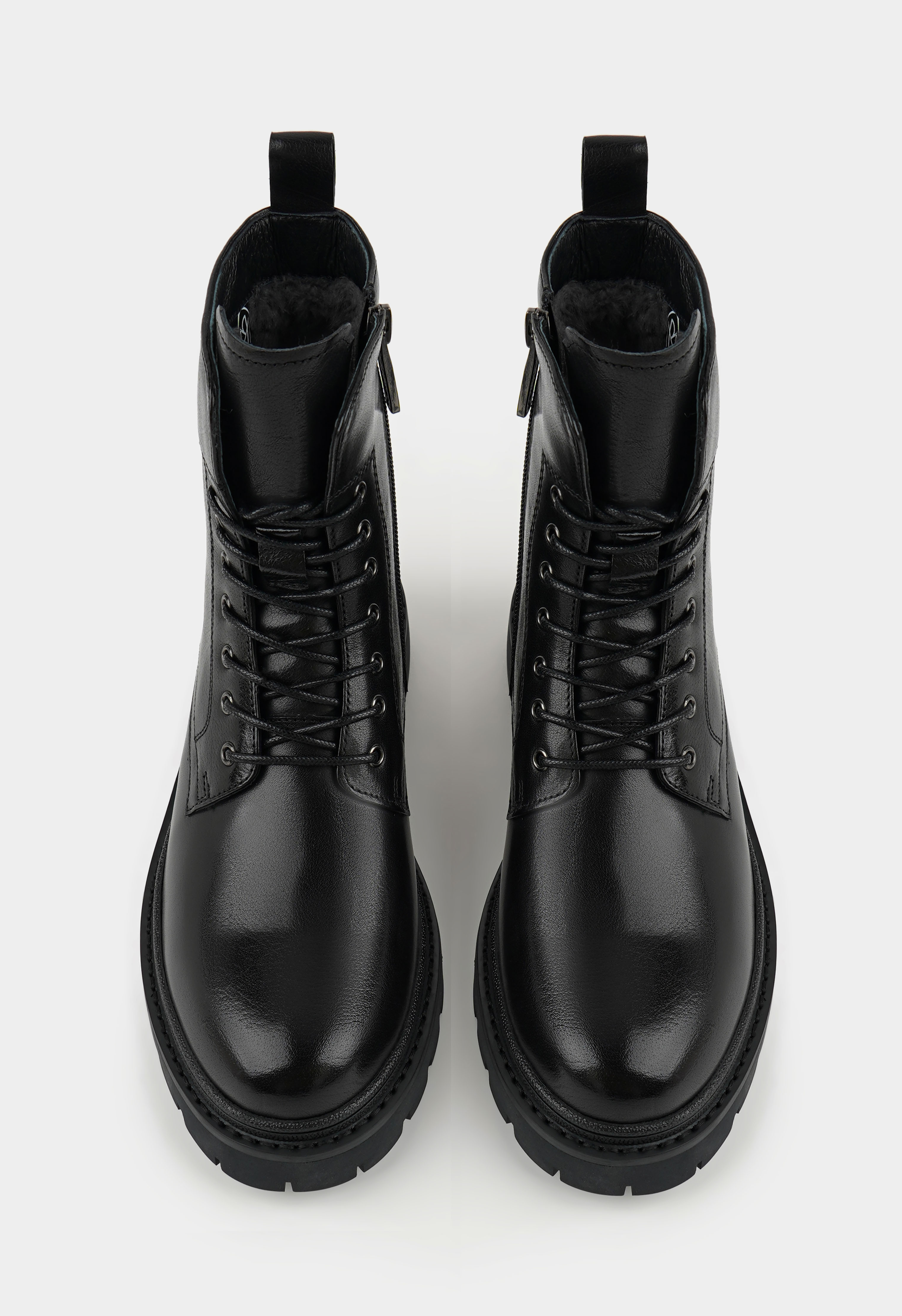 Ботинки черного цвета – современное решение для тех, кто ценит надежность, комфорт и выразительный дизайн. Модель украшена сочетанием серебряной и металлической фурнитуры, что придает ей стильный, немного брутальный характер. Широкий каблук обеспечивает устойчивость, жесткая подошва – уверенность в каждом шаге, а округлый мысок делает обувь удобной при длительной носке. Выполненные из прочной натуральной кожи снаружи и дополненные теплым натуральным мехом внутри, ботинки гарантируют комфорт в холодный сезон. Молния и шнуровка позволяют легко регулировать посадку и обеспечивают удобство при ежедневном использовании.