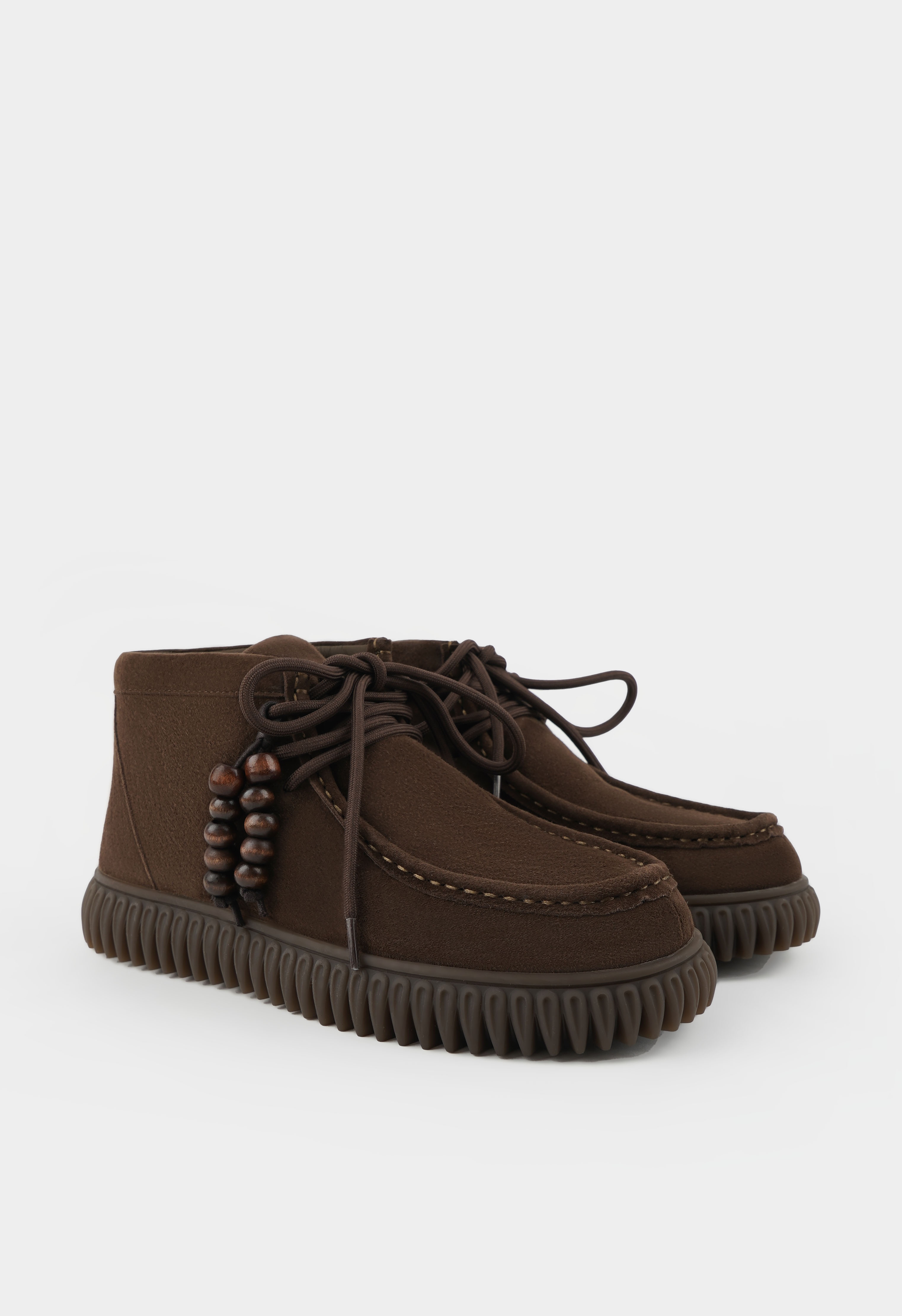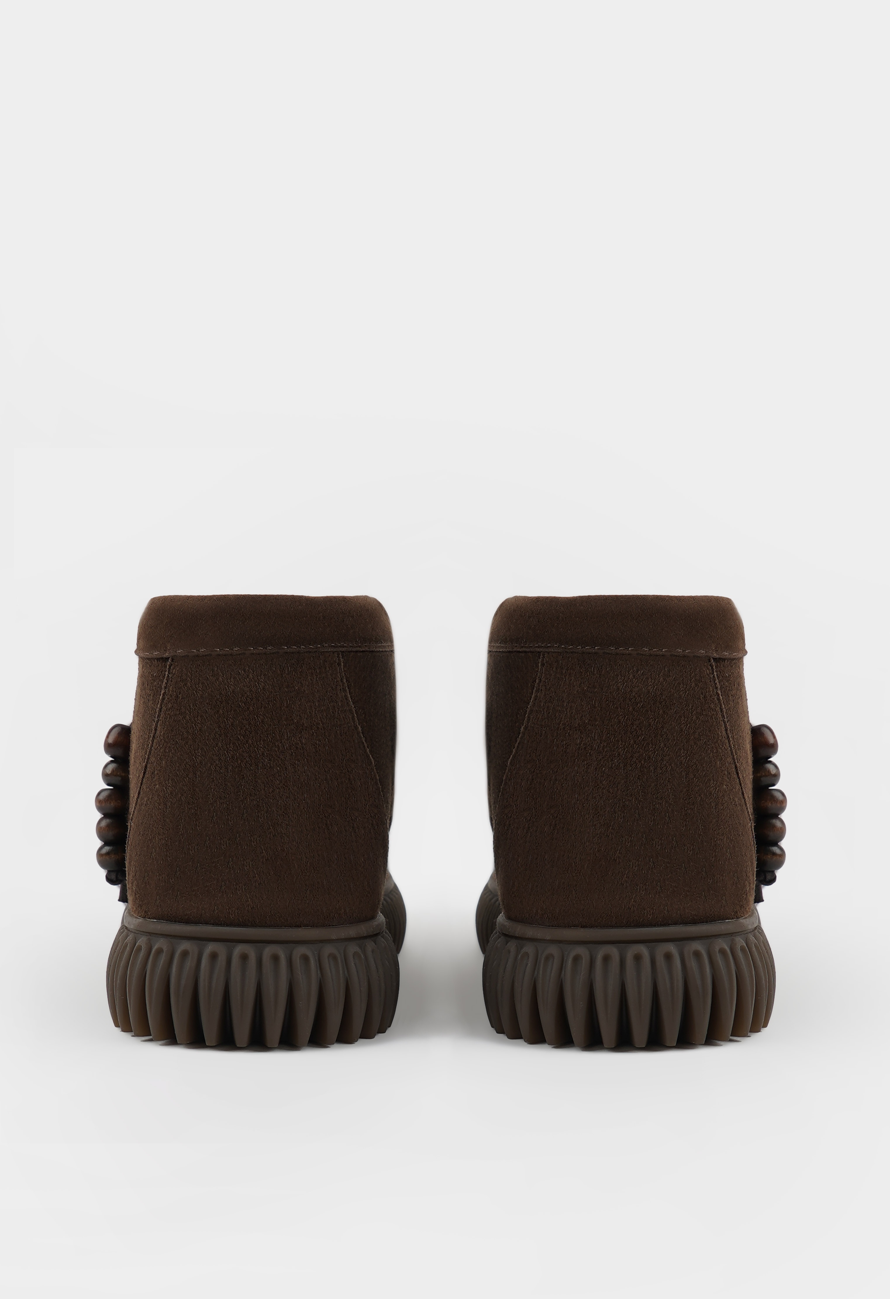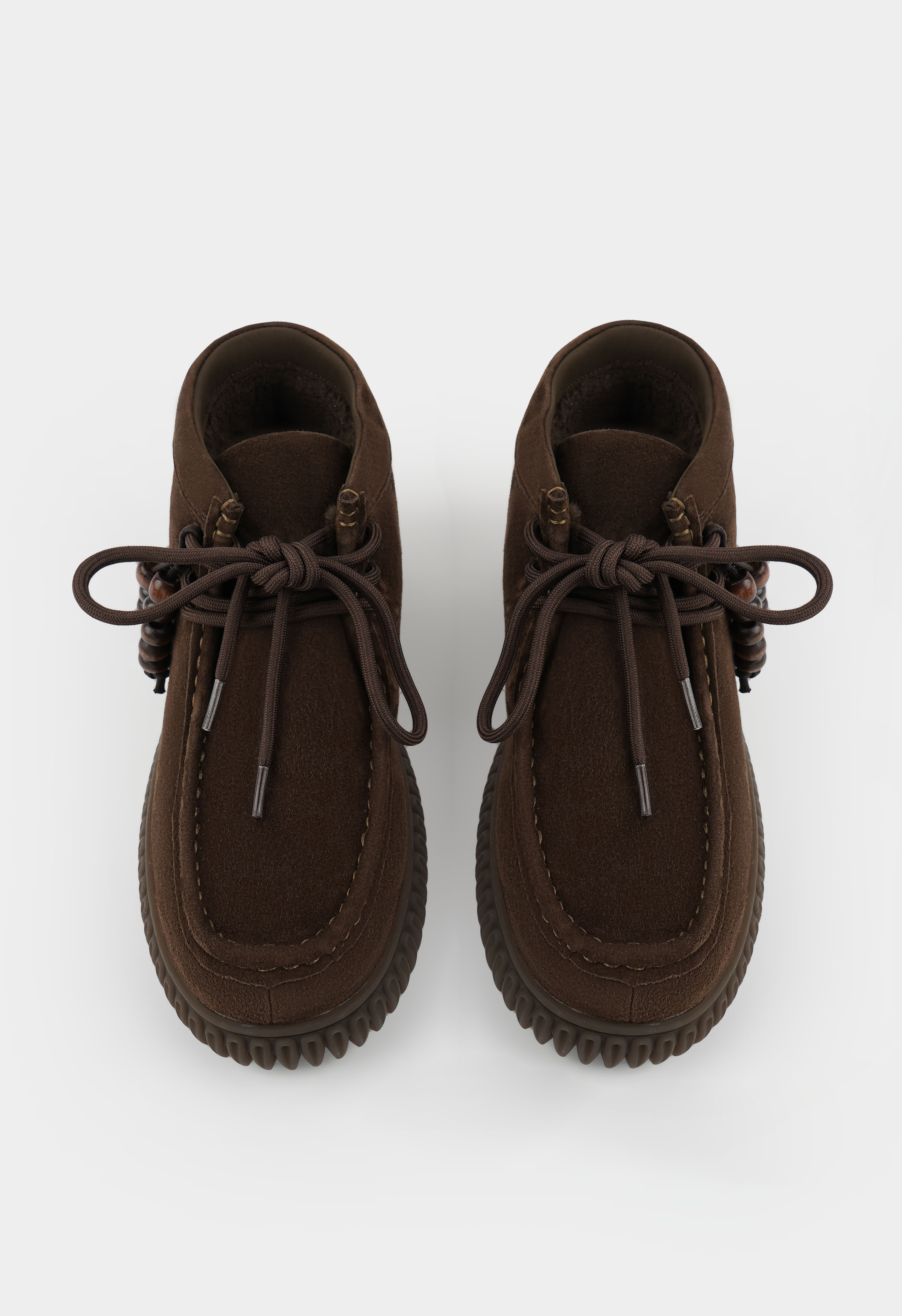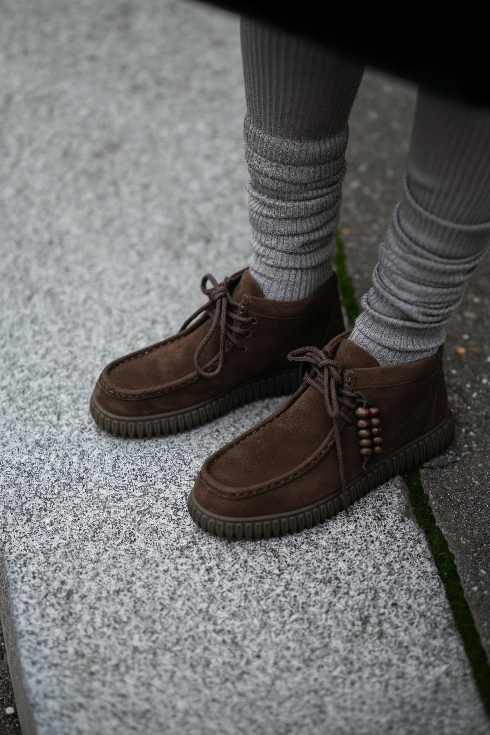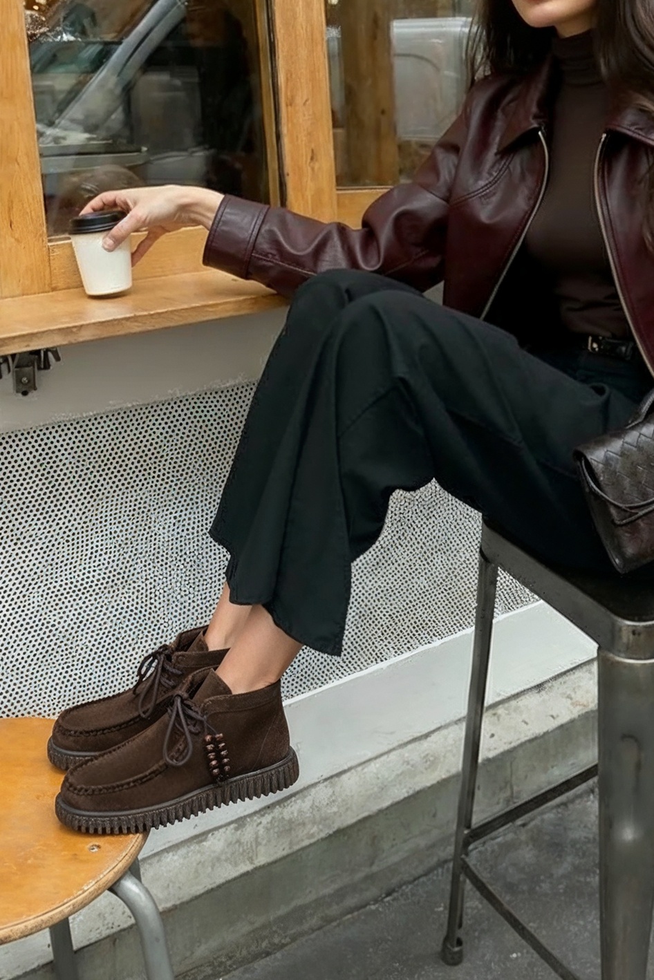 Коричневые полуботинки из роскошной натуральной замши с акцентной платформой и классической шнуровкой создают выразительный образ для холодного сезона, где элегантность встречается с функциональностью. Жесткая подошва обеспечивает надежную устойчивость на зимних улицах, а подкладка из натурального меха дарит исключительное тепло даже в лютые морозы. Мягкий округлый мысок добавляет образу классической утонченности, делая эти полуботинки идеальным выбором для городской зимы.