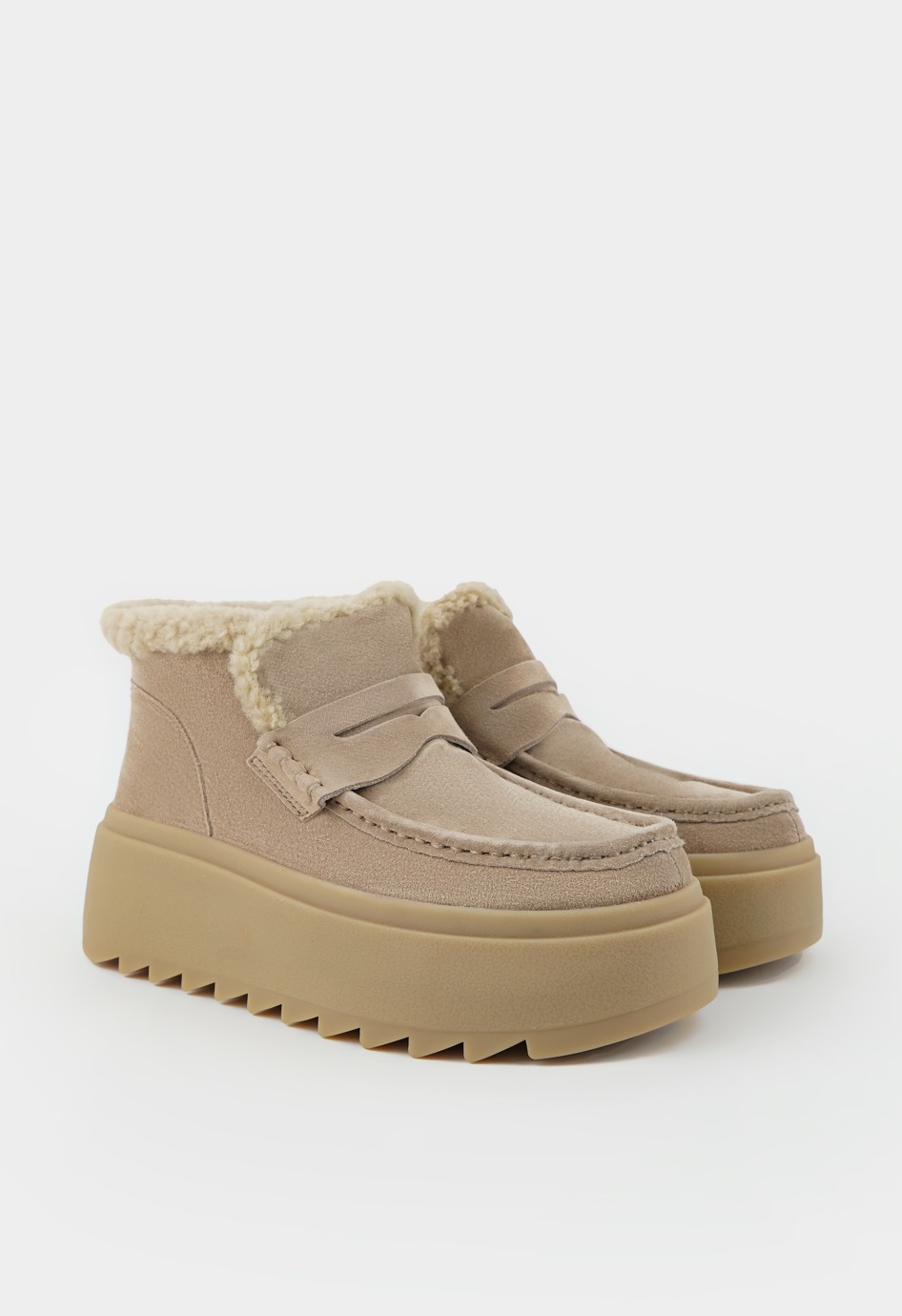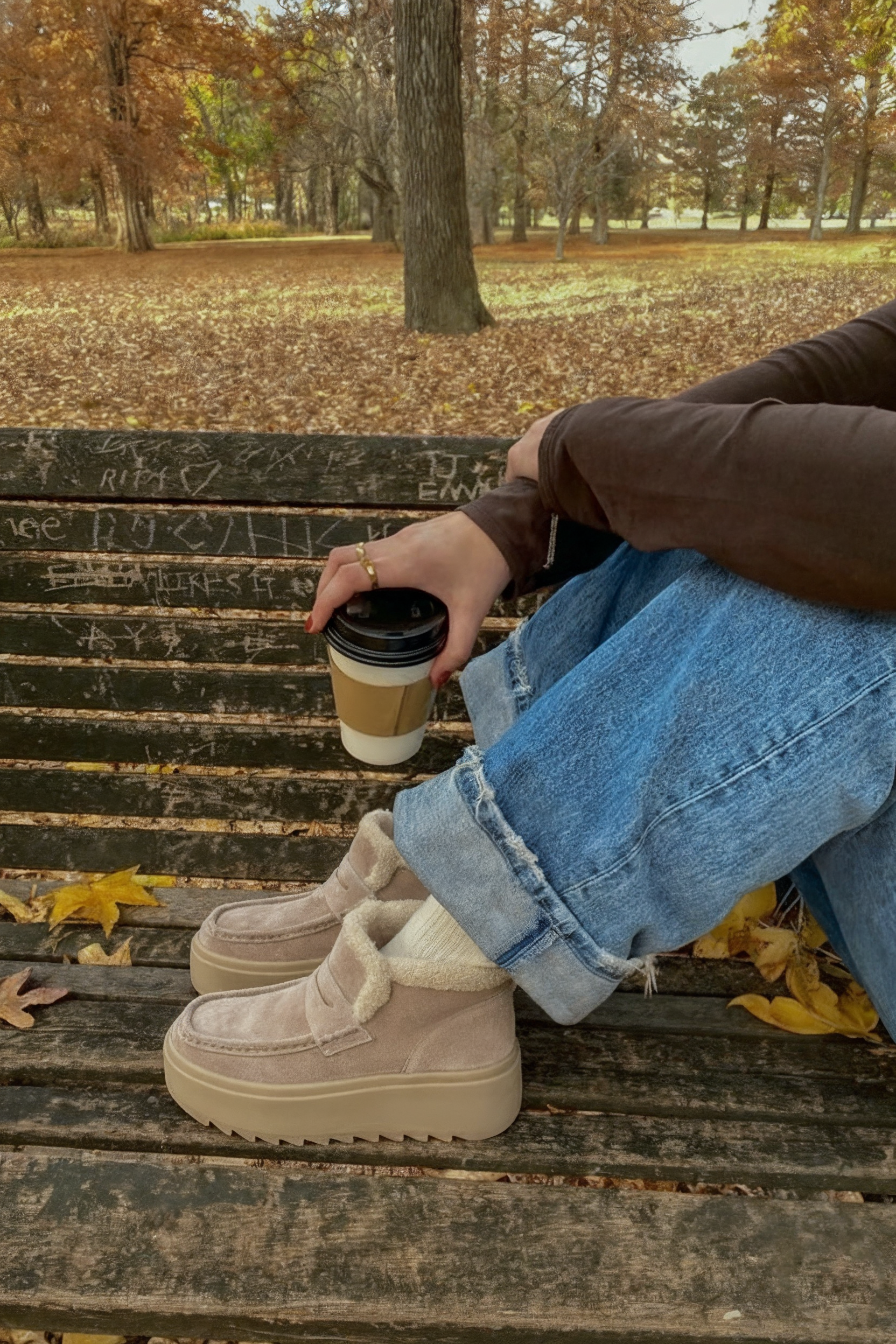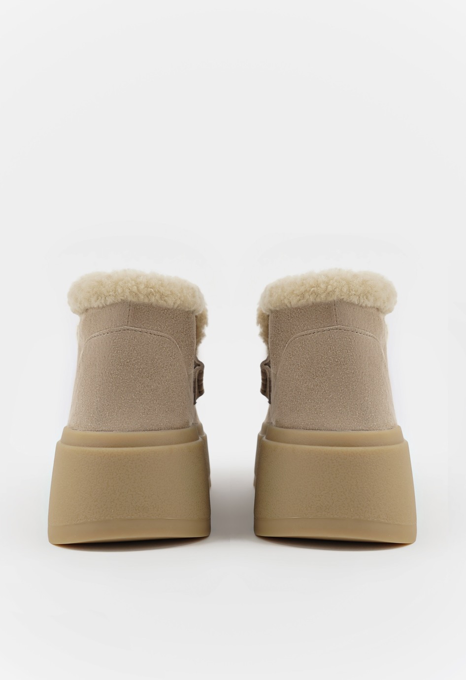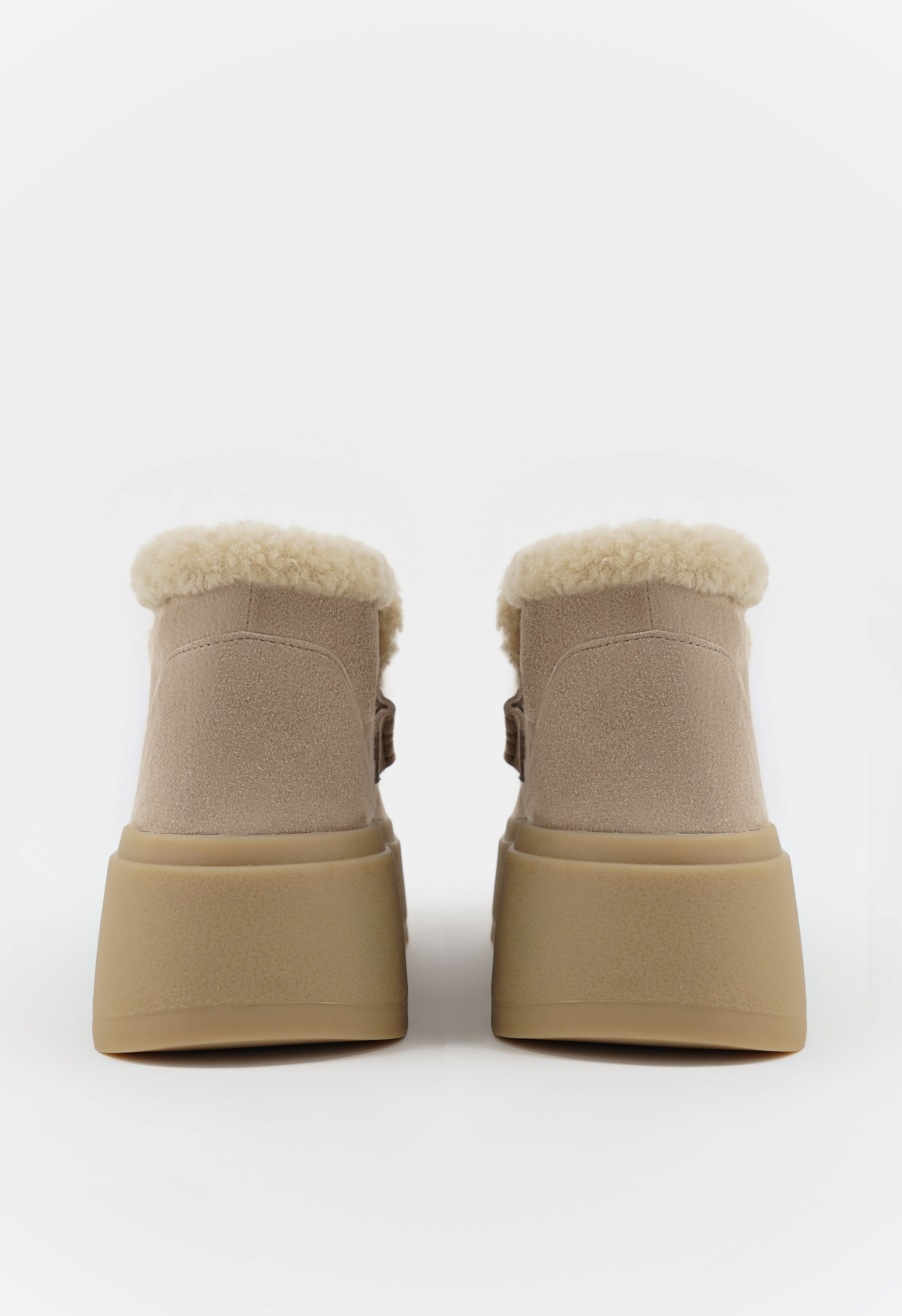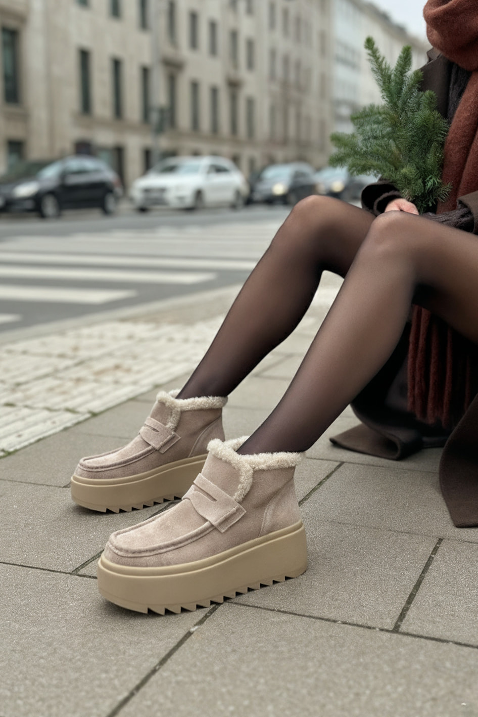 Идеальные ботинки для сурового сезона, созданные из роскошной бежевой замши с утеплением натуральным мехом, где каждая деталь подчинена гармонии комфорта и стиля: массивная платформа и жесткая подошва обеспечивают внушительную устойчивость на зимних улицах, а элегантный округлый мысок и аккуратные втачные резинки формируют изящный силуэт и идеальную посадку. Модель демонстрирует продуманную эстетику – теплое внутреннее покрытие становится надежной защитой от мороза, а благородный материал и лаконичный дизайн превращают эти ботинки в универсального спутника для повседневной носки, легко сочетаясь с трендовыми образами.