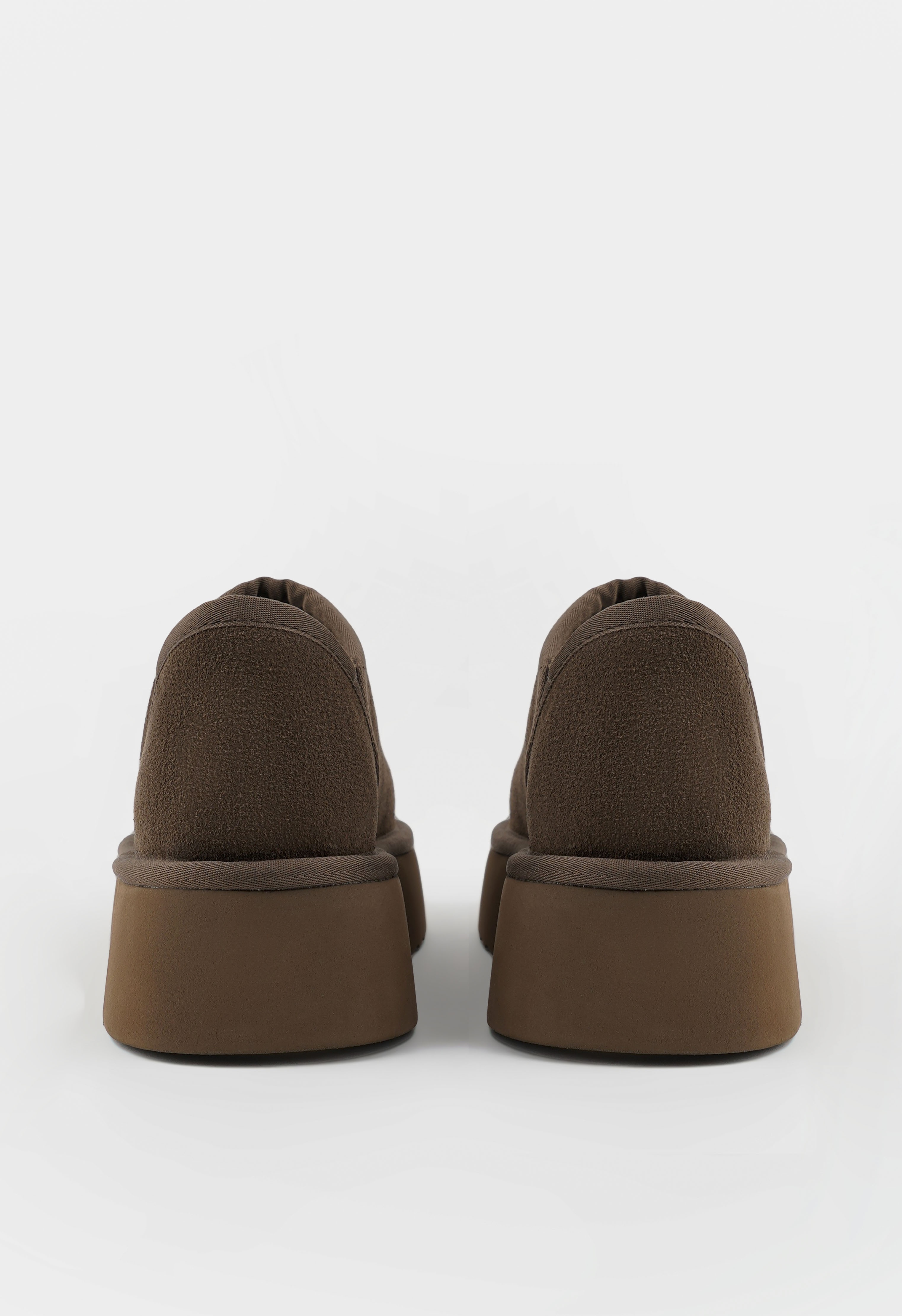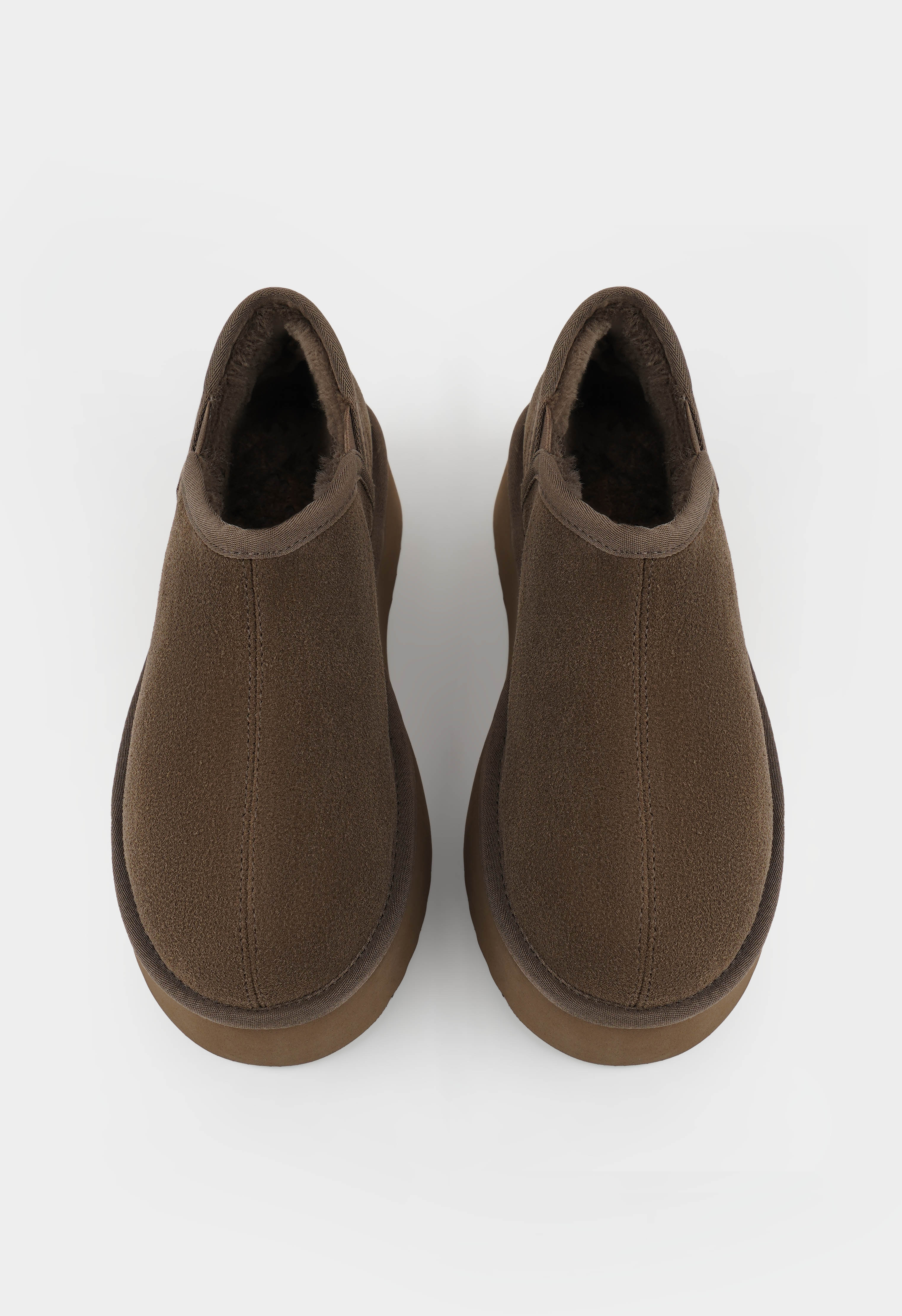 Стильные полуботинки в цвете хаки из благородной натуральной замши с выразительной платформой создают удачный образ для холодного сезона – в них сочетаются уютная функциональность и современная эстетика. Жесткая подошва обеспечивает надежную устойчивость на зимних улицах, а плотный натуральный мех внутри дарит исключительное тепло даже в сильные морозы. Элегантный округлый мысок и аккуратные втачные резинки формируют лаконичный силуэт и комфортную посадку, делая эту модель универсальным выбором для повседневной носки.