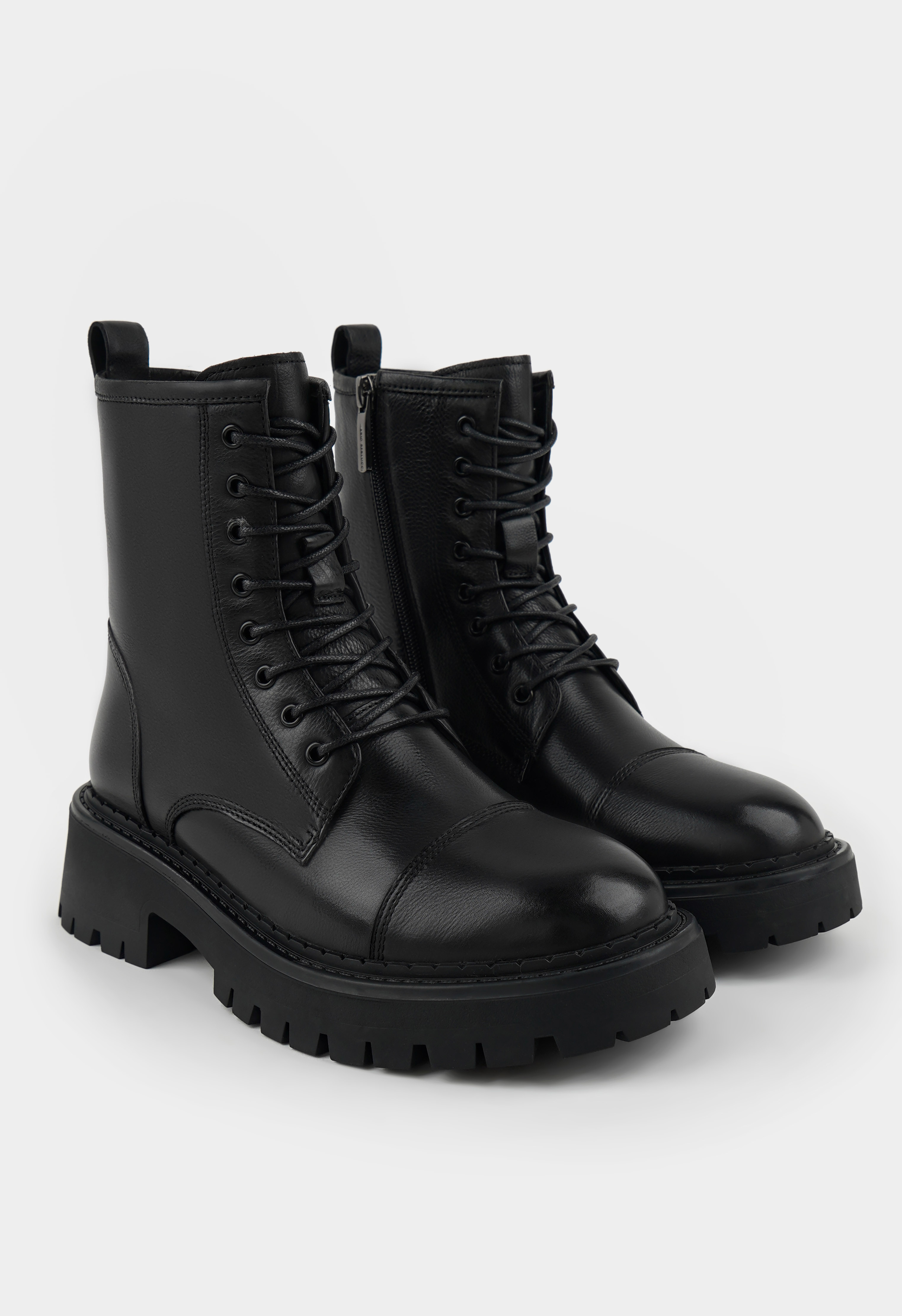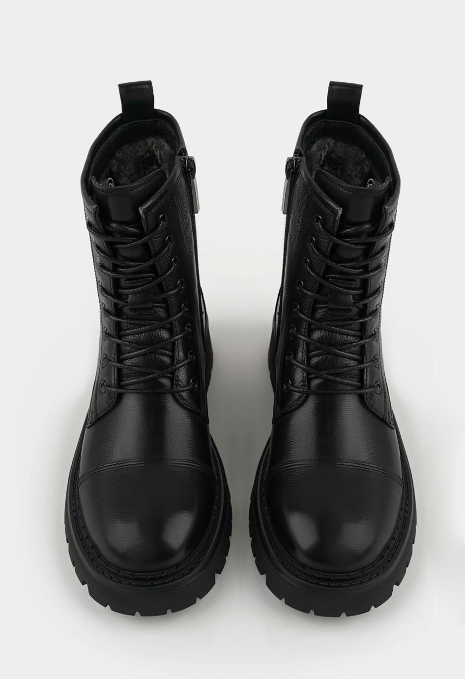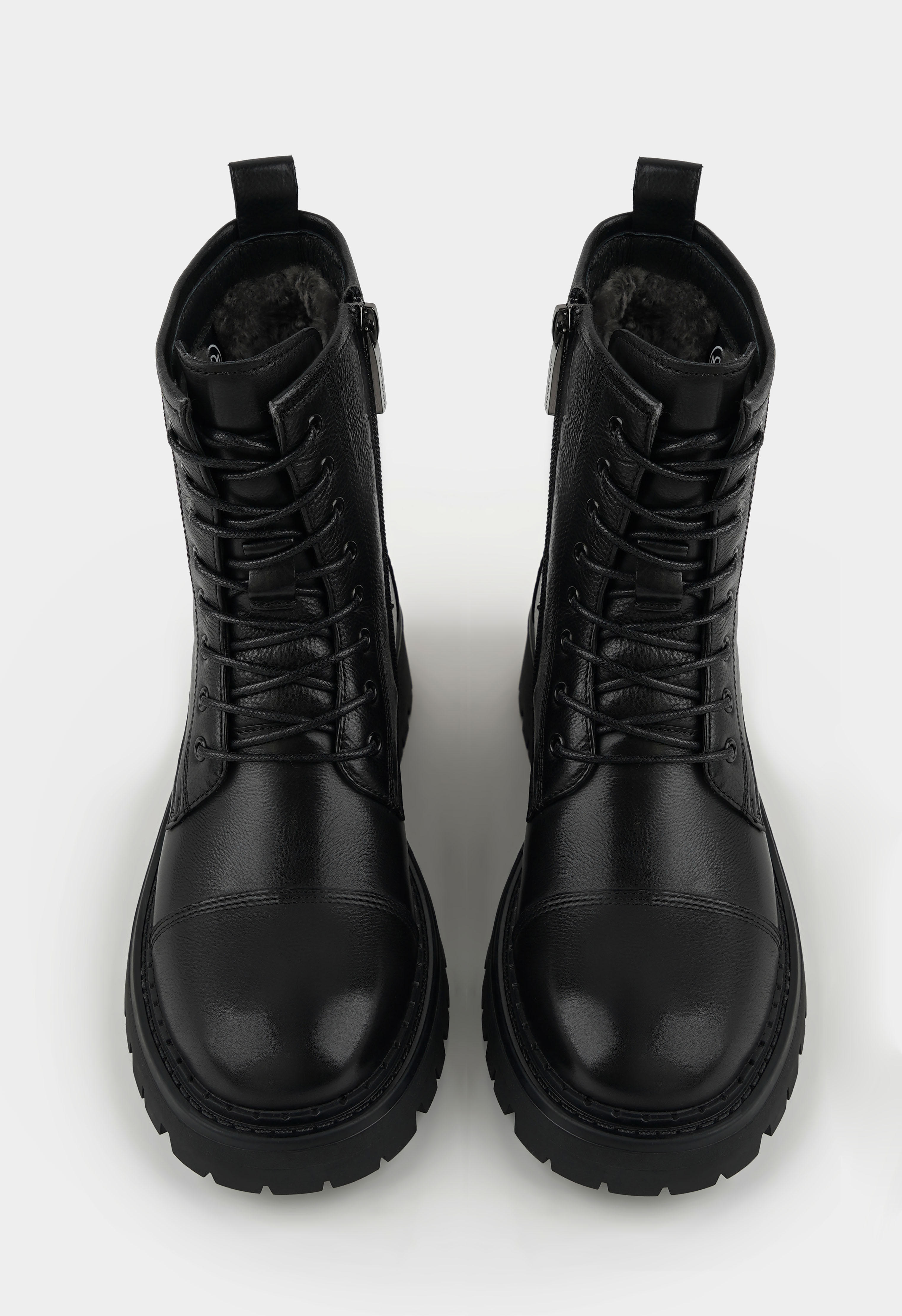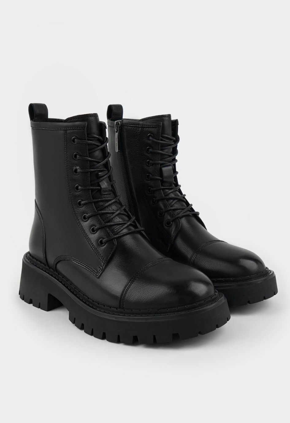 Актуальные ботинки черного цвета – универсальная модель для тех, кто ценит комфорт и уверенность в движении. Натуральная кожа придает обуви аккуратный внешний вид и защищает от влаги, а мягкий натуральный мех внутри сохраняет тепло и создает ощущение уюта даже в холодные дни. Широкий каблук обеспечивает устойчивость, гибкая подошва делает шаг легким и естественным, округлый мысок гарантирует удобную посадку. Металлическая фурнитура придает модели выразительность, в то время как сочетание шнуровки и молнии делает обувь максимально практичной и функциональной для ежедневной носки.