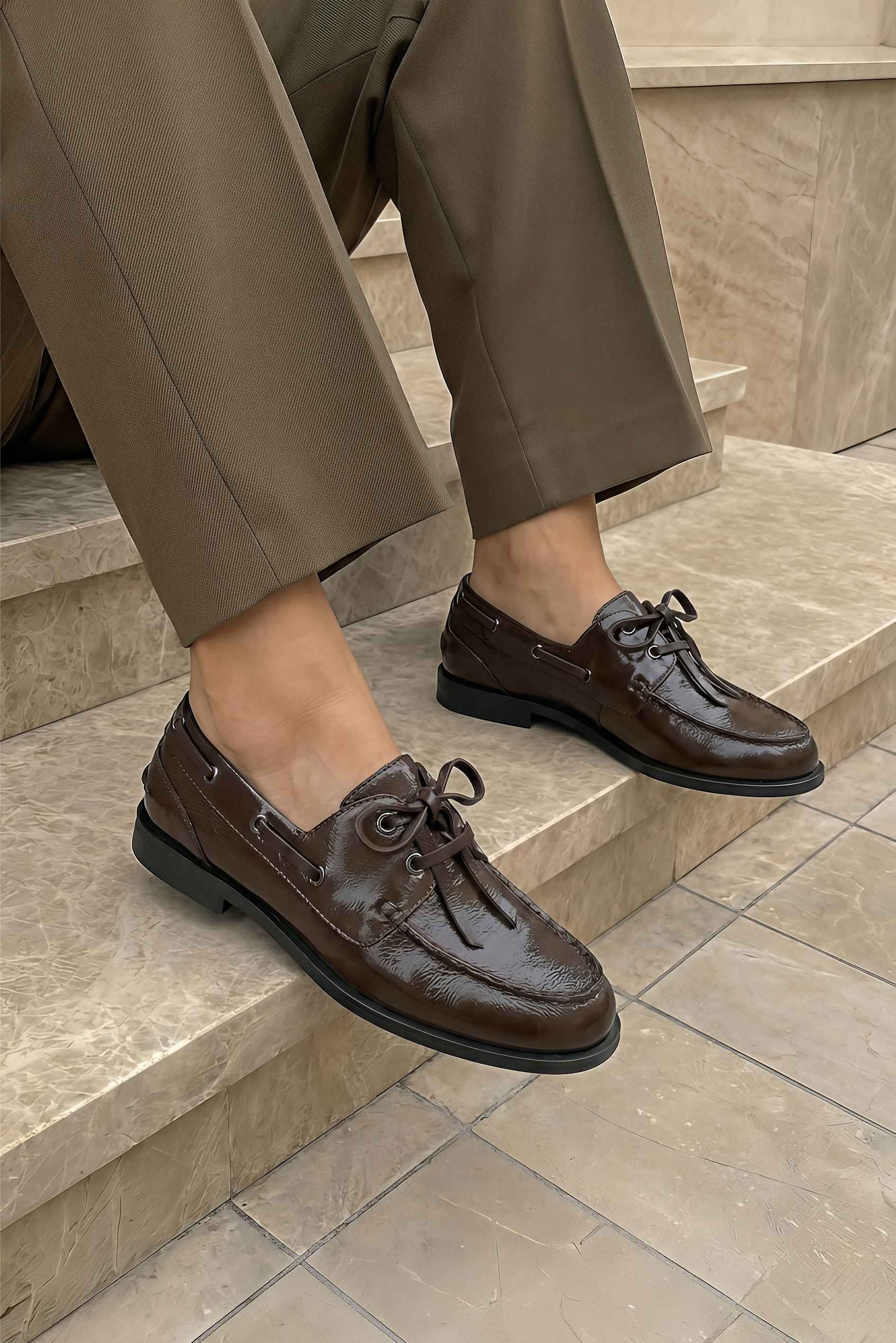 Топсайдеры из натуральной кожи в насыщенном коричневом оттенке – это идеальный баланс классики и комфорта. Округлый мысок, удобная шнуровка с фурнитурой в оттенке металлик и аккуратный венский каблук создают стильный и продуманный образ, а гибкая подошва дарит легкость в движении. Актуальность модели подчеркнет любой гардероб, добавив современных акцентов.