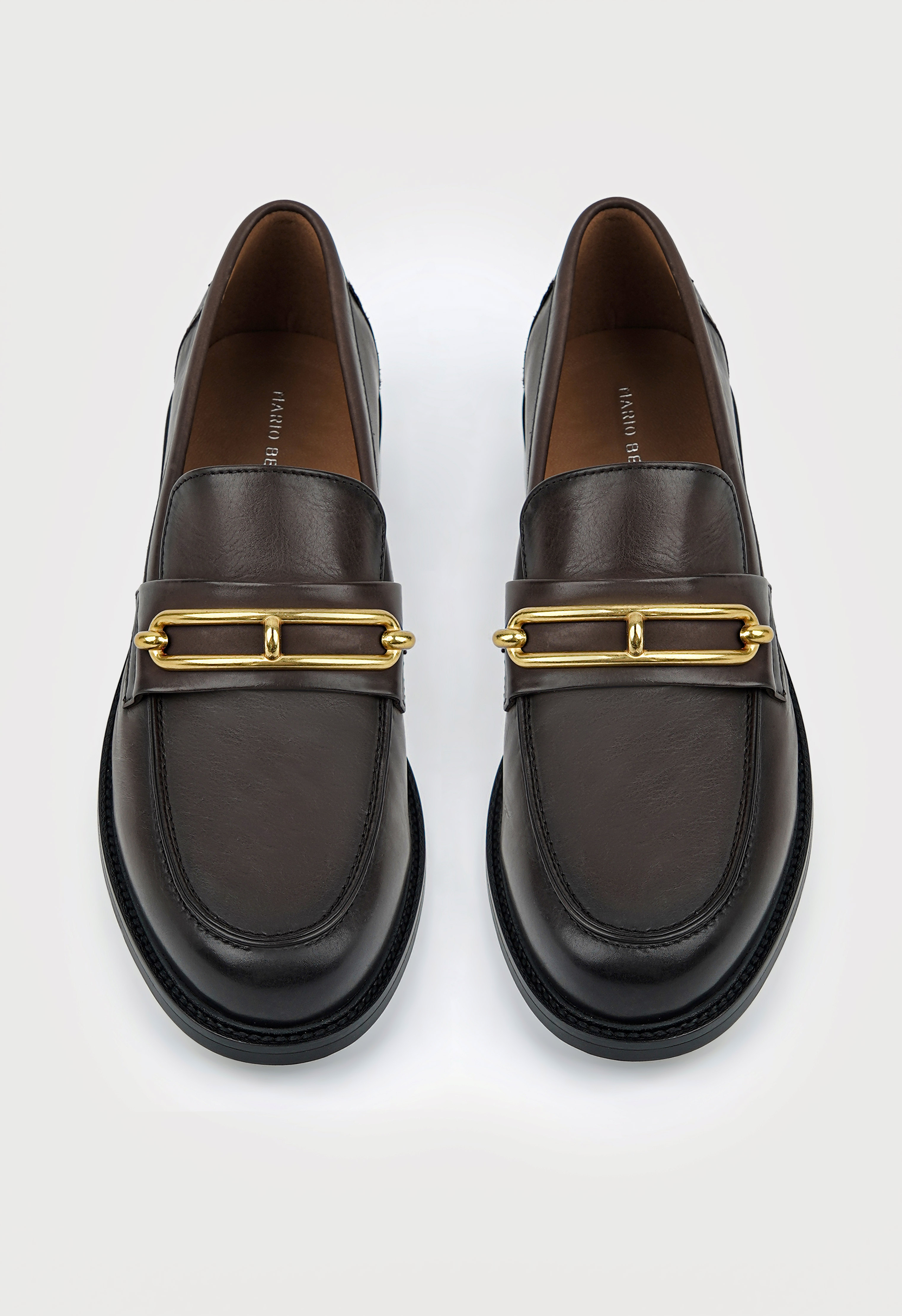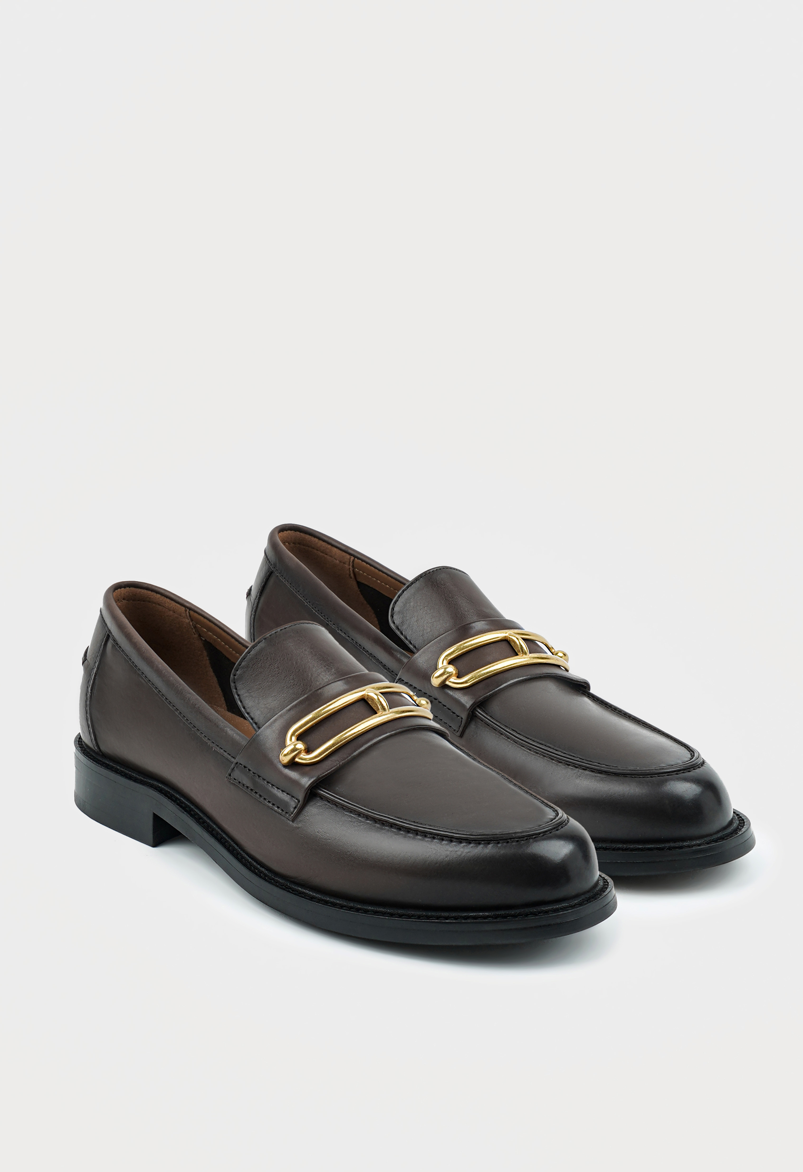 Коричневые лоферы из натуральной кожи – это идеальный выбор для тех, кто ценит элегантность и комфорт в каждом движении. Гибкая подошва обеспечивает легкость и мягкость шага, а широкий каблук придает устойчивость и уверенность на протяжении всего дня. Округлый мысок сохраняет классический, универсальный силуэт, который легко впишется в любой гардероб, а золотая фурнитура добавляет стильный акцент и подчеркивает утонченный вкус. Эти лоферы отлично подойдут как для работы, так и для встреч с друзьями, делая ваши образы актуальными, удобными и безупречно стильными каждый день.