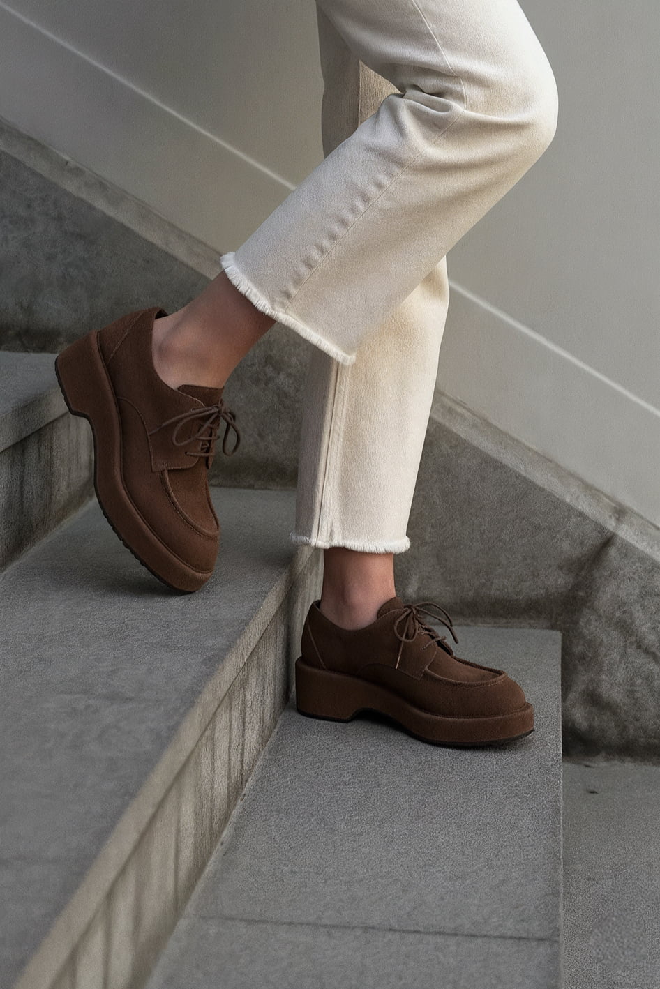 Коричневые полуботинки из натуральной замши с подкладкой из натуральной кожи – это идеальное сочетание стиля и комфорта для динамичной городской жизни. Округлый мысок придает модели универсальность и мягкость линий, а аккуратная шнуровка обеспечивает надежную фиксацию и удобную посадку по ноге. Жесткая подошва и трендовая платформа дарят уверенность и устойчивость на любых поверхностях, подчеркивая современный характер обуви. Эти полуботинки отлично впишутся в повседневный гардероб – от классических брюк до джинсов, подчеркивая вашу любовь к качеству и актуальному стилю в каждой детали.
