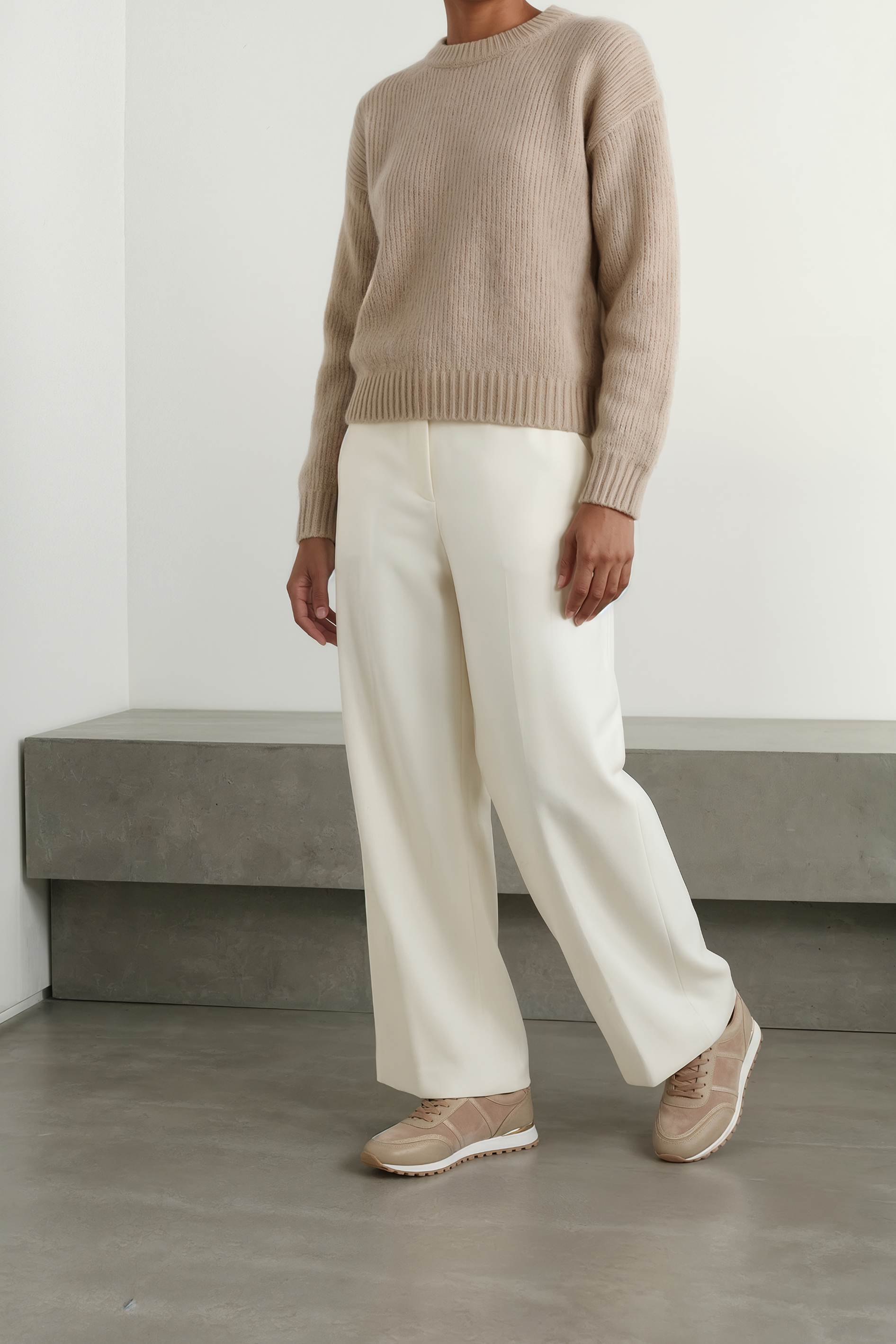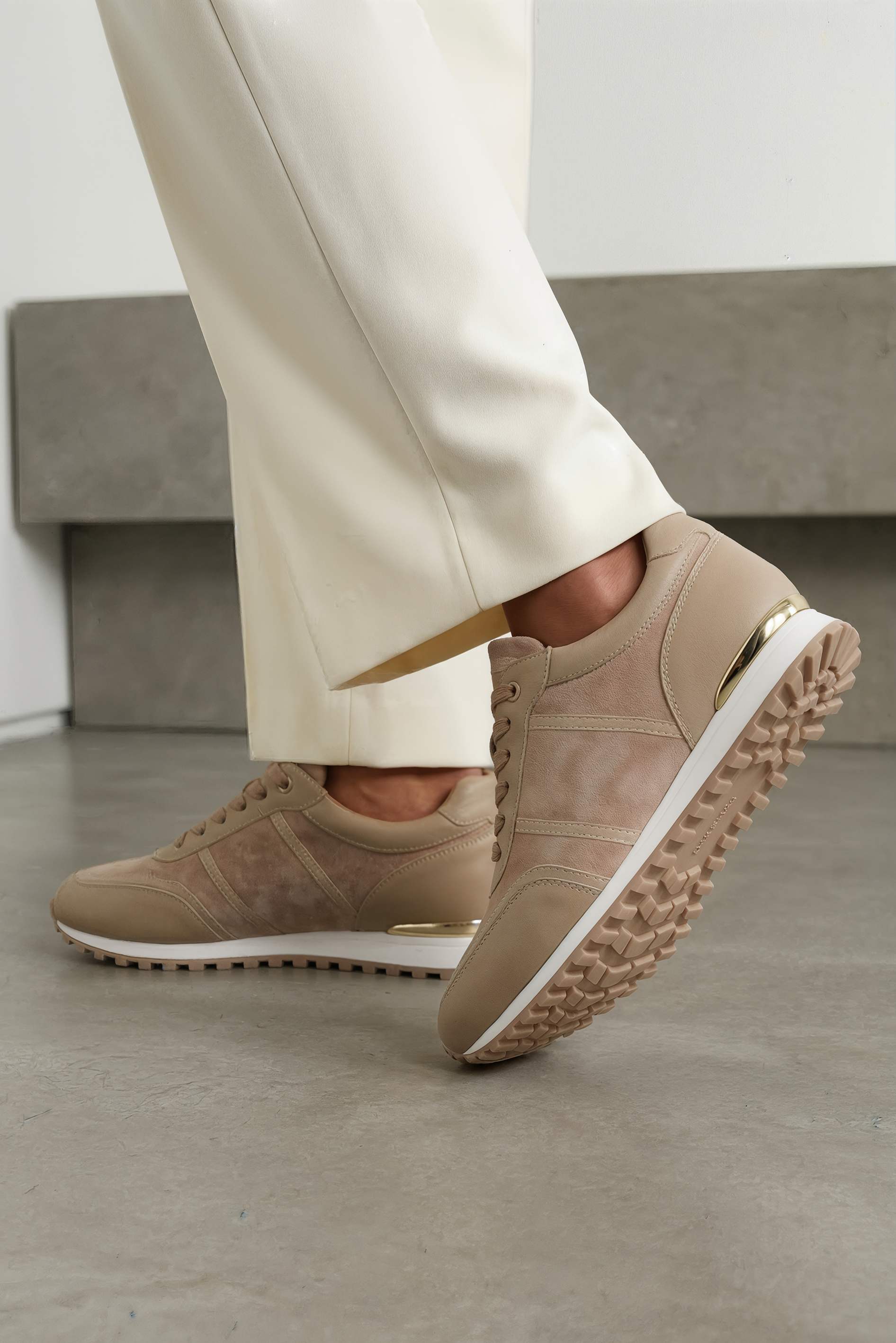 Бежевые кроссовки из натуральной кожи – спокойная база, которая легко вписывается в любой гардероб и выглядит аккуратно в каждом образе. Гладкая кожа в сочетании с фактурными вставками добавляет глубины дизайну, а округлый мысок обеспечивает комфортную посадку на каждый день. Шнуровка надежно фиксирует стопу, в то время как аккуратная золотая фурнитура добавляет деликатный акцент и подчеркивает внимание к деталям. Платформа визуально вытягивает силуэт и добавляет рост, жесткая подошва обеспечивает стабильную опору и уверенный шаг в городском ритме.