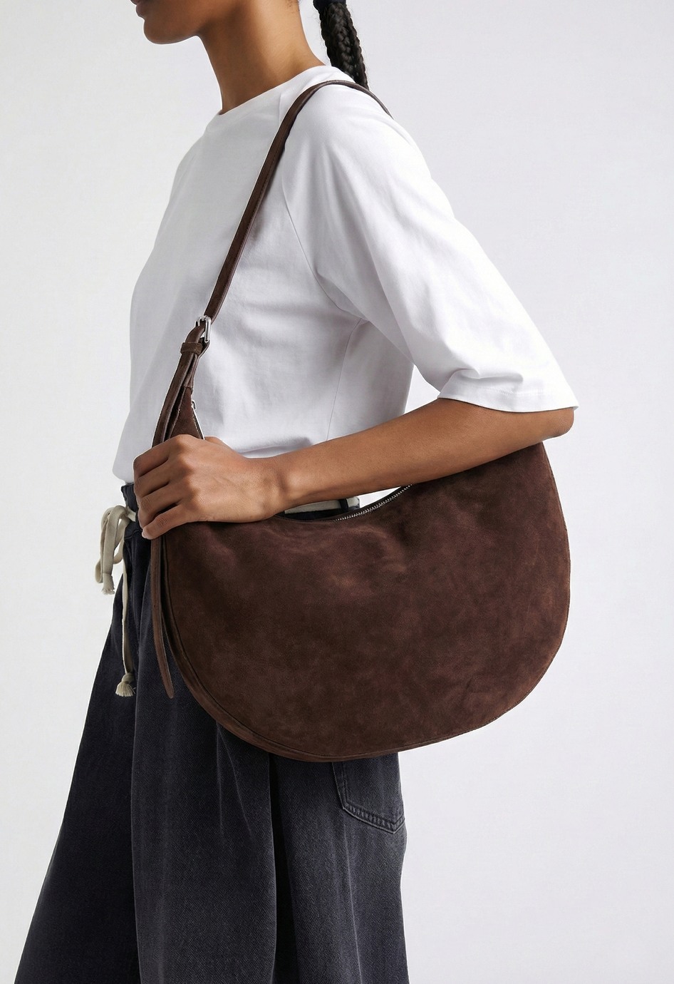 Коричневая сумка из натуральной замши – универсальная модель на каждый день: регулируемая ручка позволяет настроить удобную посадку на плече, серебряная фурнитура добавляет аккуратный современный акцент, а молния надежно закрывает содержимое. Внутри предусмотрены три кармана, чтобы удобно разложить мелочи и всегда держать все под рукой.