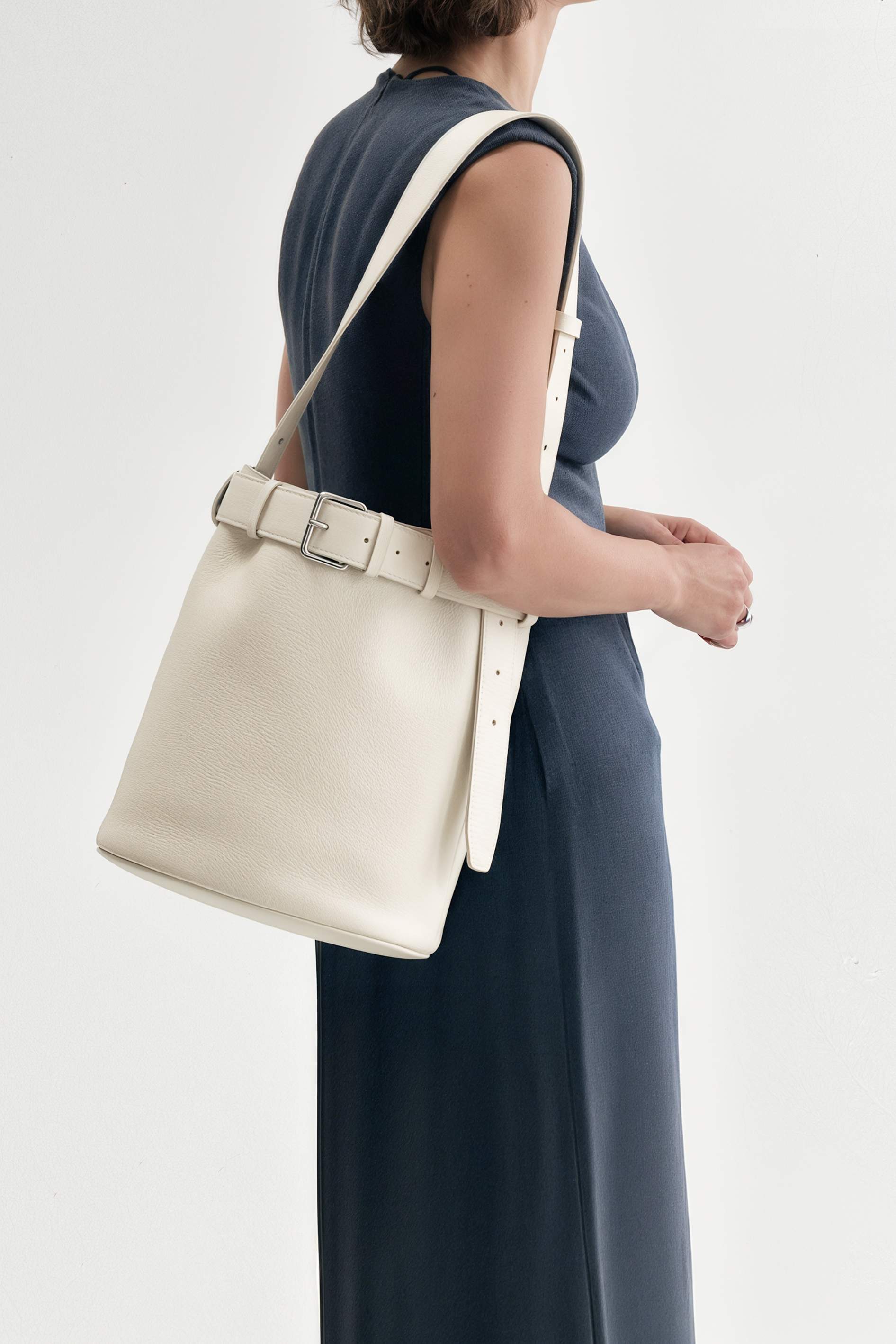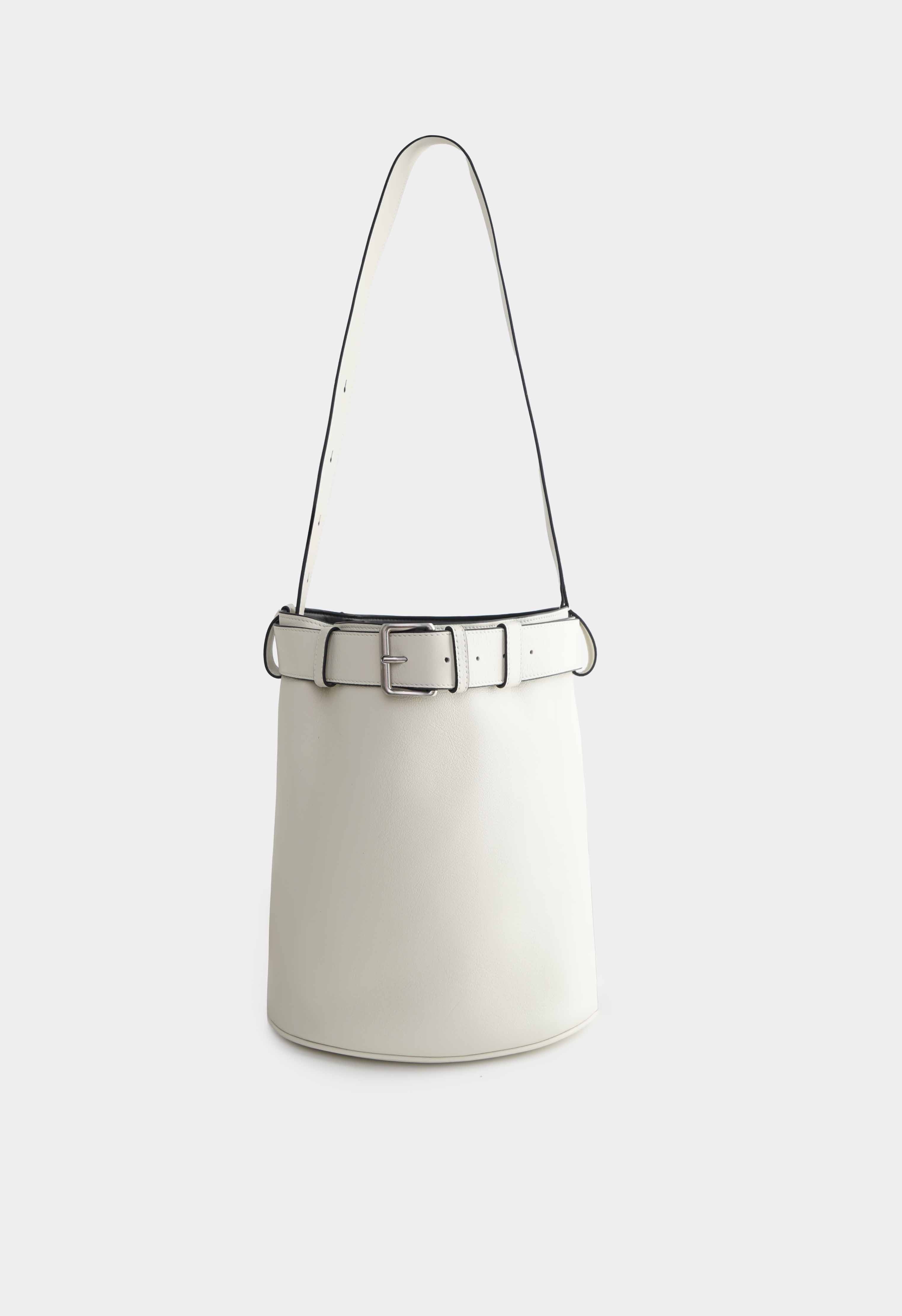 Сумка в нежном молочном цвете из натуральной кожи выглядит свежо и очень элегантно благодаря необычной цилиндрической форме. Декор кожаный ремень с пряжкой подчеркивает силуэт и добавляет выразительный акцент, а серебряная фурнитура делает образ более современным и аккуратным. Регулируемая ручка позволяет выбрать удобную длину и носить сумку так, как хочется. Внутри предусмотрен карман для мелочей для комфортной организации.