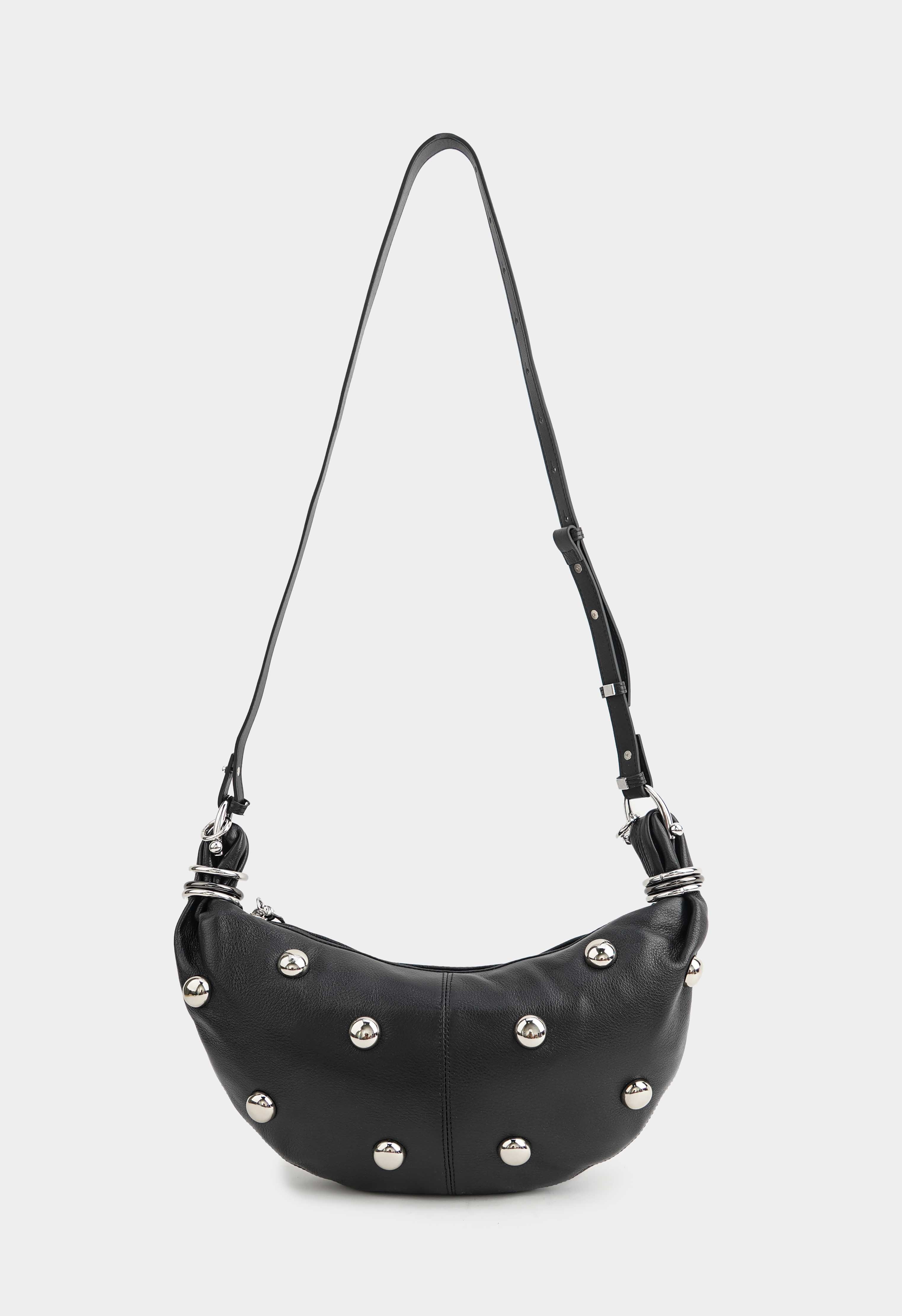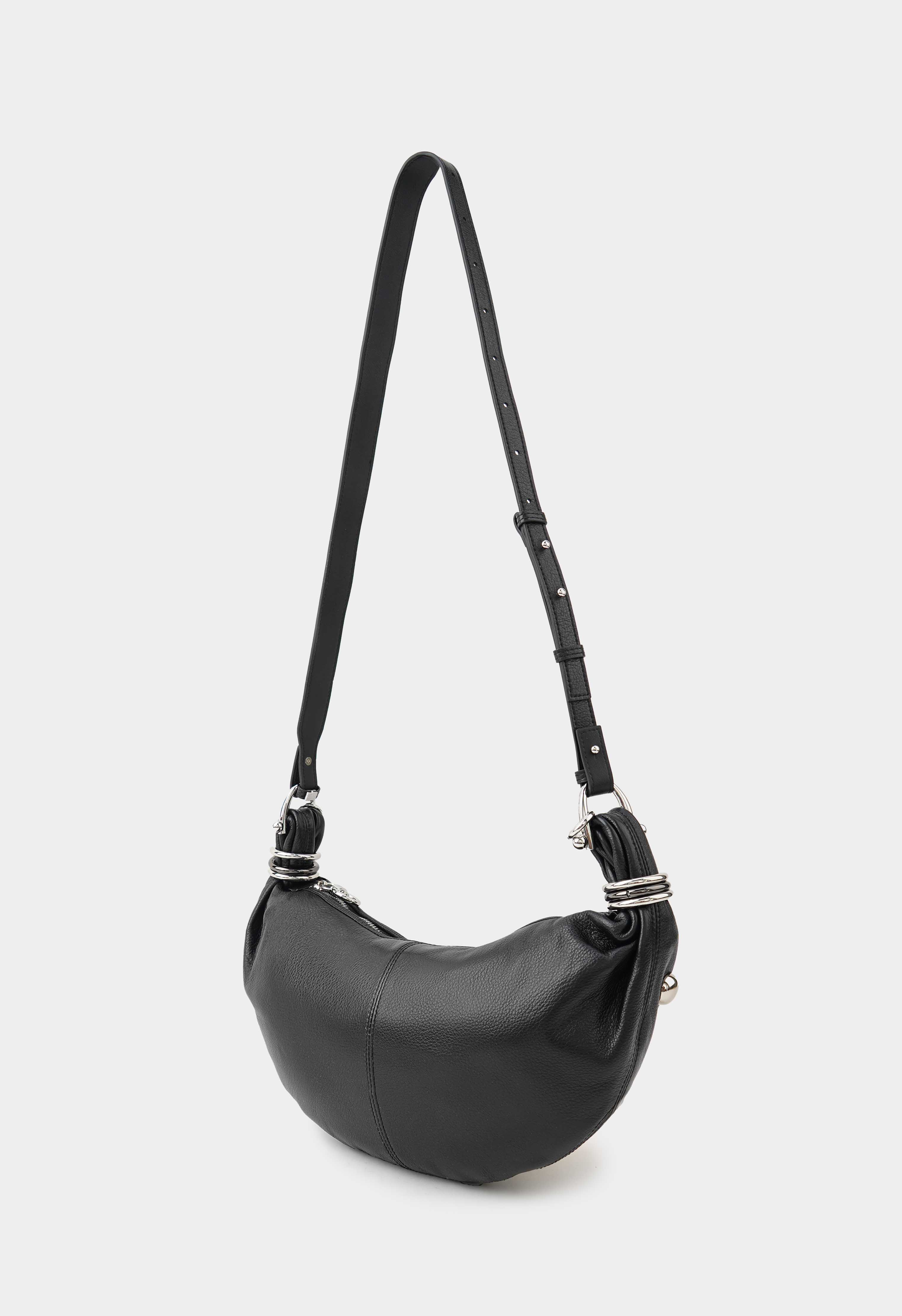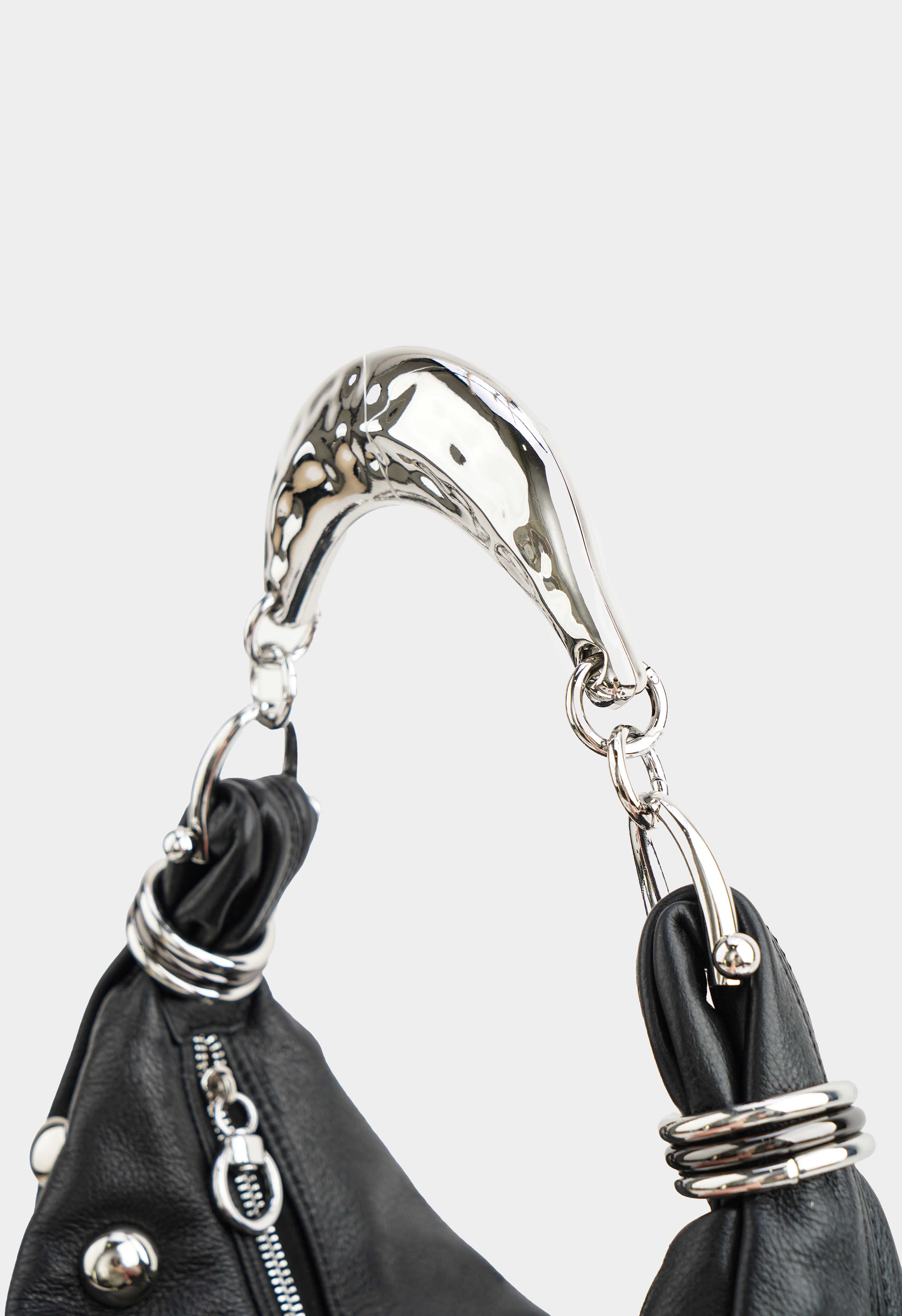 Оригинальная черная сумка из натуральной кожи с крупными серебряными деталями – эффектный аксессуар с характером, который сразу притягивает взгляды и добавляет образу модной дерзости. Плечевой ремень в комплекте обеспечивает комфорт в носке, молния надежно закрывает содержимое, серебряная фурнитура поддерживает общий стиль, а внутри предусмотрены два кармана, чтобы удобно разложить мелочи и держать все важное под рукой.