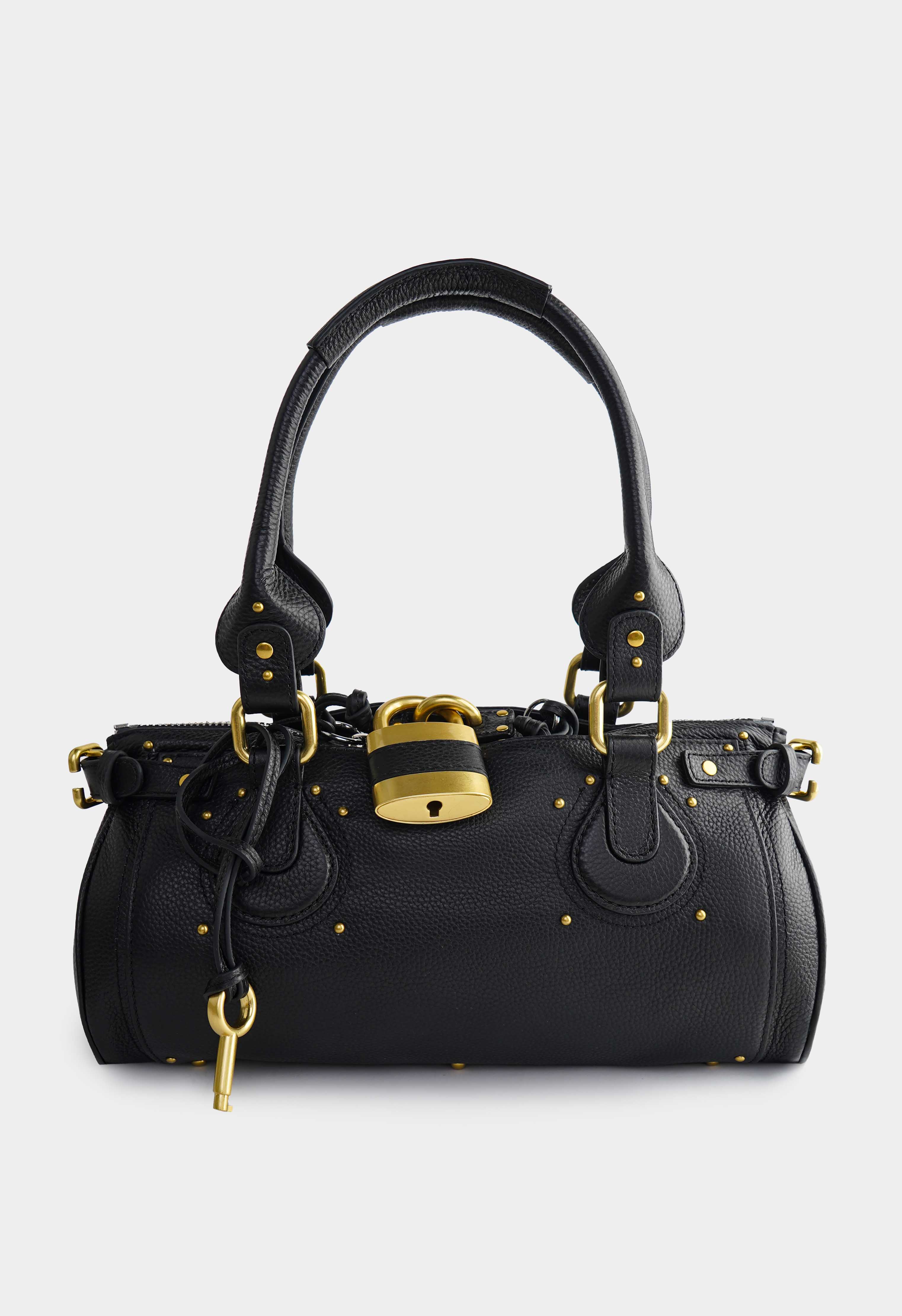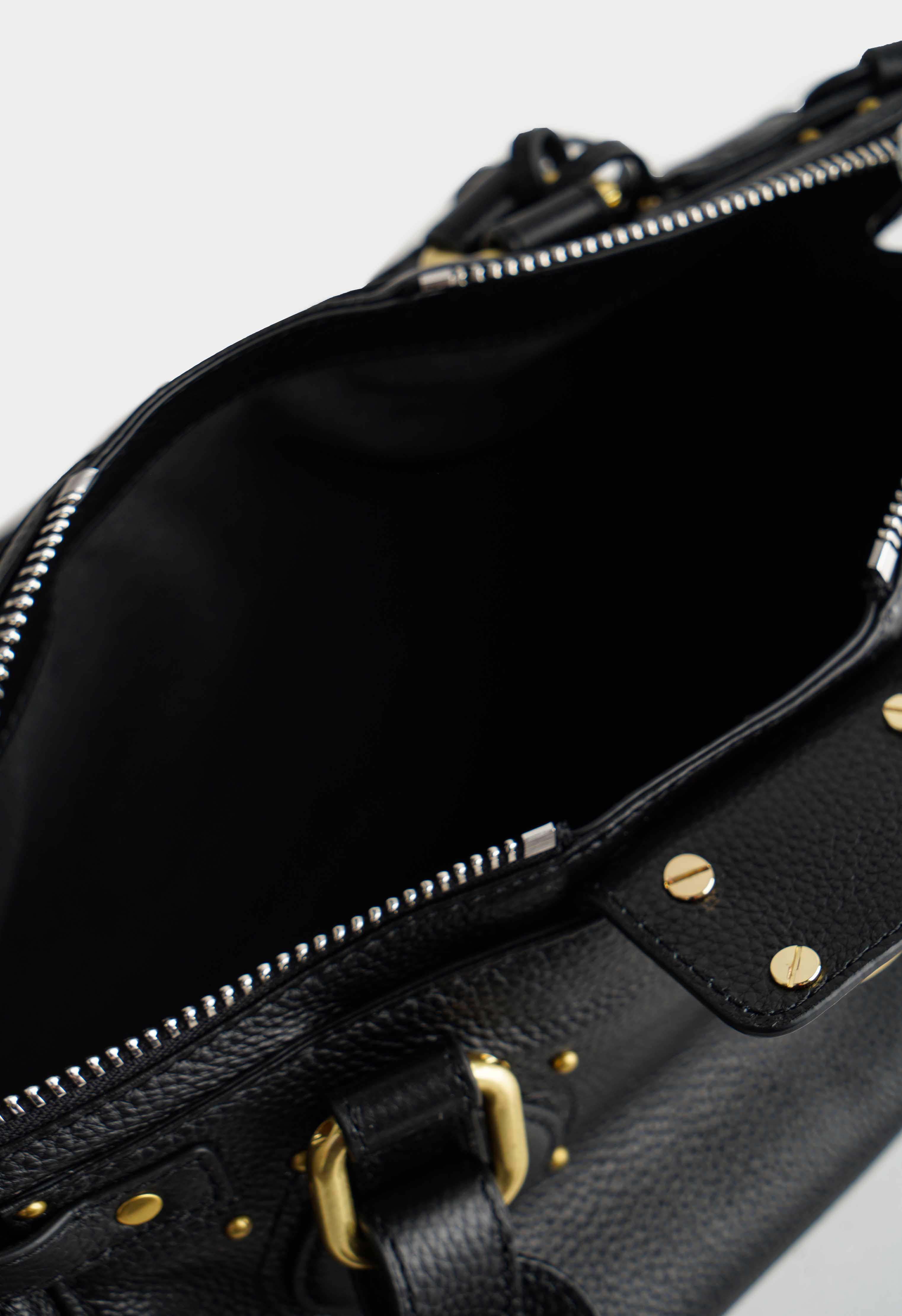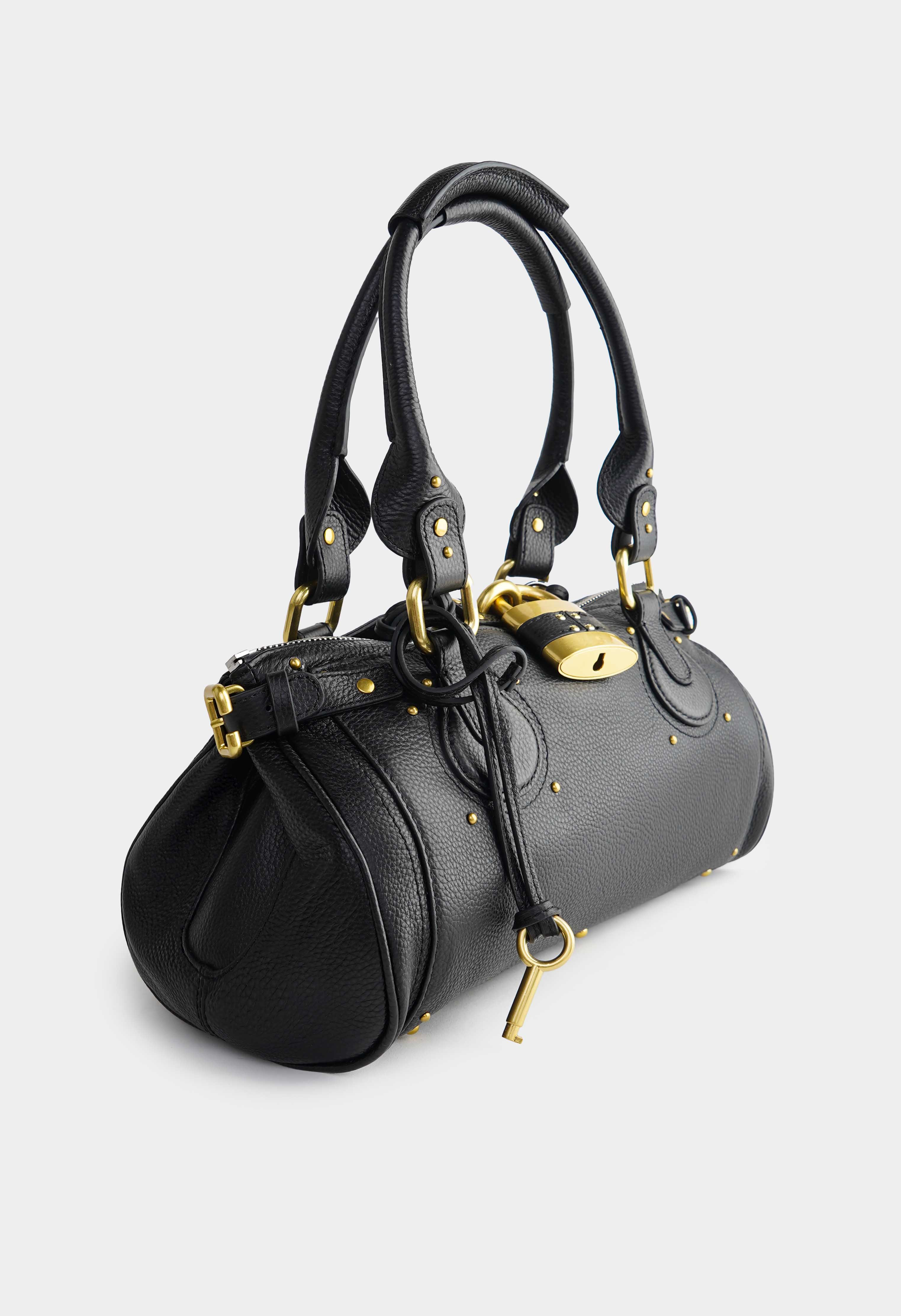 Трендовая сумка в черном цвете из натуральной зернистой кожи выглядит статусно и заметно за счет эффектной золотой фурнитуры. Аккуратная форма с плотными ручками и декоративным замком создает премиальный внешний вид модели, а надежная молния сохраняет содержимое в порядке. Внутри одно основное отделение с удобной организацией: карман на молнии для ценного и открытый карман для мелочей. Снаружи предусмотрены два внешних кармана. Компактный размер, выразительные детали и практичная компоновка делают сумку удачным выбором для города, встреч и активных дней.