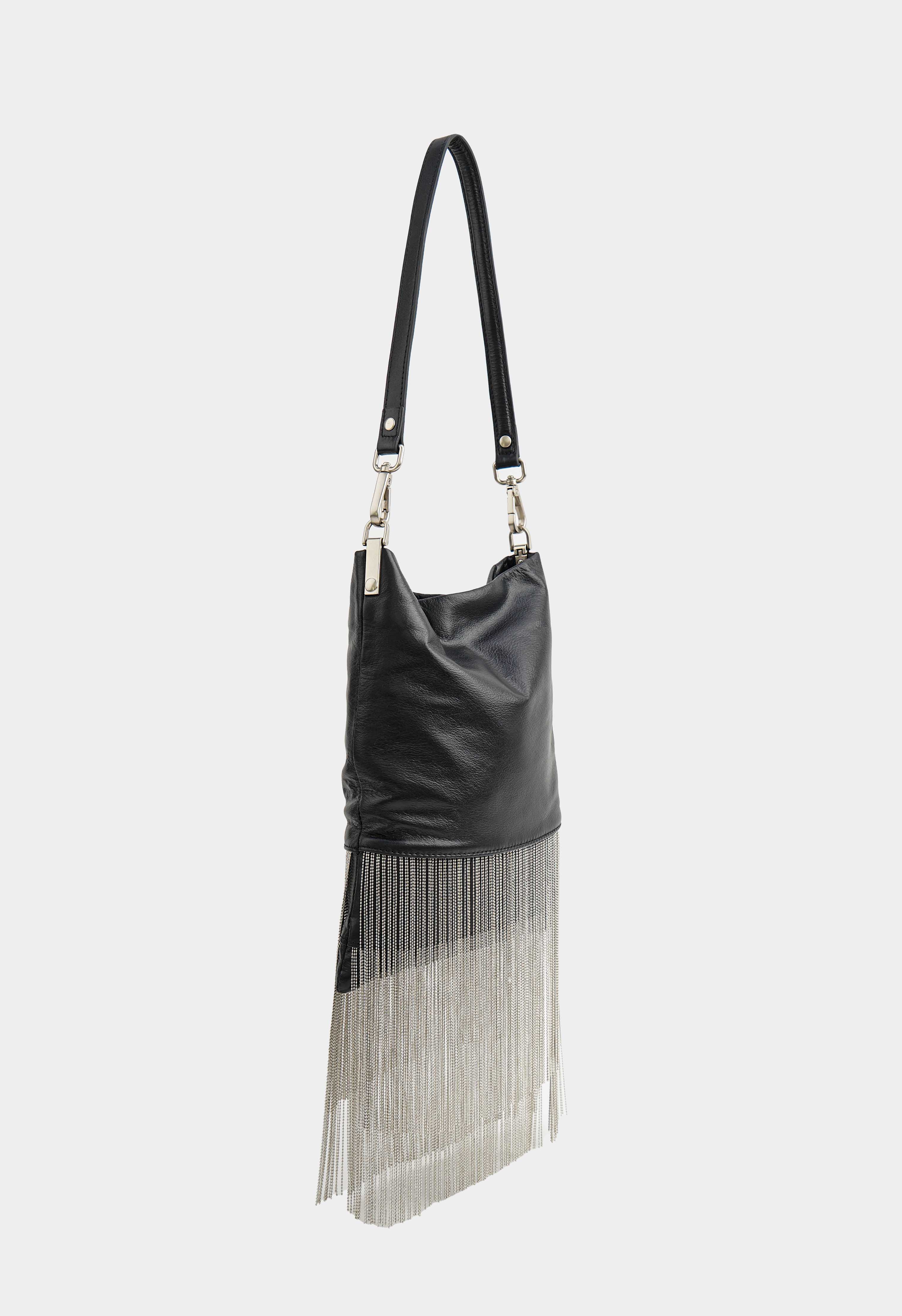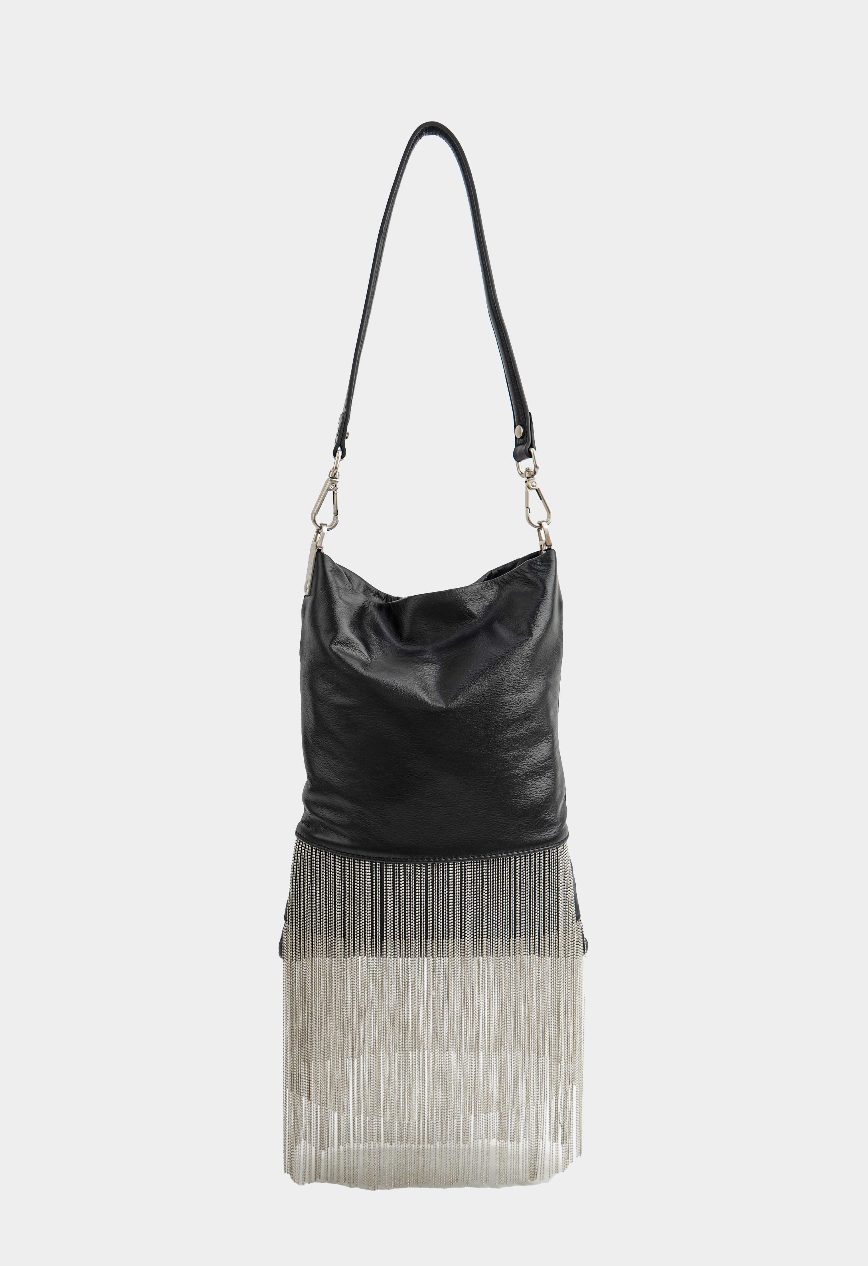 Эффектная черная сумка из натуральной кожи с роскошной бахромой – яркий акцент для стильных образов: плечевой ремень удобно ложится на плечо, в то время как съемная ручка позволяет легко менять формат носки. Практичная застежка на магнит закрывается быстро и надежно, серебряная фурнитура добавляет холодный блеск и подчеркивает современный характер модели. Внутри два кармана помогают аккуратно организовать все важные мелочи.