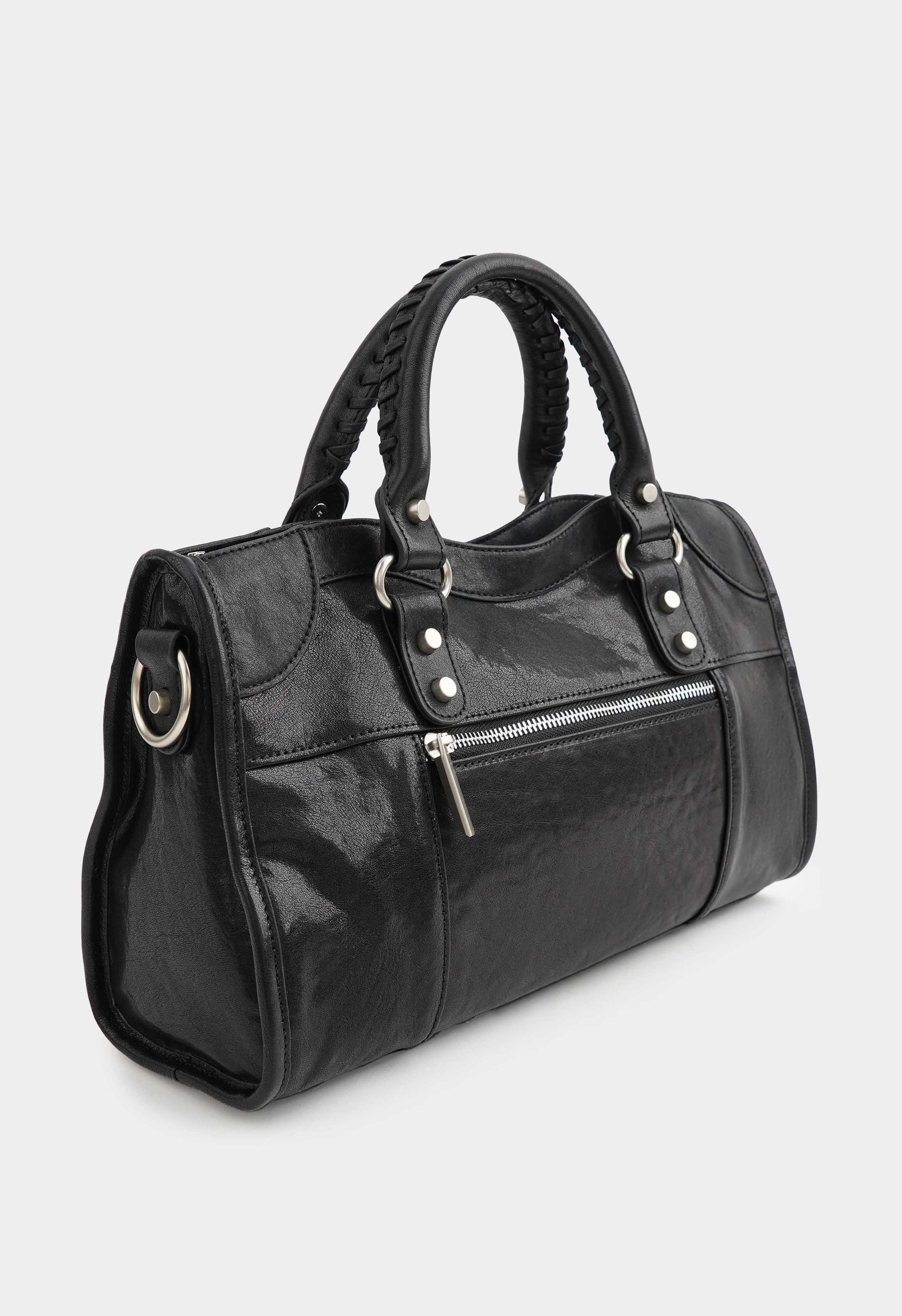 Актуальная черная сумка из натуральной кожи – эффектная городская модель с характером: плечевой ремень обеспечивает комфорт в носке, а обвес из кожаной тесьмы с зеркальцем добавляет практичную и модную деталь. Надежная молния закрывает содержимое, серебряная фурнитура подчеркивает дерзкий современный стиль, внутри предусмотрены два удобных кармана для мелочей, в то время как два внешних кармана помогают держать все самое нужное всегда под рукой.