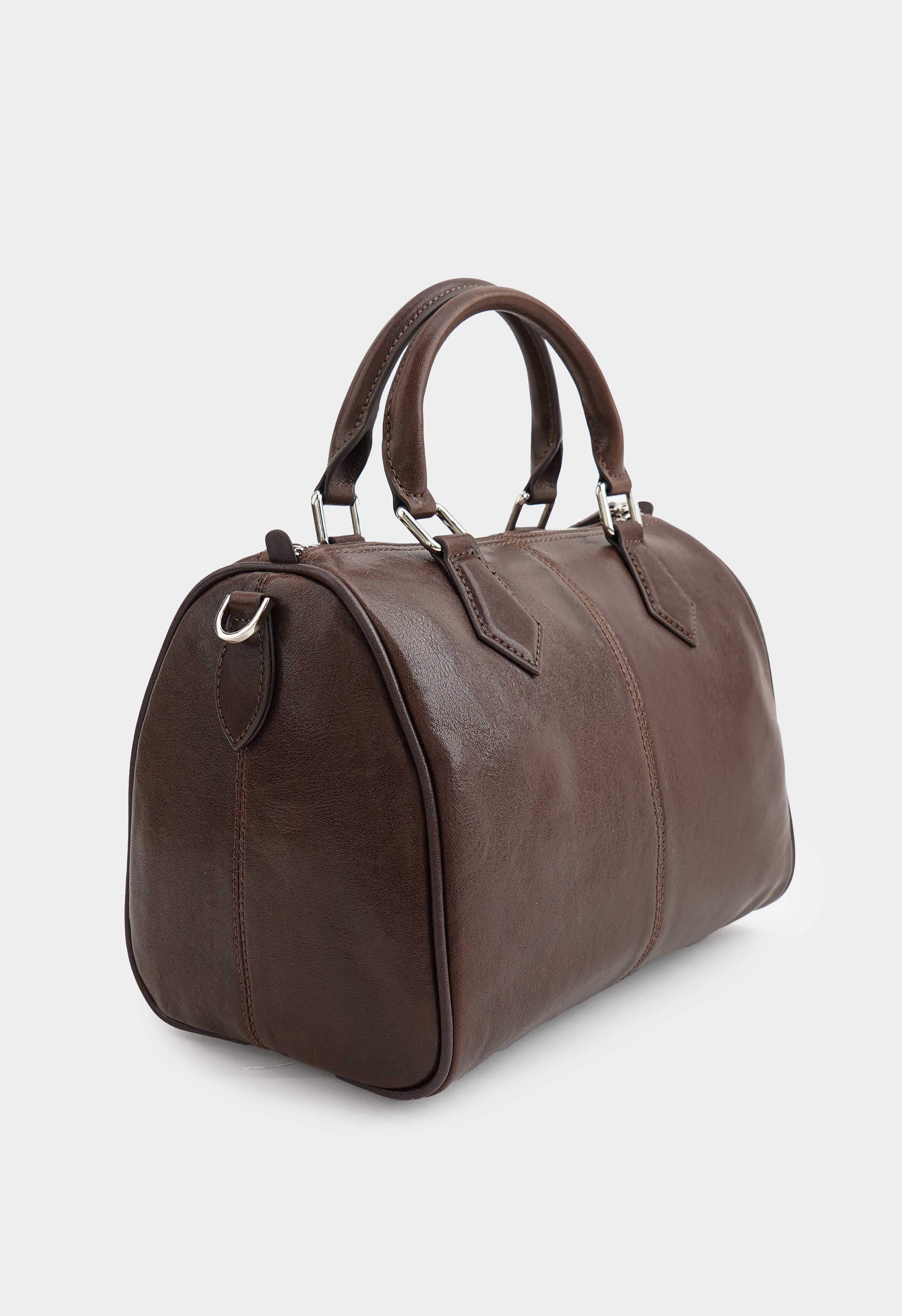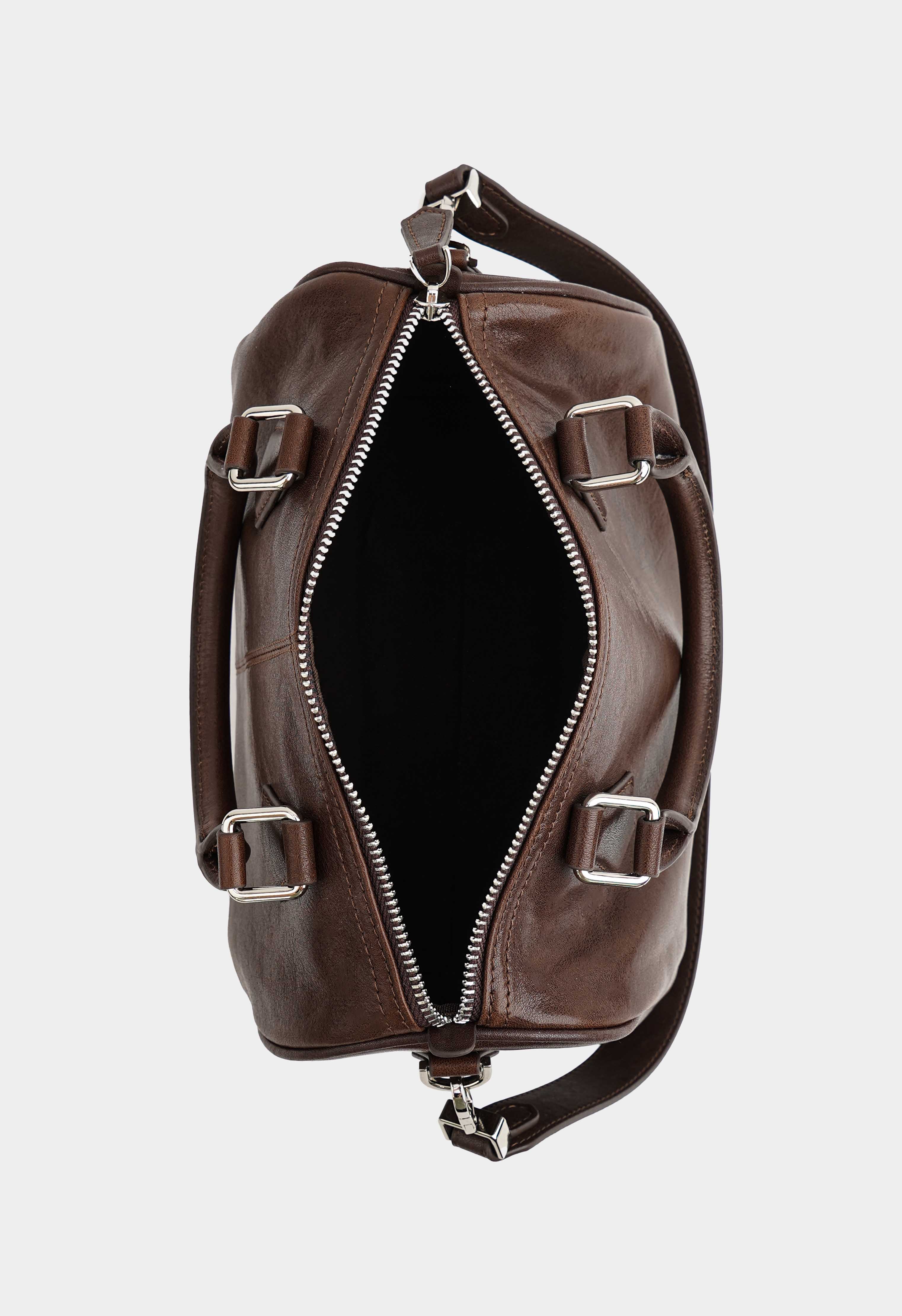 Современная коричневая сумка из натуральной кожи – практичная и выразительная модель для динамичного дня: два плечевых ремня обеспечивают удобную посадку и комфорт в носке, а обвес из кожаной тесьмы с мини-замочком добавляет модный акцент и делает сумку запоминающейся. Молния защищает содержимое, серебряная фурнитура придает современный блеск, в то время как внутри предусмотрены два кармана, чтобы аккуратно разложить мелочи и быстро находить самое нужное.