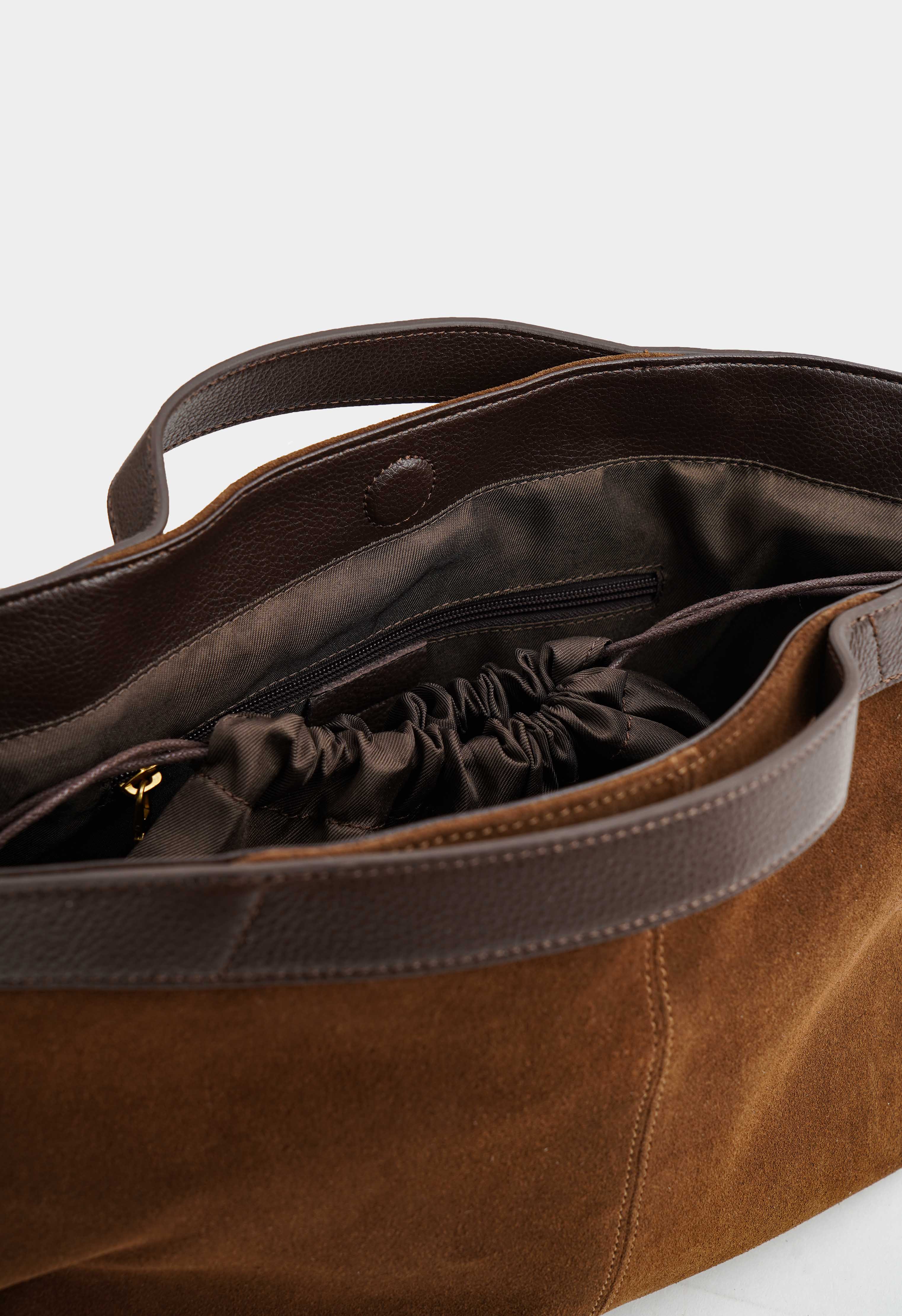 Трендовая коричневая сумка из натуральной замши – теплый и благородный акцент для повседневных образов: удобный плечевой ремень обеспечивает комфорт в носке, а практичный вкладыш-мешочек из текстиля на шнурке помогает аккуратно хранить вещи и добавляет уюта. Застежка на магнит закрывается быстро и надежно, золотая фурнитура красиво подчеркивает фактуру замши, внутри предусмотрены два кармана для мелочей, в то время каквнешний карман выручит, когда нужно быстро достать самое нужное.