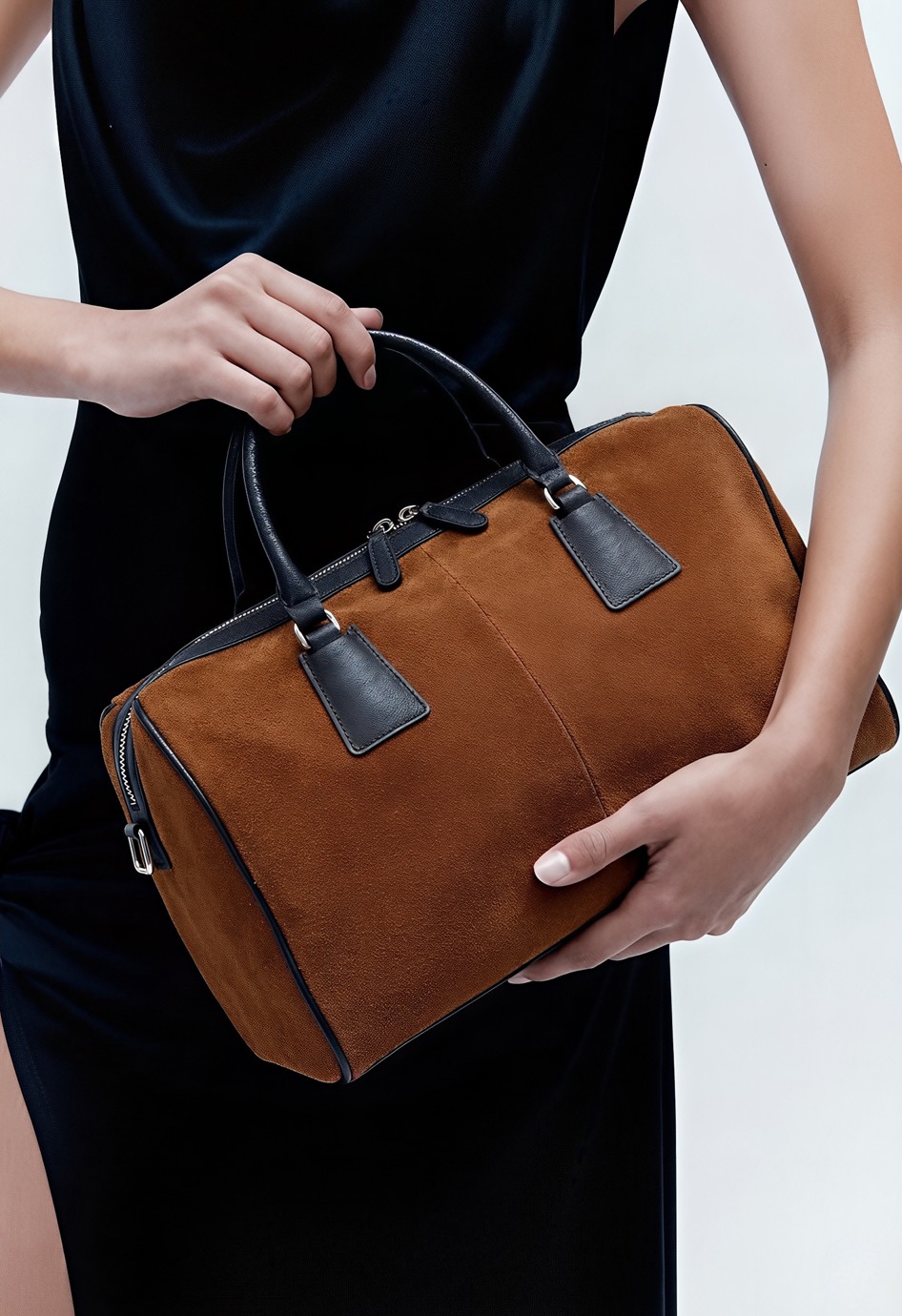 Стильная сумка из рыжей натуральной замши с вставками из черной кожи – эффектное сочетание теплого оттенка и строгих деталей, которое выглядит дорого и современно. Надежная молния аккуратно закрывает содержимое, серебряная фурнитура добавляет холодный блеск, а внутри предусмотрены два удобных кармана, чтобы мелочи всегда были разложены по местам и легко находились.