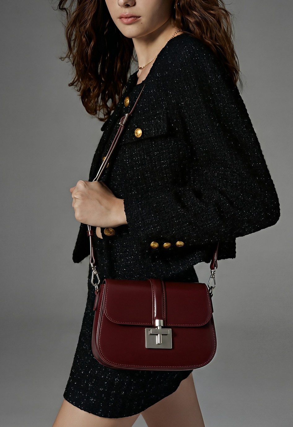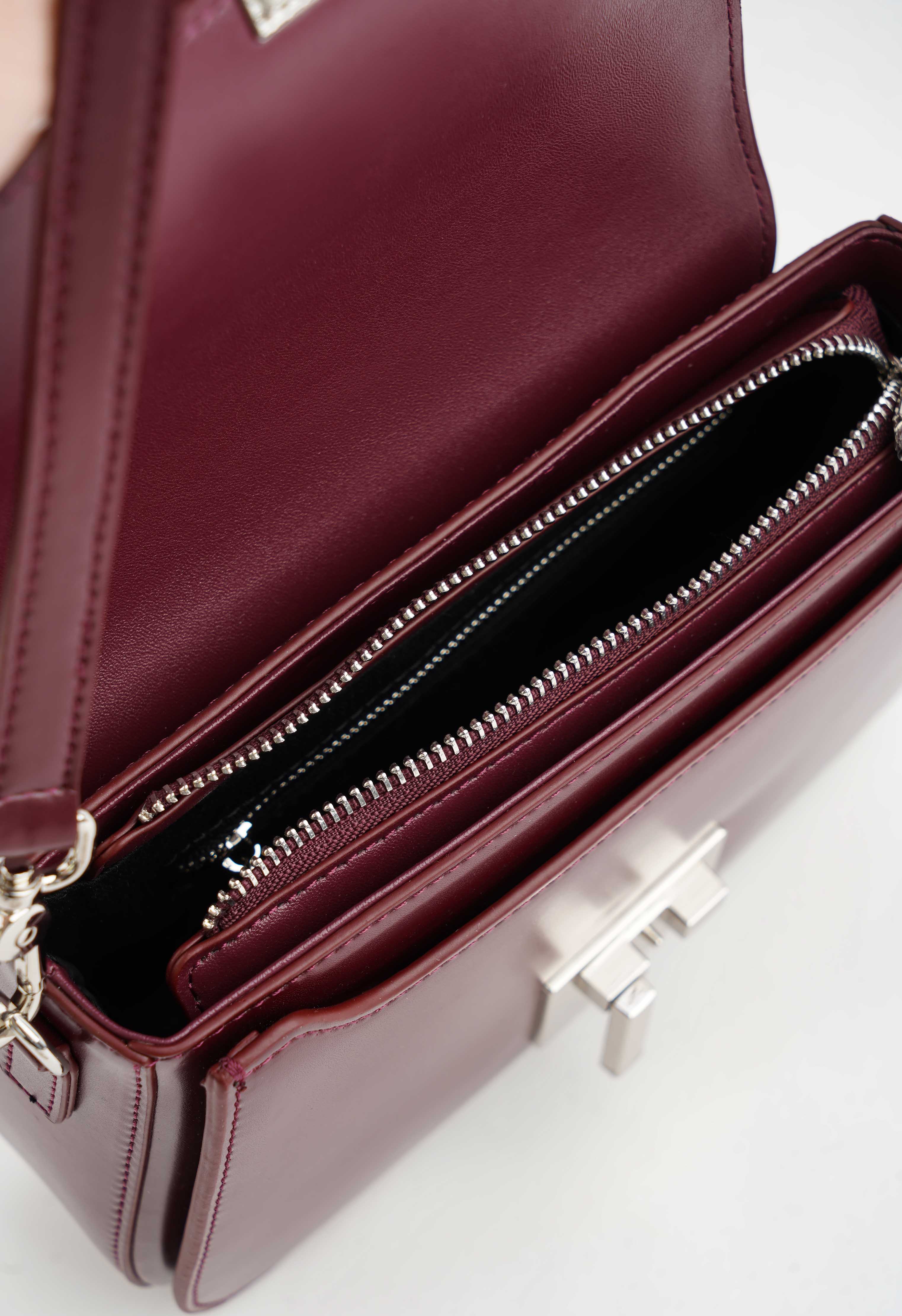 Бордовая сумка из натуральной кожи – универсальная классика с продуманными деталями: плечевой ремень удобно ложится на плечо, а съемная ручка позволяет менять формат носки под настроение и образ. Серебряная фурнитура выглядит современно и подчеркивает аккуратный силуэт, пряжка добавляет стильный акцент, в то время как молния надежно защищает содержимое. Внутри есть два кармана, снаружи – один, для порядка и быстрого доступа к мелочам