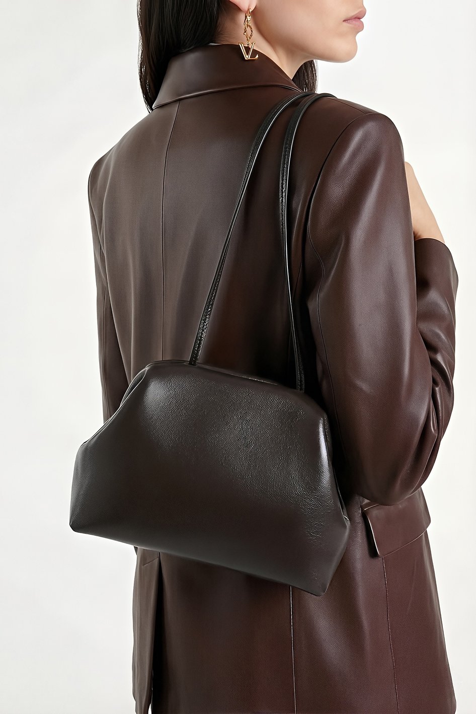 Минималистичная сумка коричневого цвета из натуральной кожи – идеальная база для любого образа: съемные ручки позволяют менять стиль носки, в то время как плечевой ремень в комплекте добавляет удобства на каждый день. Застежка на магнит закрывается быстро и надежно, золотая фурнитура красиво подчёркивает лаконичный дизайн, а внутри предусмотрен один карман, чтобы самое нужное всегда было аккуратно организовано и под рукой.