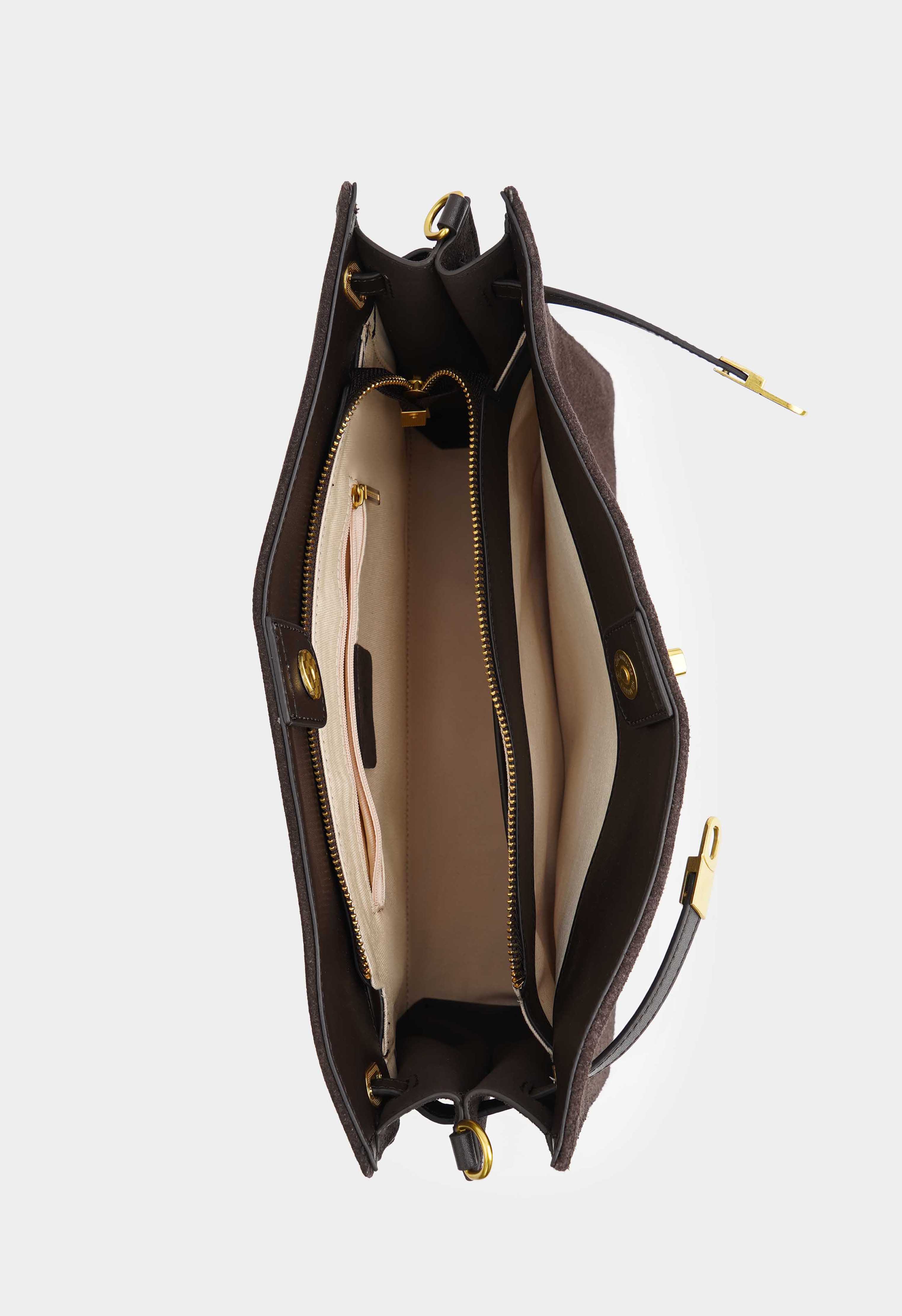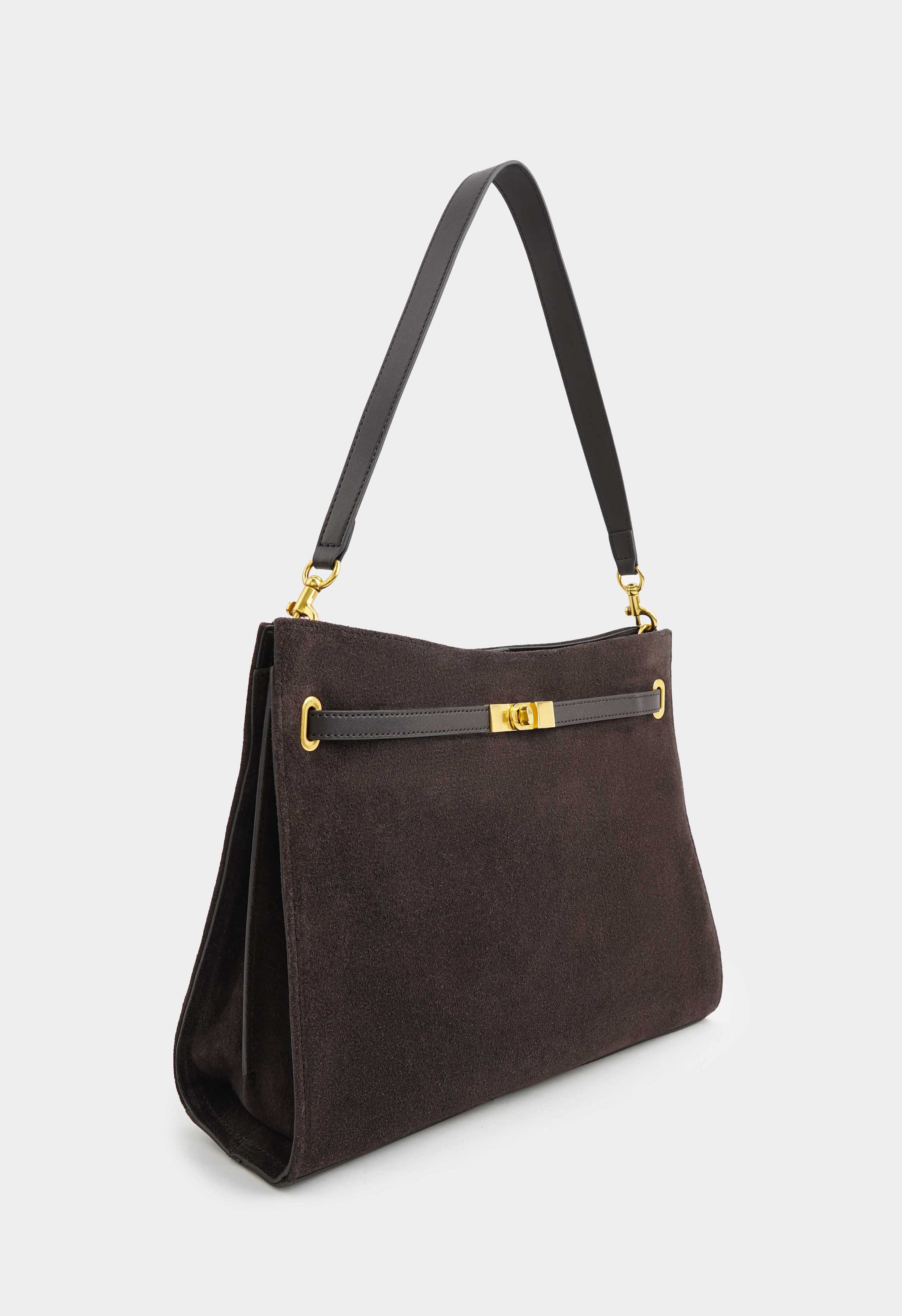 Коричневая сумка из натуральной замши – та самая базовая модель, которая выглядит дорого и будет служить каждый день: плечевой ремень удобно сидит на плече, а съемная ручка позволяет быстро сменить стиль носки. Золотая фурнитура и изящная пряжка придают образу элегантность, застежка на кнопке и молнии делает сумку максимально надежной. Внутри предусмотрены два отделения и два кармана, чтобы легко держать все в идеальном порядке.