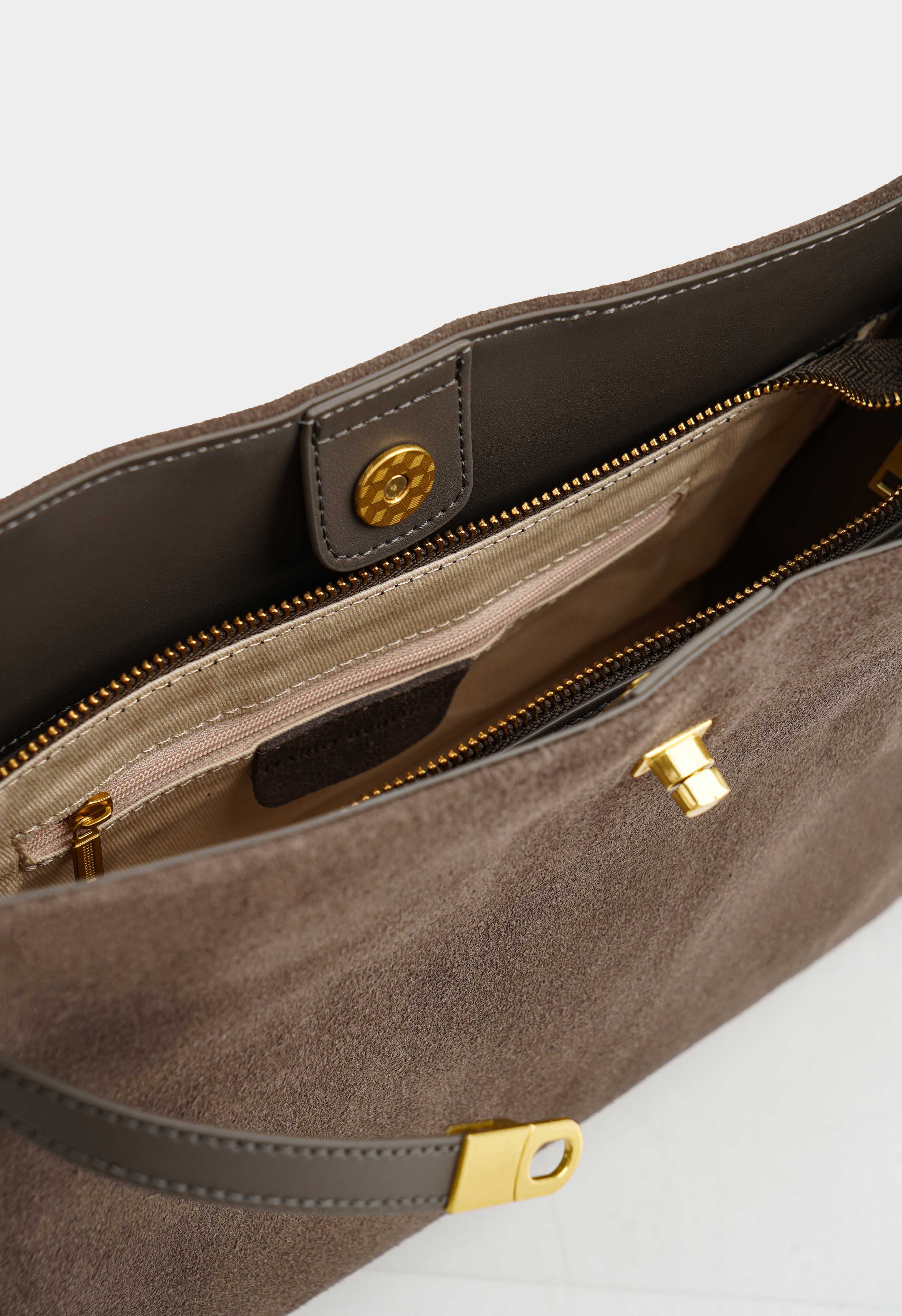 Серая сумка из натуральной замши – та самая базовая модель, которая выглядит дорого и будет служить каждый день: плечевой ремень удобно сидит на плече, а съемная ручка позволяет быстро сменить стиль носки. Золотая фурнитура и изящная пряжка придают образу элегантность, застежка на кнопке и молнии делает сумку максимально надежной. Внутри предусмотрены два отделения и два кармана, чтобы легко держать все в идеальном порядке.