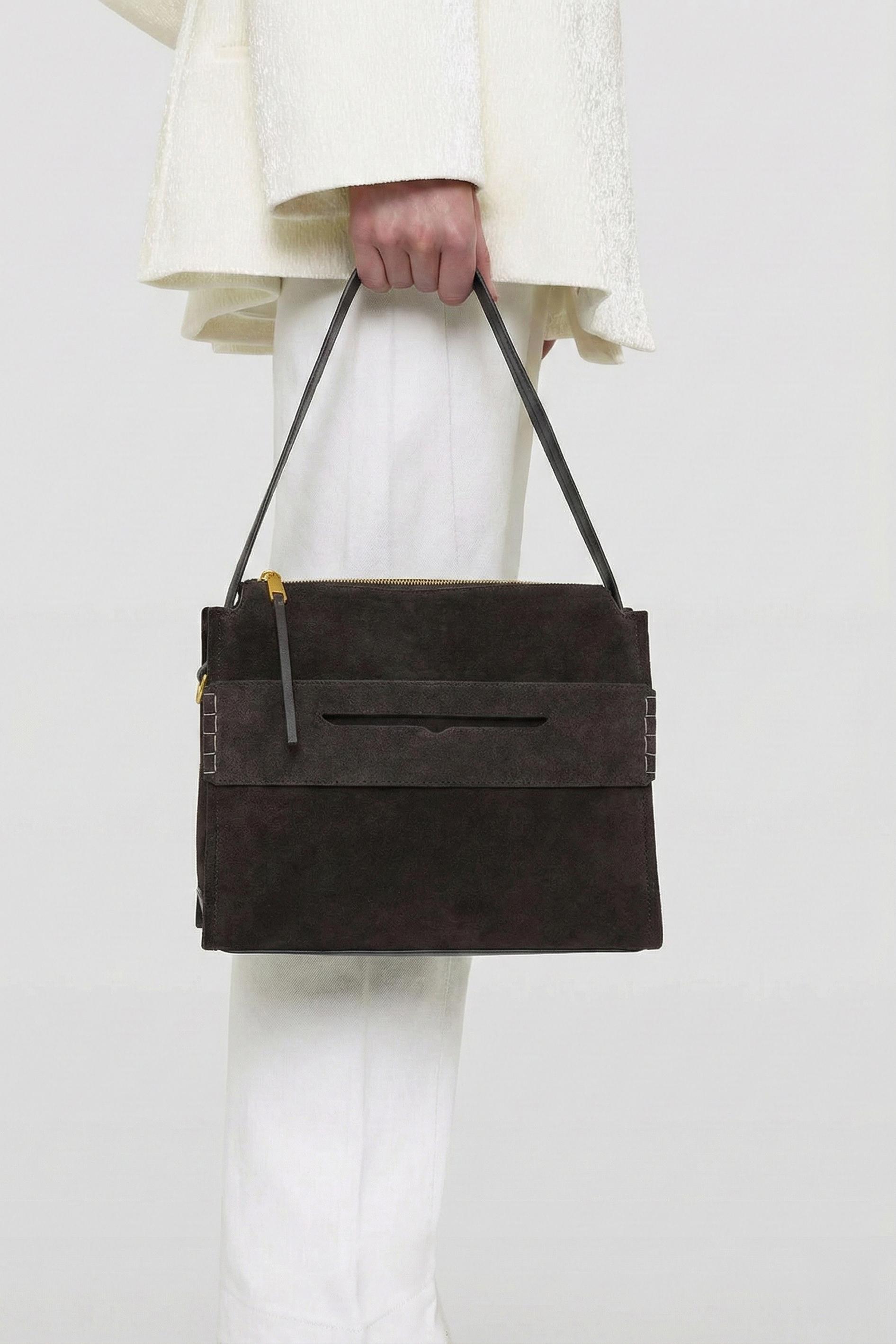 Вместительная коричневая сумка из натуральной замши – идеальный вариант на каждый день, когда нужно взять все необходимое и выглядеть стильно: плечевой ремень в комплекте обеспечивает комфорт в носке, молния надежно закрывает содержимое, а золотая фурнитура добавляет образу благородный акцент. Внутри предусмотрены два кармана, чтобы аккуратно разложить мелочи и быстро находить самое нужное.