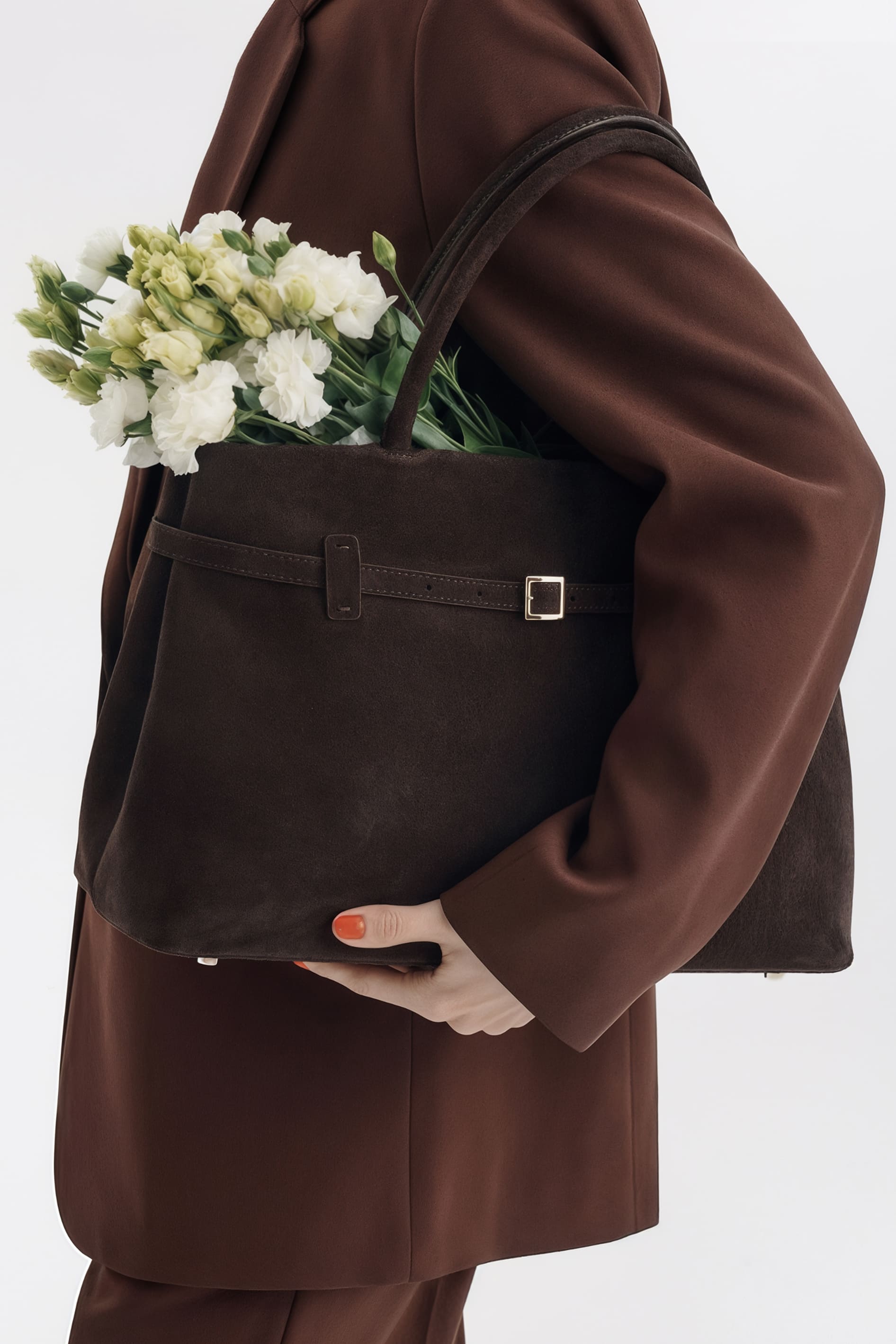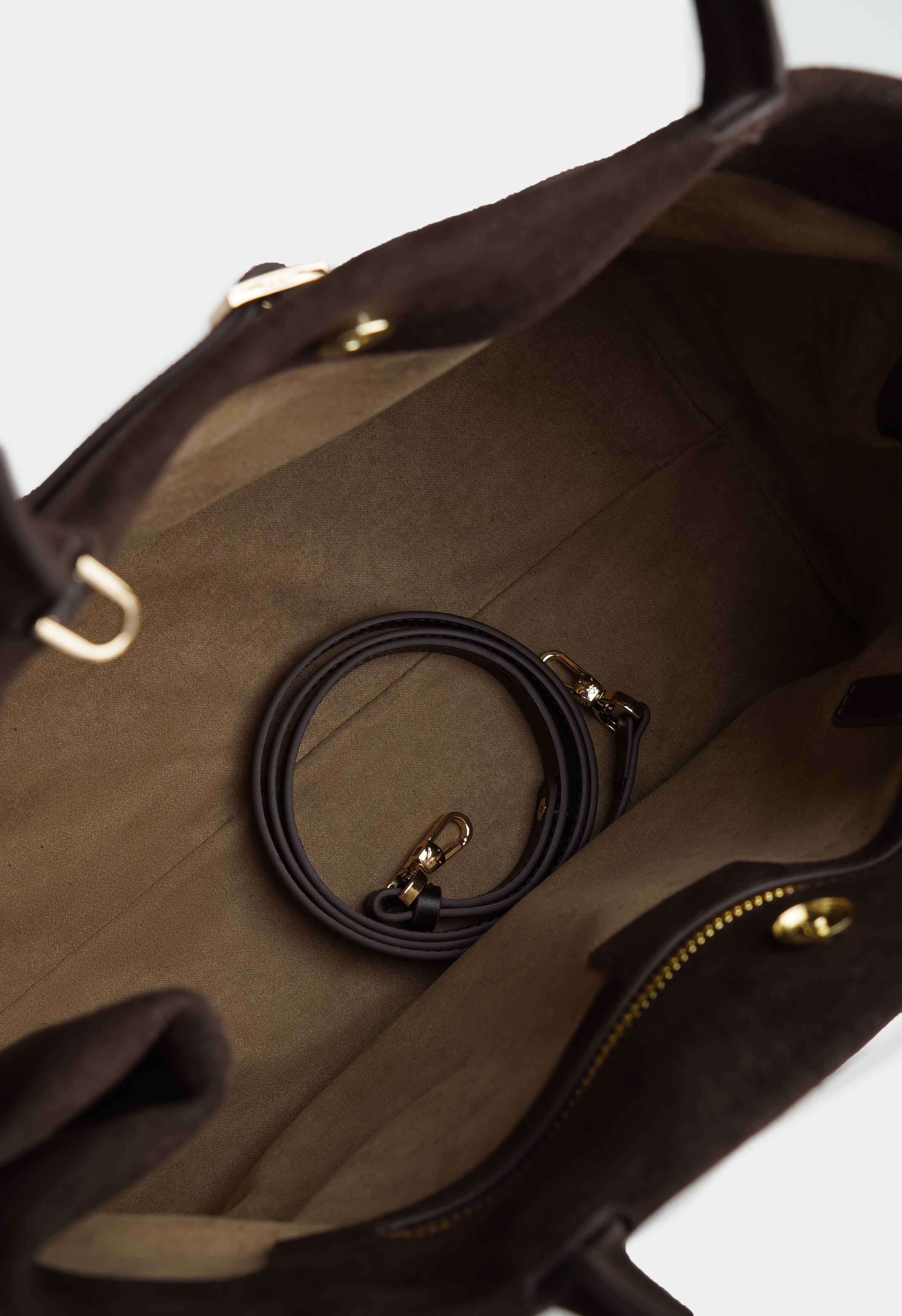 Аккуратная сумка из натуральной замши коричневого цвета – элегантная и практичная модель на каждый день: мягкая бархатистая фактура подчёркивает премиальный стиль, декоративный ремешок с пряжкой на передней части добавляет акцент, застёжка на кнопку обеспечивает удобство, золотая фурнитура придаёт изысканный блеск, в комплекте есть плечевой ремень для носки на плече или через плечо, а внутри предусмотрен 1 карман для мелочей, чтобы всё необходимое было под рукой.