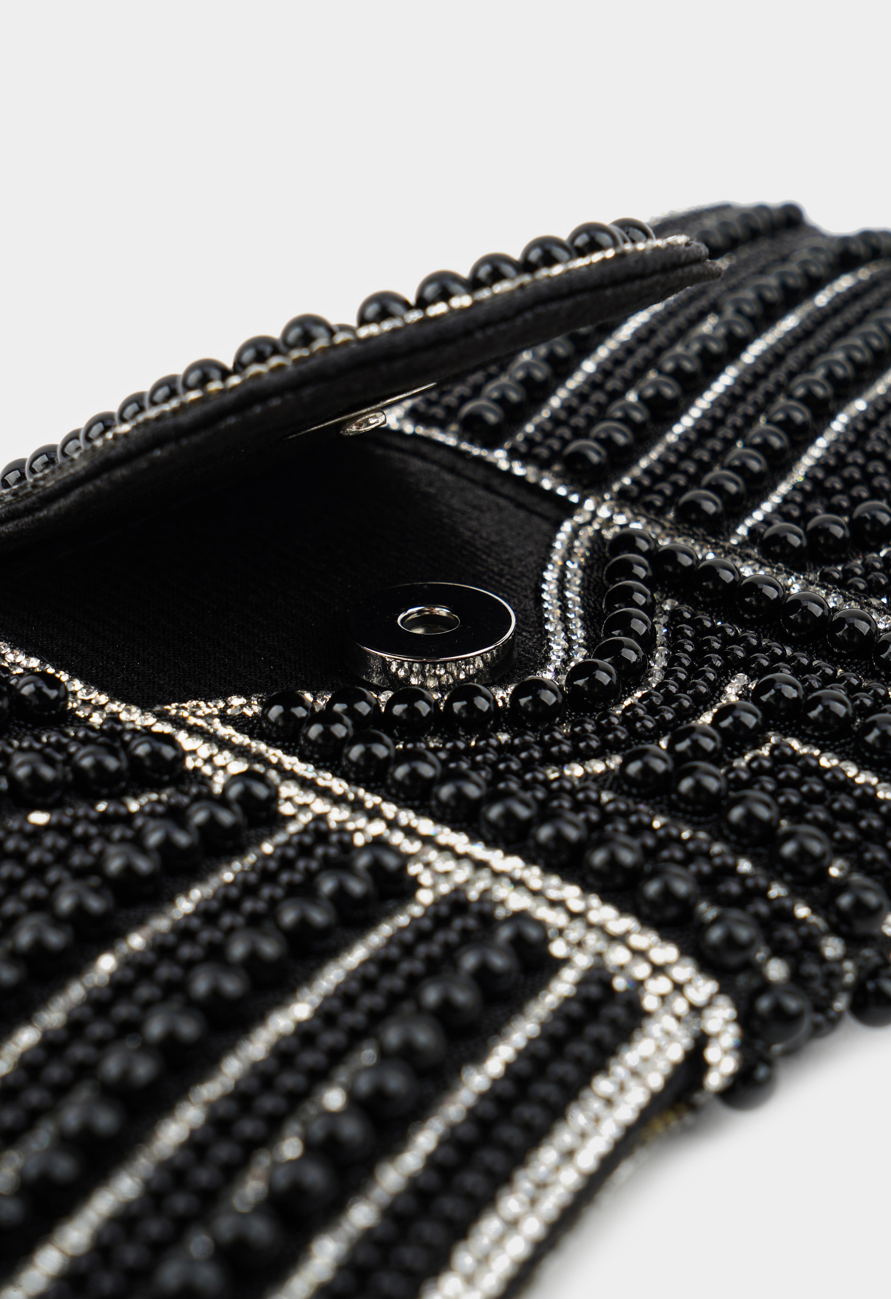 Черный клатч в форме эффектного банта – ваш готовый акцент для вечера: текстильная основа украшена декоративными темными бусинами и сияющими стразами, которые красиво переливаются при каждом движении и мгновенно притягивают взгляды. Удобная застежка на кнопке надежно фиксирует содержимое, а цепочка в комплекте позволяет носить клатч через плечо, оставляя руки свободными.