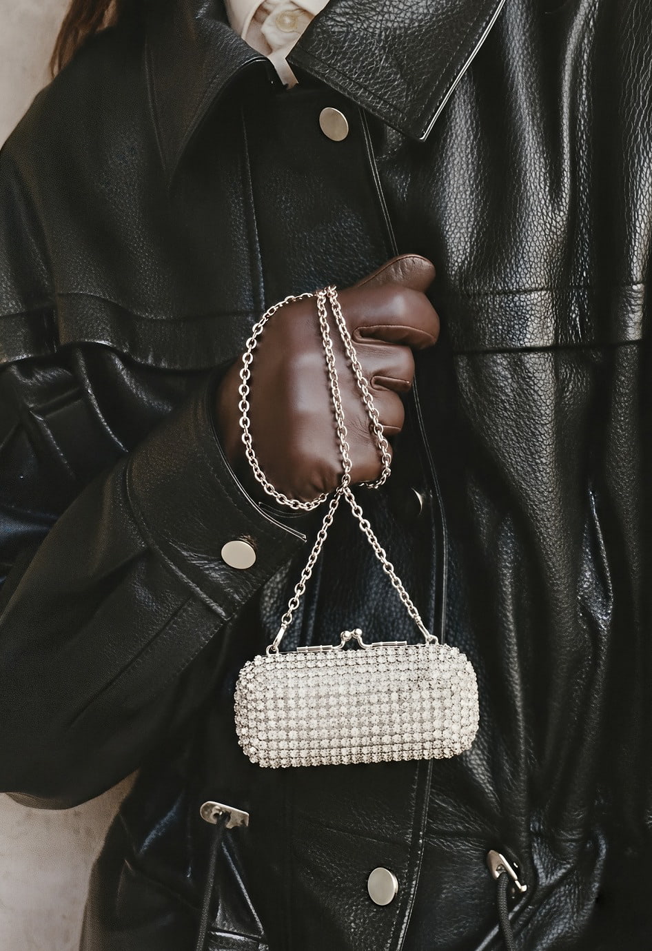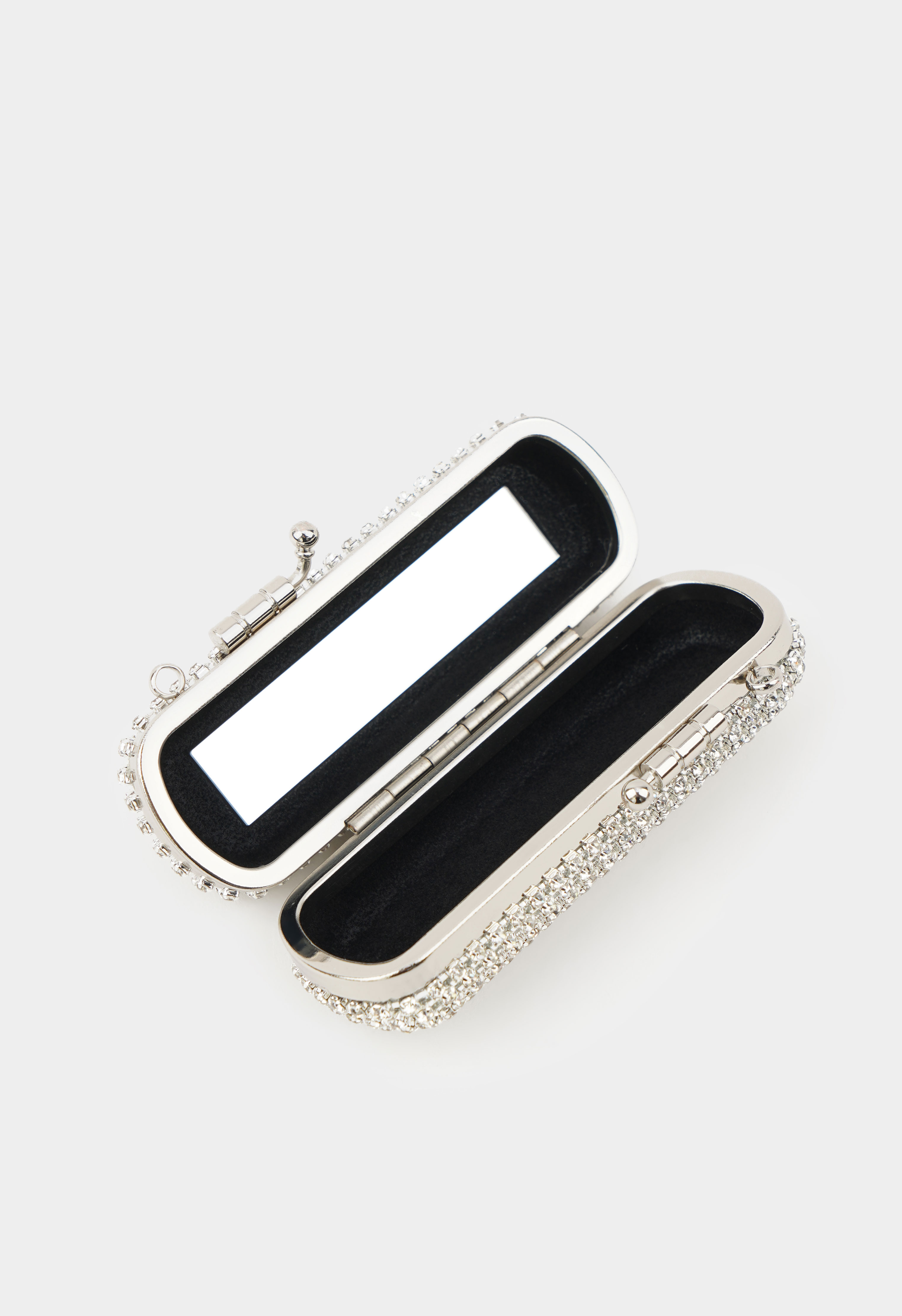 Роскошный серебряный клатч, полностью усыпанный сияющими стразами, создан для тех случаев, когда хочется блистать: он эффектно переливается при любом свете и моментально превращает даже самый базовый образ в вечерний. Жесткая форма держит идеальный вид, а защелкивающаяся застежка сохраняет содержимое в безопасности. В комплекте есть серебряная цепочка, чтобы вы могли носить клатч на плече или в руках, оставаясь свободной и уверенной весь вечер.