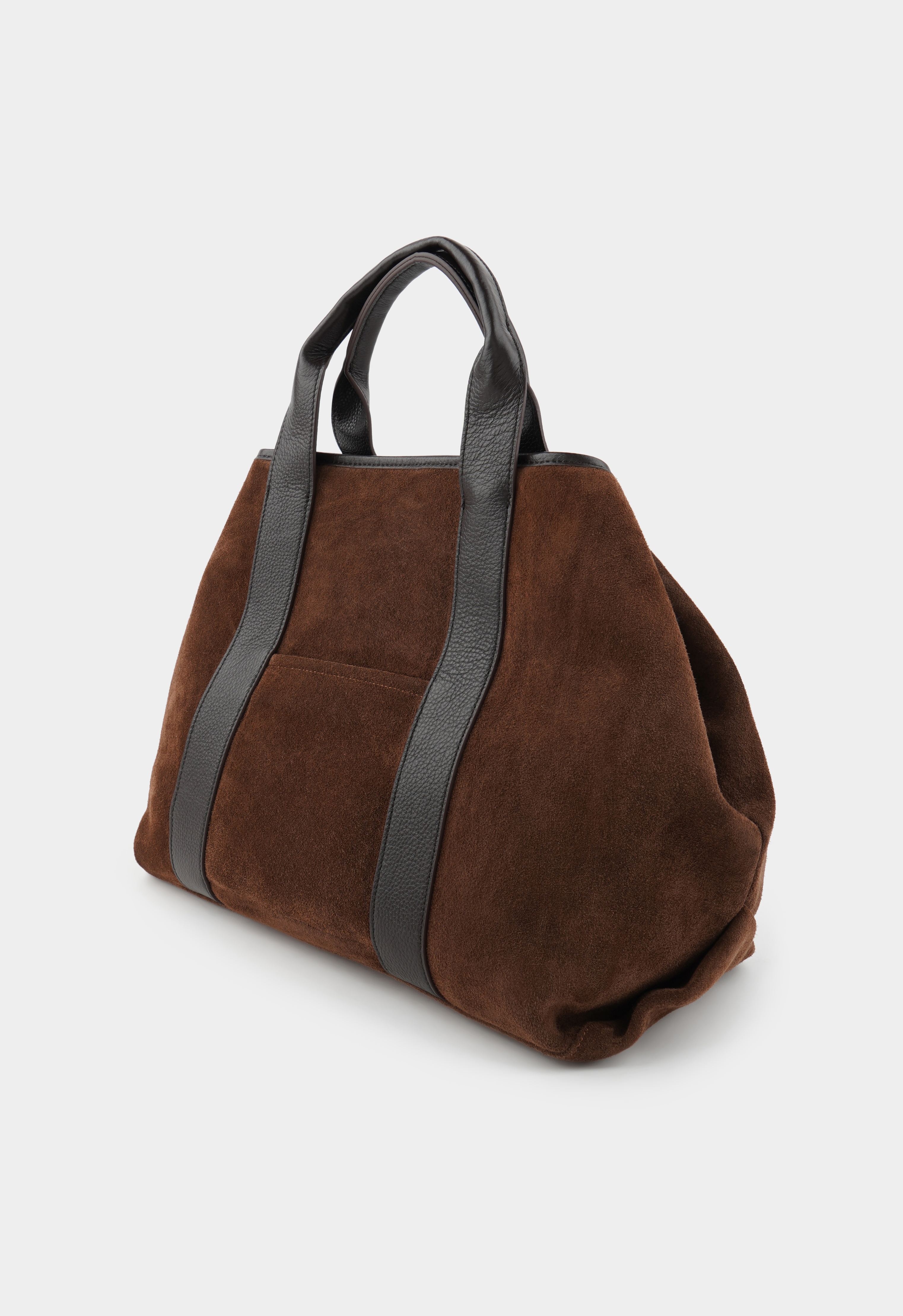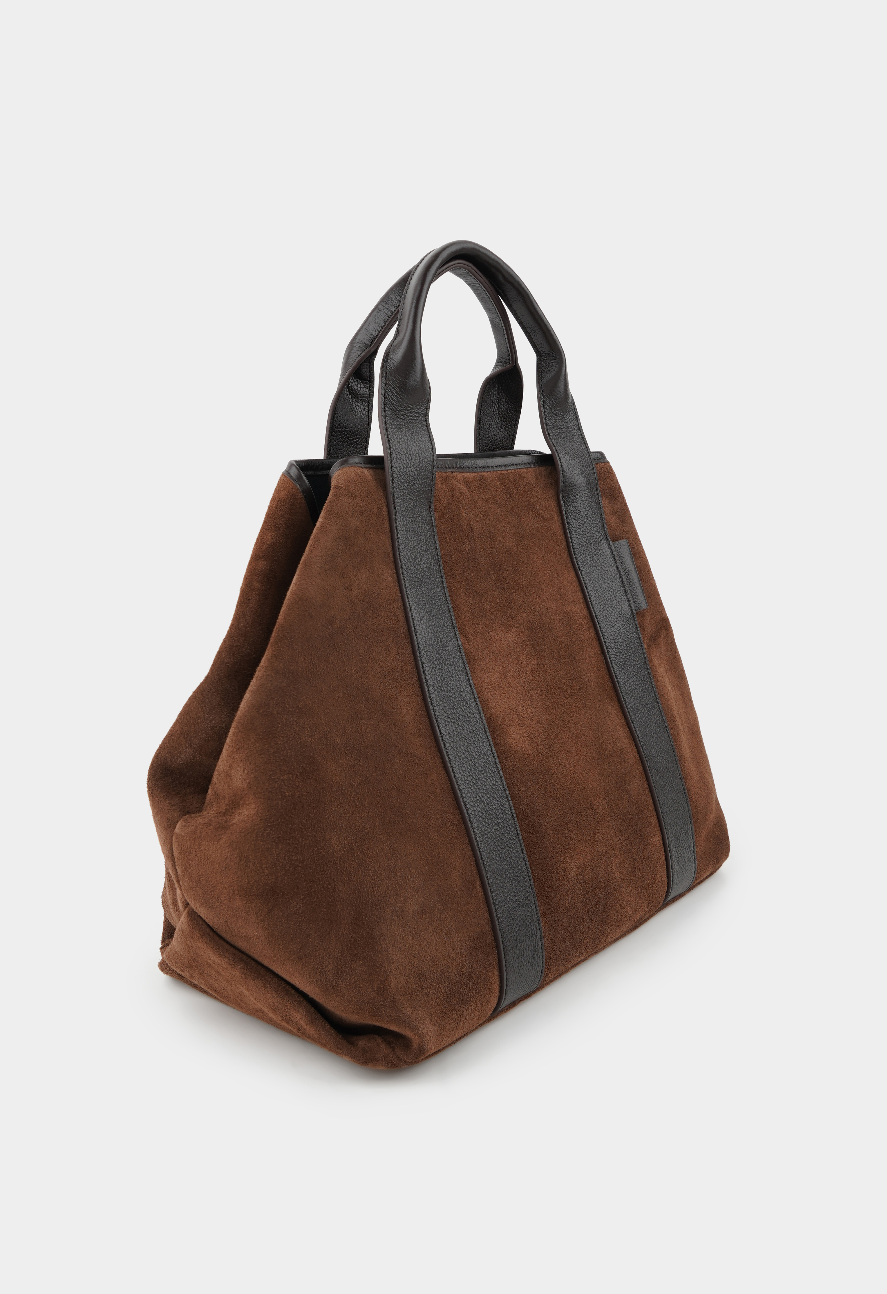 Элегантная и практичная сумка из натуральной замши в благородном коричневом оттенке с контрастными черными ручками – универсальный аксессуар, который станет вашим надежным спутником каждый день. Металлическая фурнитура придает образу современный акцент, а продуманный дизайн с двумя внутренними и одним внешним карманом позволяет держать все необходимое под рукой. Вместительный размер делает сумку идеальной для работы, шопинга или коротких поездок, в то время как съемный плечевой ремень добавляет удобства в движении. Это та модель, которая гармонично сочетается и с деловым стилем, и с повседневными образами, подчеркивая ваш вкус и уверенность.