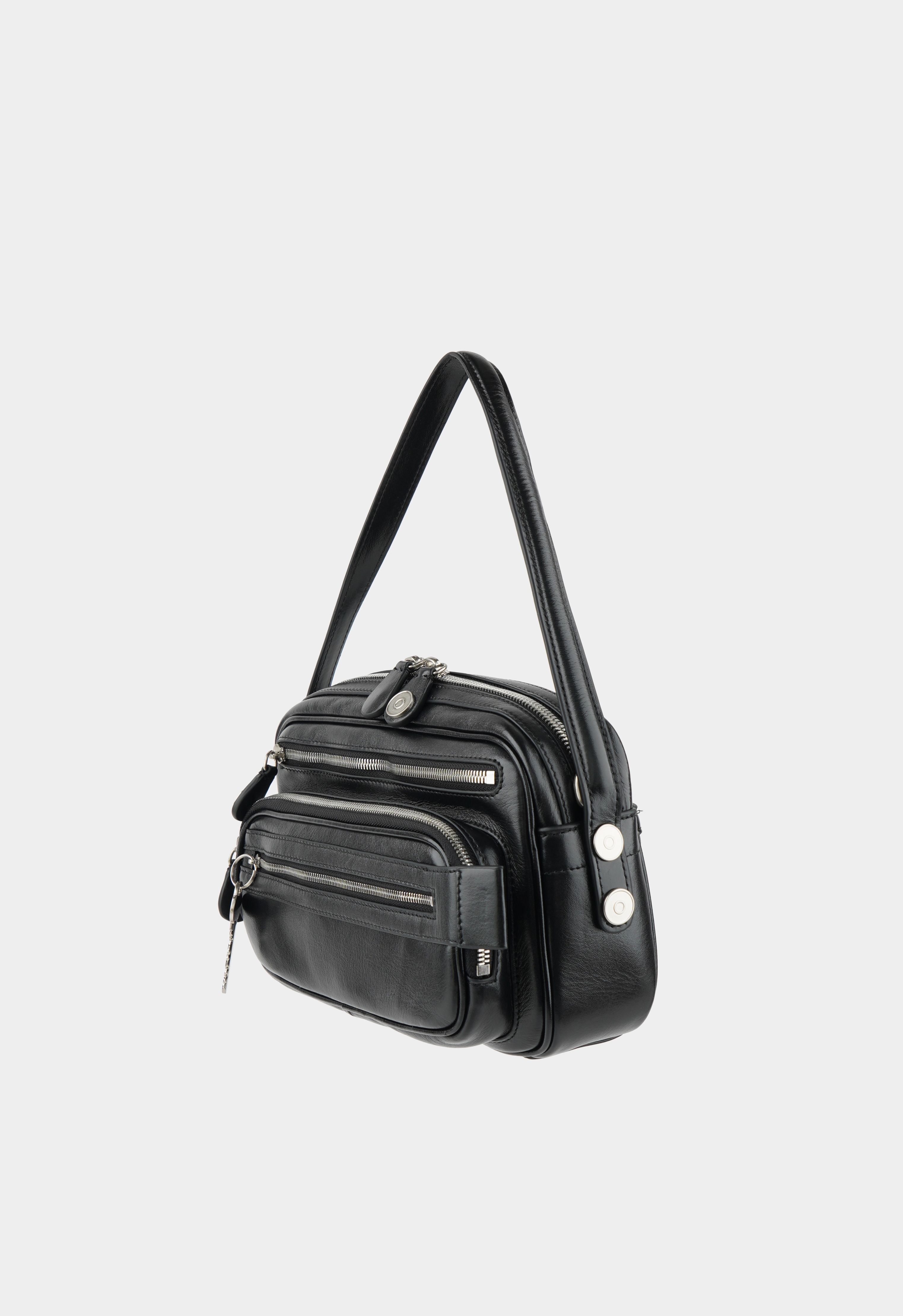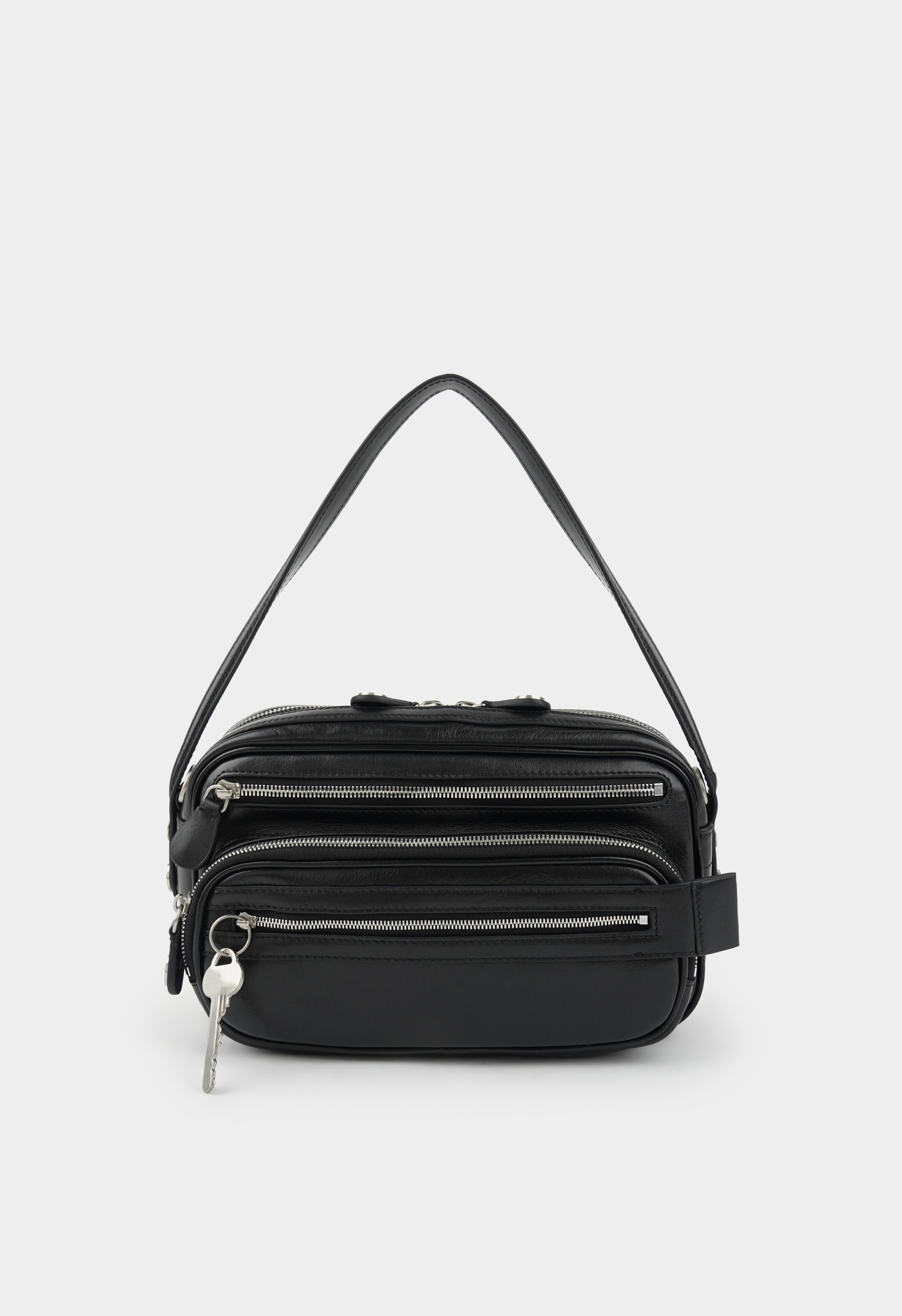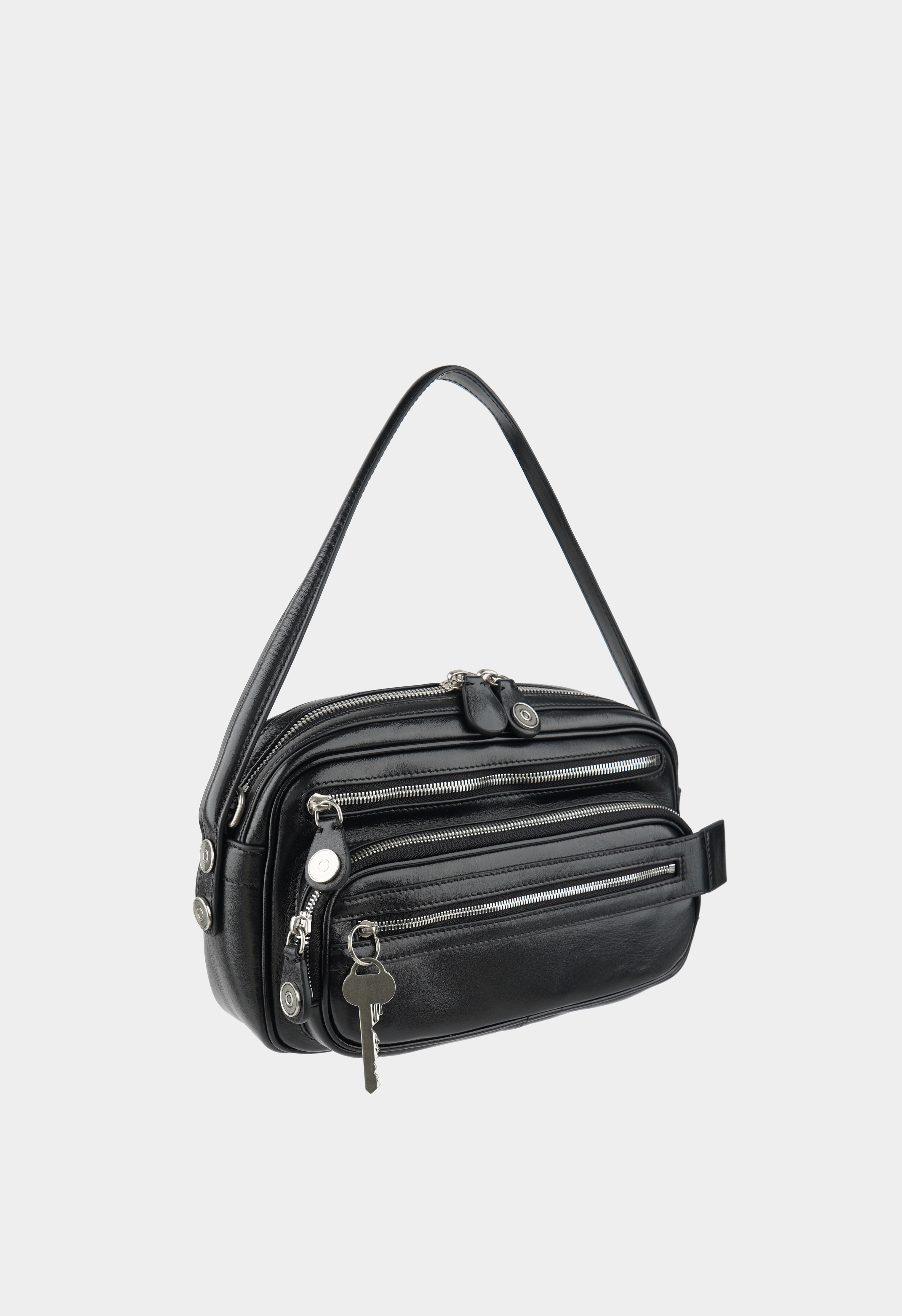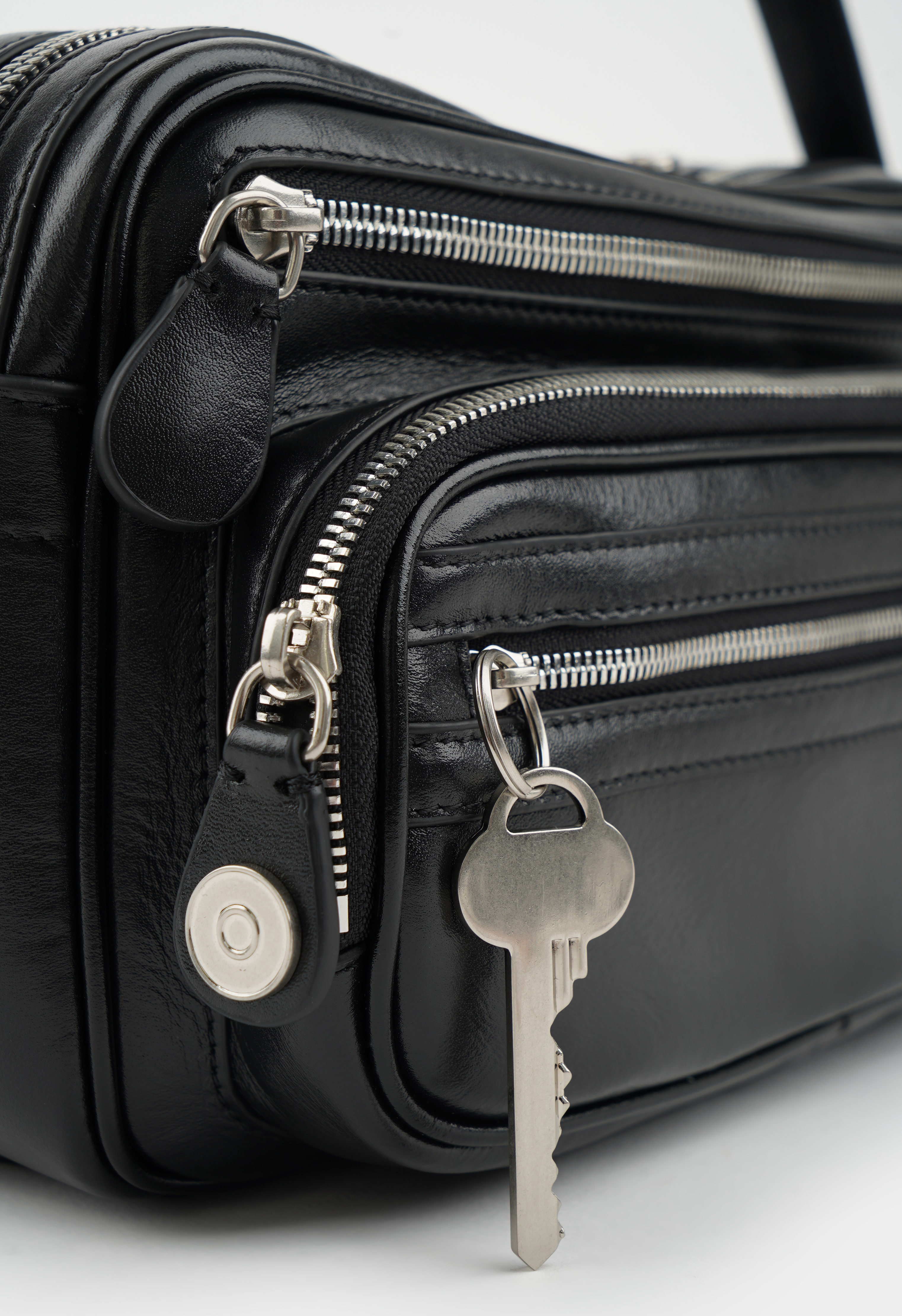 Компактная сумка из натуральной кожи черного цвета – стильный аксессуар, который станет вашим надежным спутником на каждый день. Лаконичный дизайн с серебряной фурнитурой и декоративным брелоком ключиком смотрится элегантно и современно, а продуманная функциональность делает модель особенно удобной: внутри – один карман для самых нужных вещей, снаружи – четыре аккуратных кармана, которые позволяют держать под рукой телефон, ключи и мелочи. В комлпекте идет плечевой ремень для удобства носки. Небольшой размер делает сумку легкой и универсальной, она одинаково органично смотрится и с повседневным образом, и с вечерним нарядом, подчеркивая ваш вкус и уверенность в стиле.