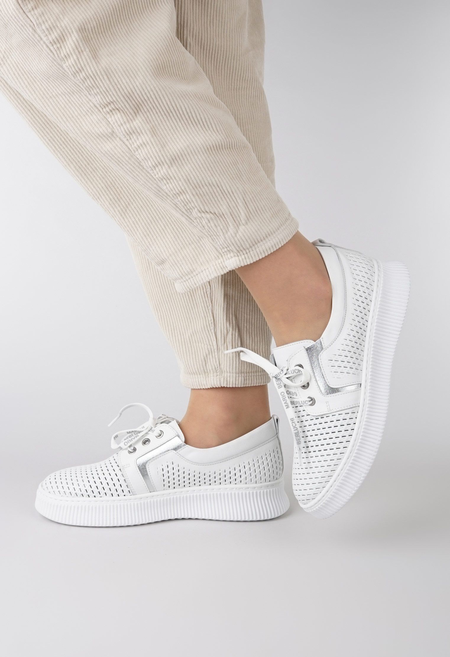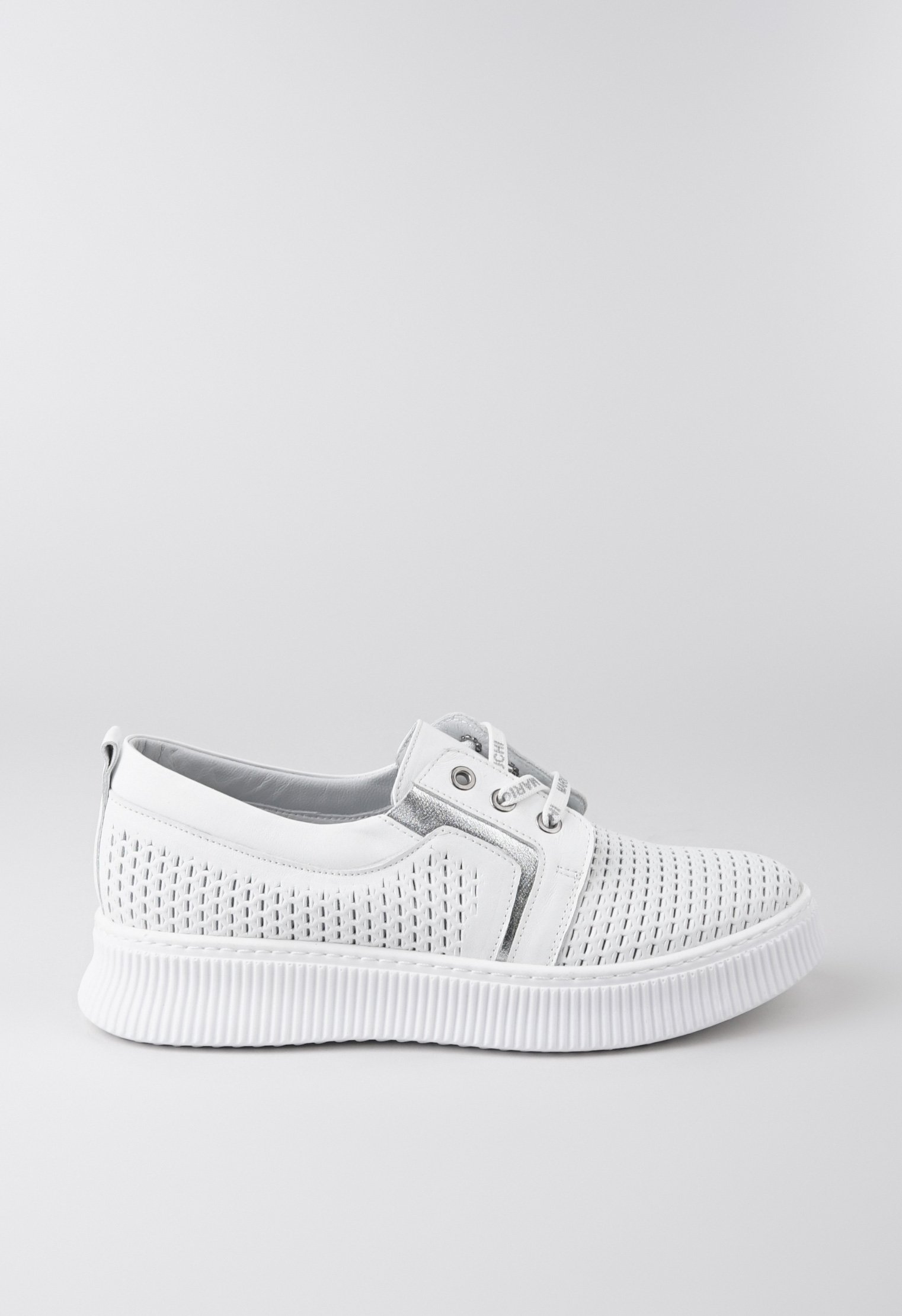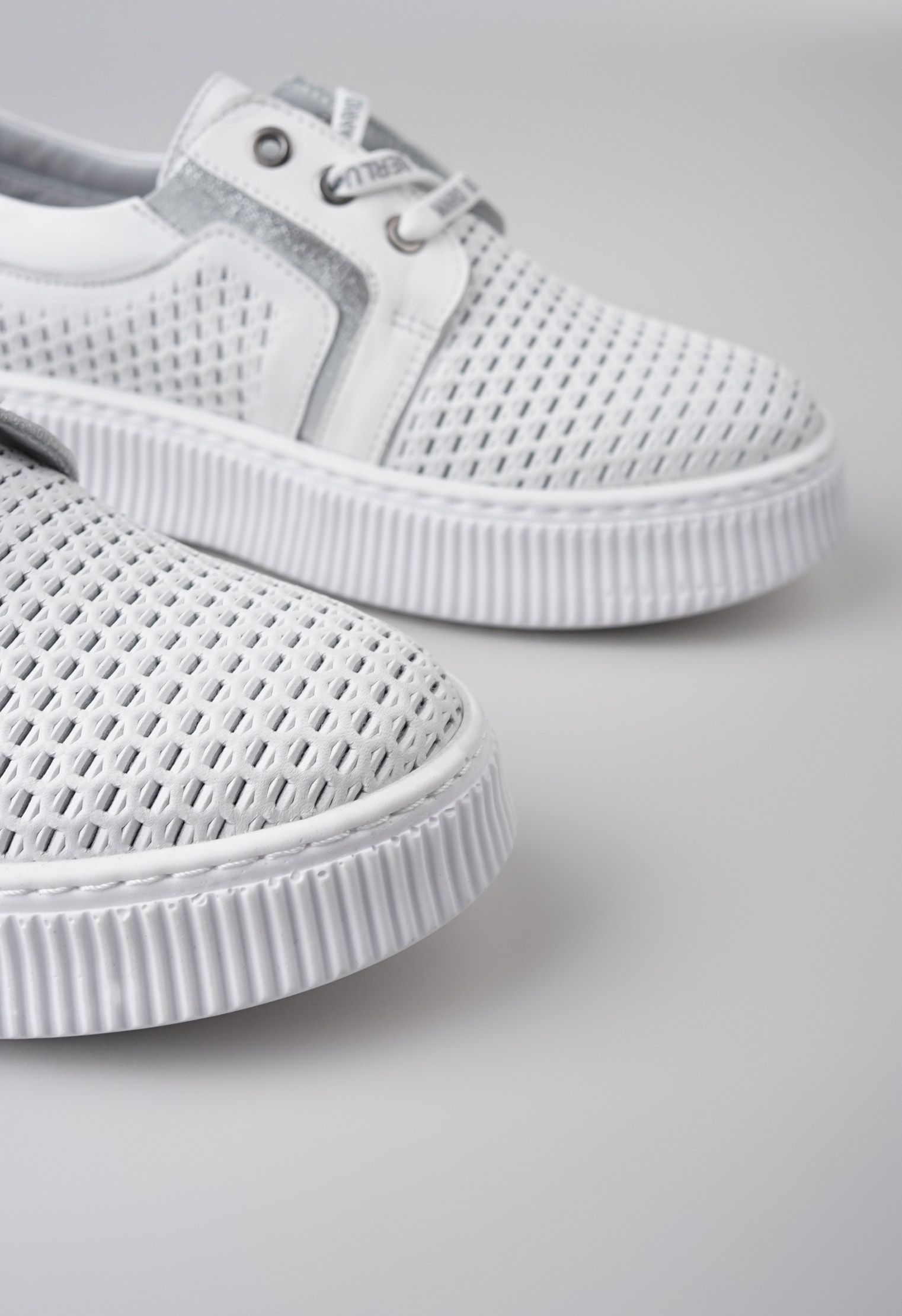 Обратите внимание: данная модель идёт в размер и отлично подходит для ног с широкой полнотой стопы. Советуем проконсультироваться с менеджером по выбору наиболее подходящего Вам размера. Кеды на платформе выполнены из перфорированной кожи и дополнены удобной шнуровкой. Модель декорирована серебристыми вставками и металлической фурнитурой. Кожаная стелька и высокая пятка предохраняют стопу от усталости. Классический силуэт и современная отделка непременно украсят Ваш летний образ, стильные белые кроссовки станут удачной альтернативой туфлям.