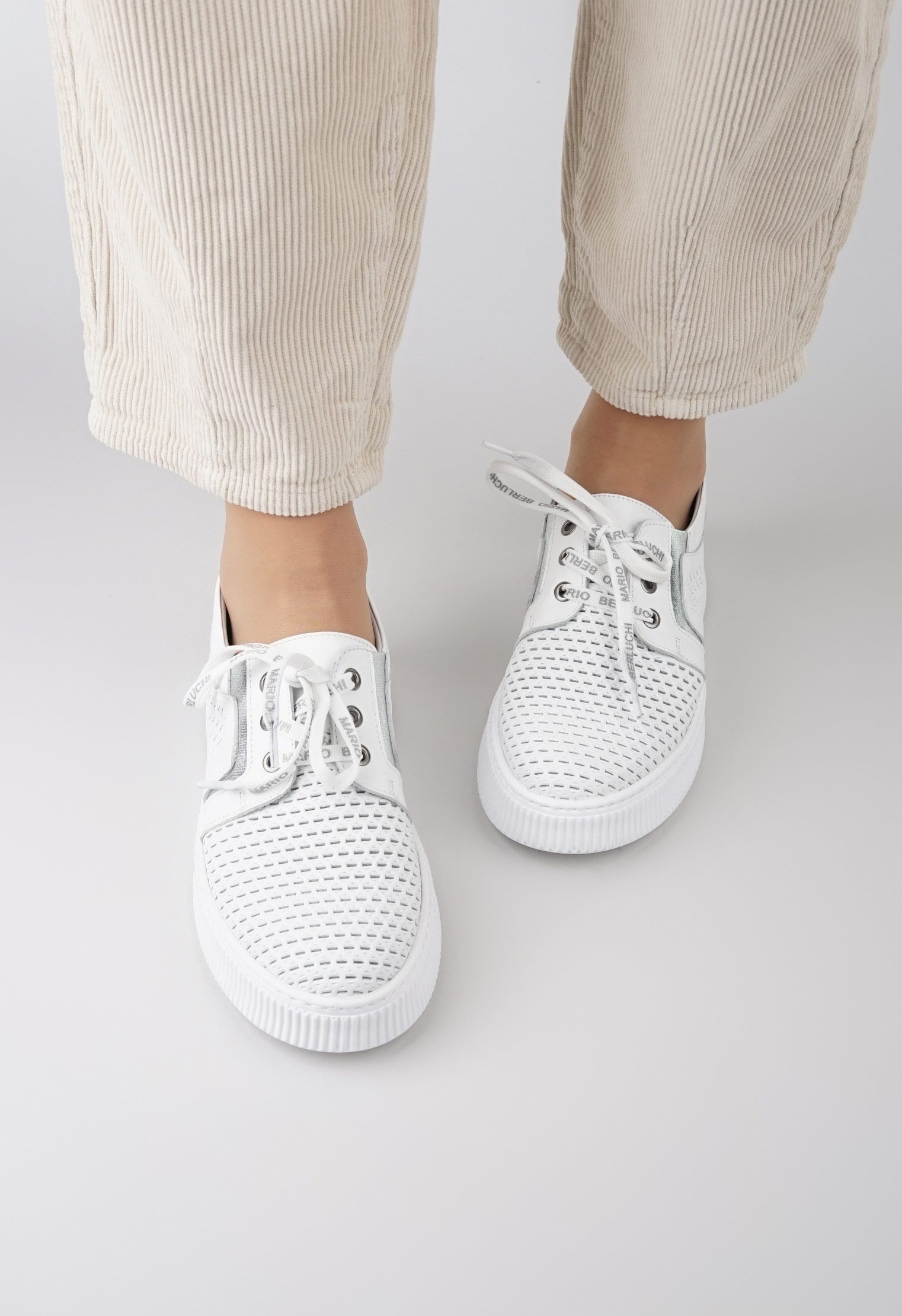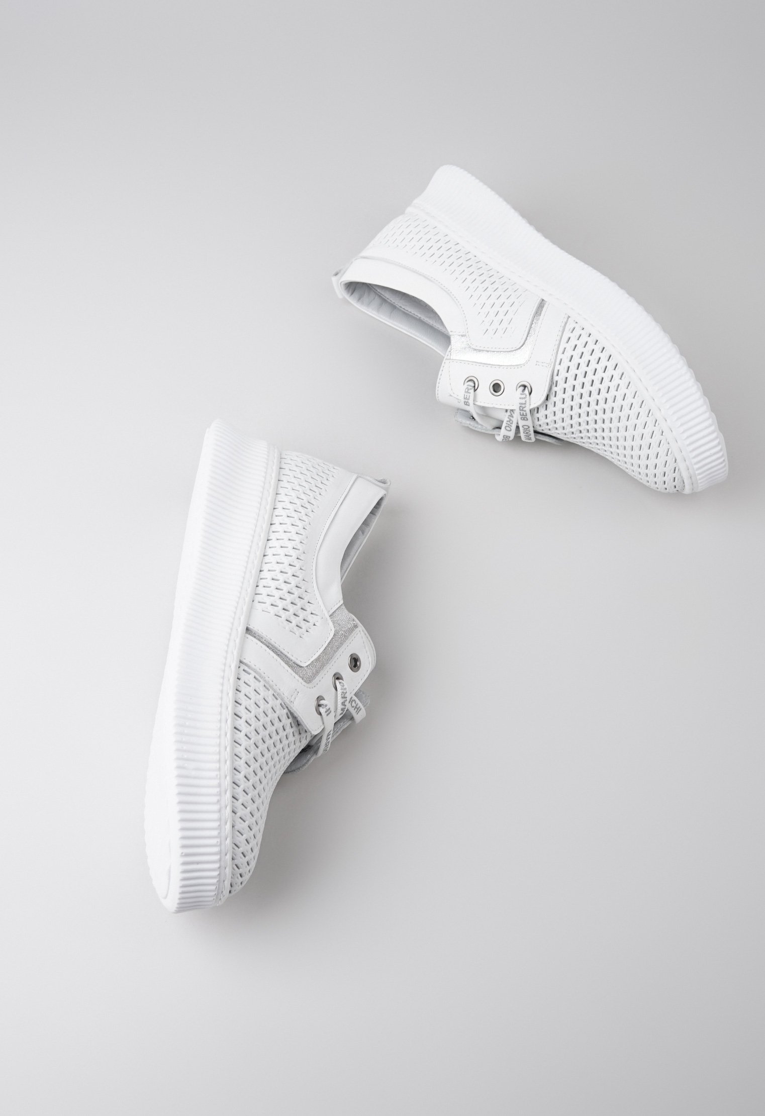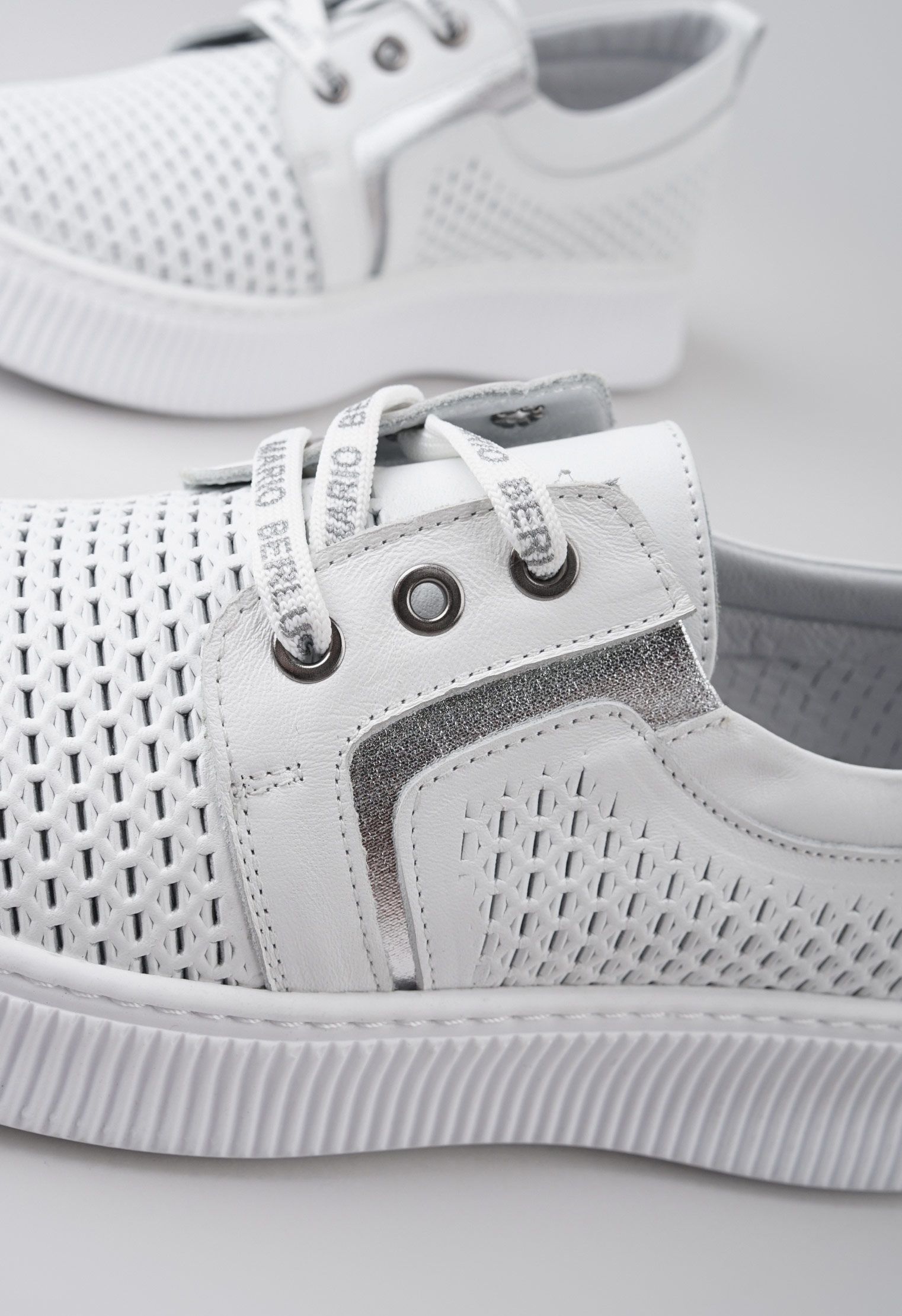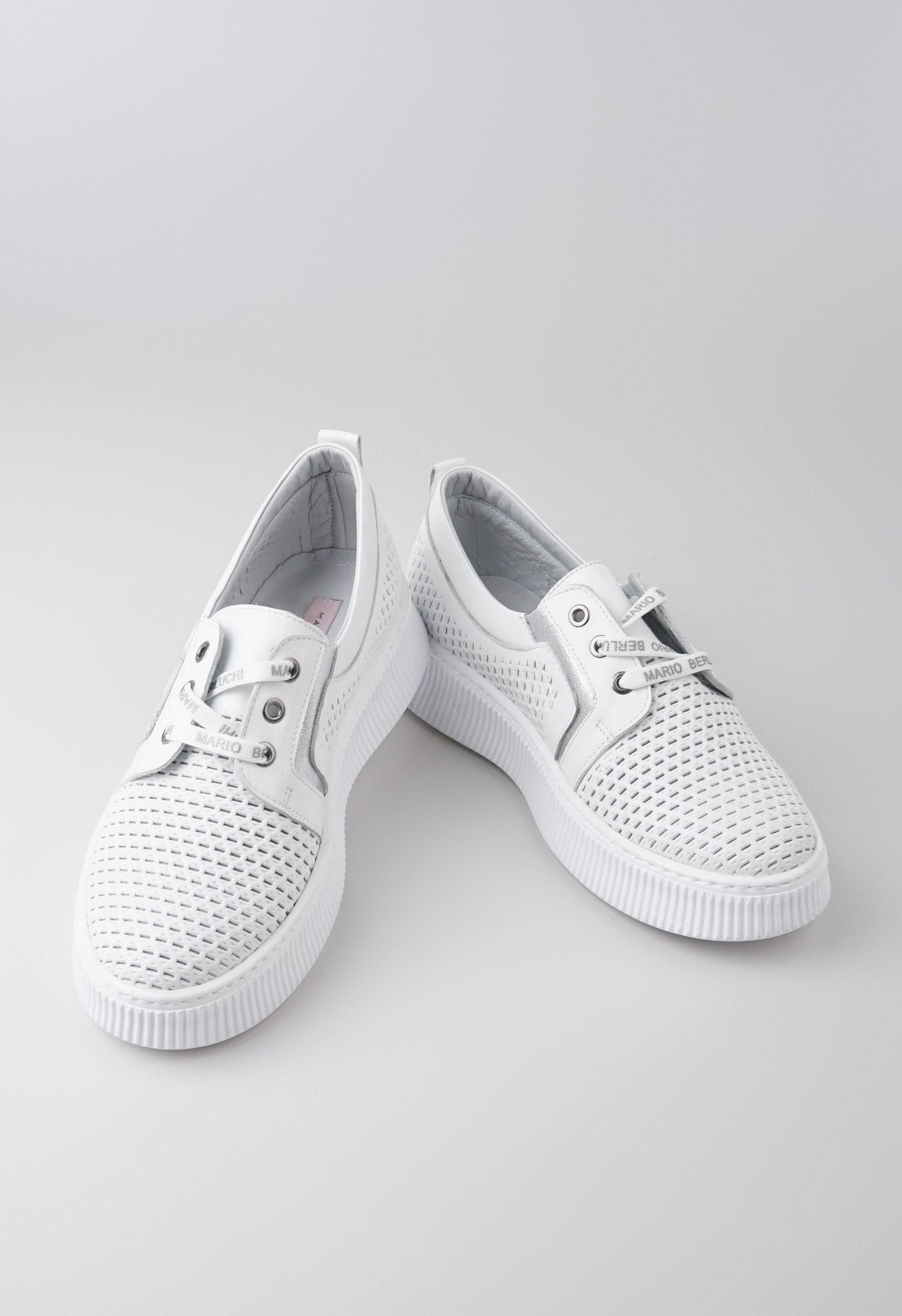Обратите внимание: данная модель идёт в размер и отлично подходит для ног с широкой полнотой стопы. Советуем проконсультироваться с менеджером по выбору наиболее подходящего Вам размера. Кеды на платформе выполнены из перфорированной кожи и дополнены удобной шнуровкой. Модель декорирована серебристыми вставками и металлической фурнитурой. Кожаная стелька и высокая пятка предохраняют стопу от усталости. Классический силуэт и современная отделка непременно украсят Ваш летний образ, стильные белые кроссовки станут удачной альтернативой туфлям.