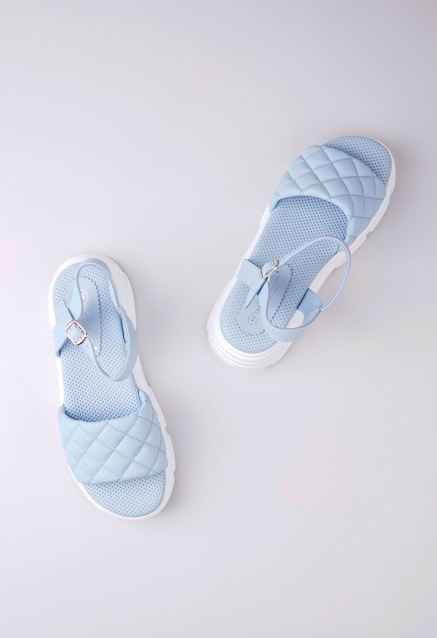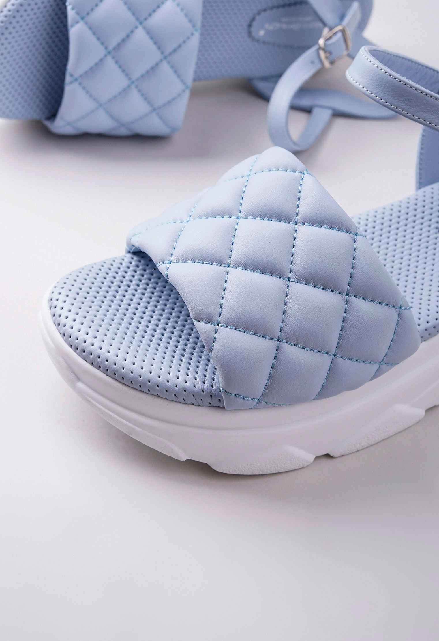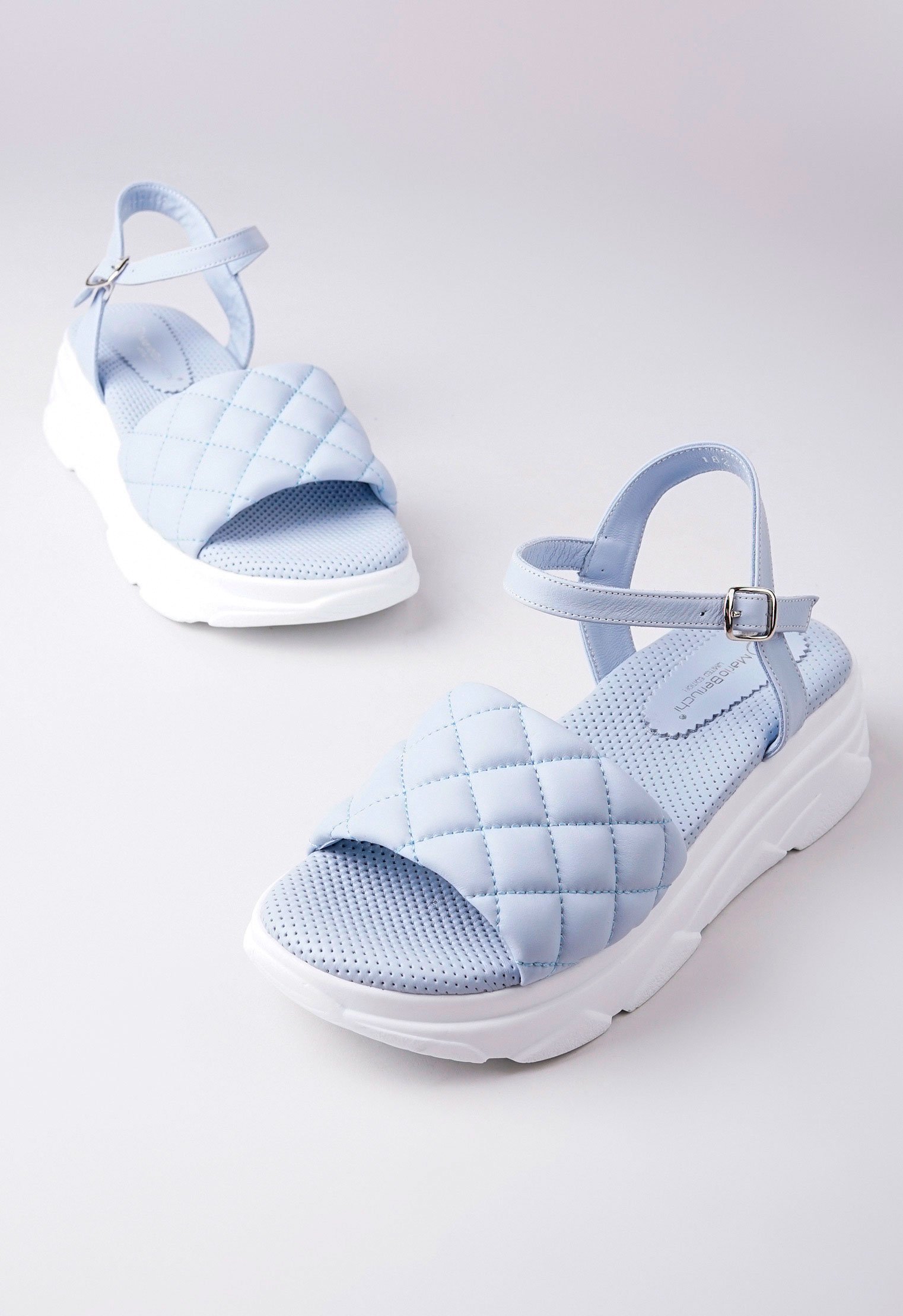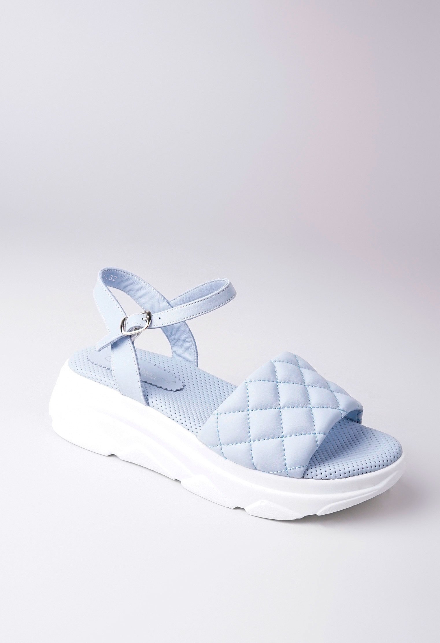 Обратите внимание: данная модель является маломеркой и отлично подходит для ног со средней полнотой стопы. Советуем проконсультироваться с менеджером по выбору наиболее подходящего Вам размера. Стильные сандалии выполнены из натуральной кожи и представлены в голубом оттенке. Модель декорирована строчкой и гибкой подошвой. Тонкий ремешок с пряжкой удобно фиксирует стопу, мягкая стелька дарит высокий уровень комфорта. Оригинальный дизайн и современное исполнение станет удачной альтернативой туфлям на каблуке, придавая изюминку Вашему образу.