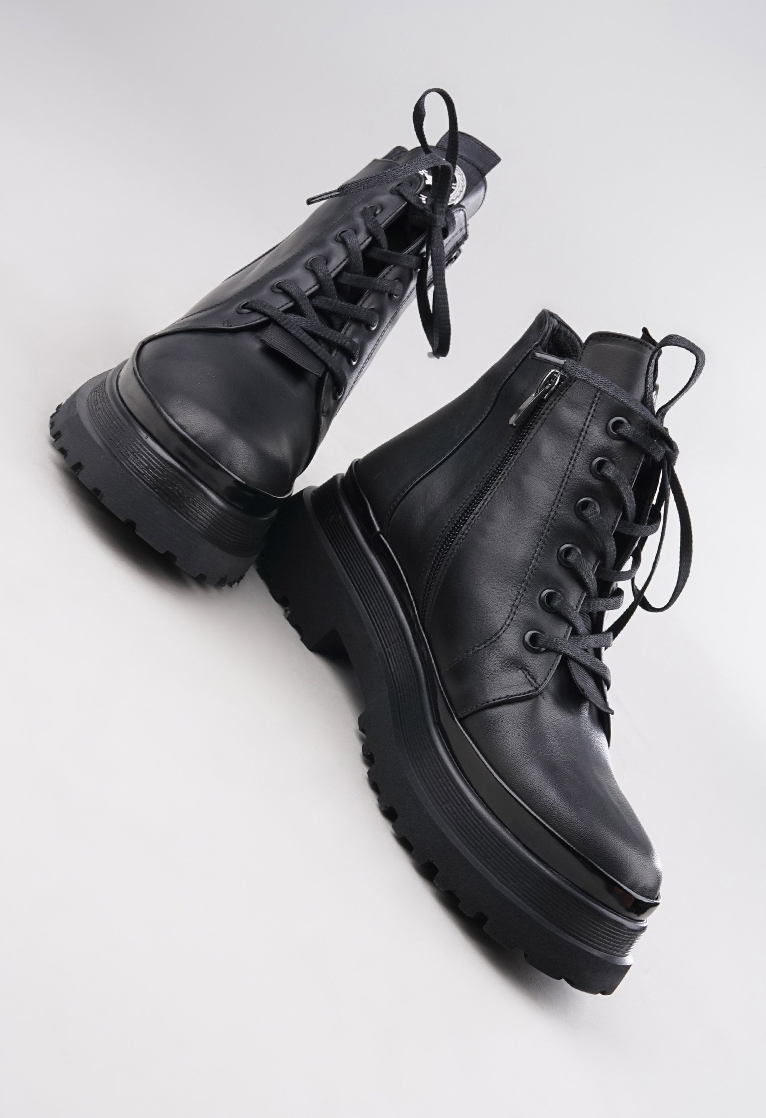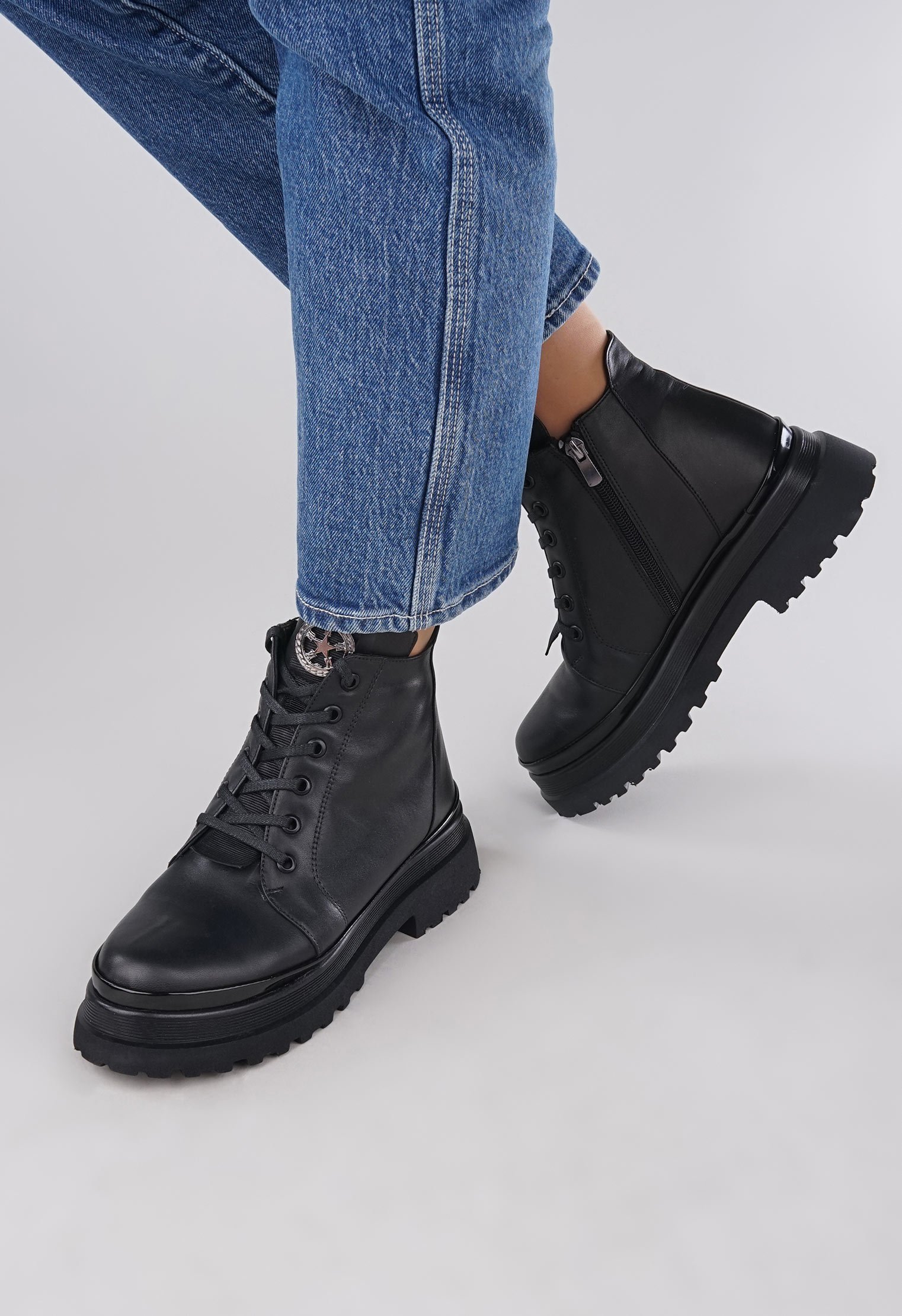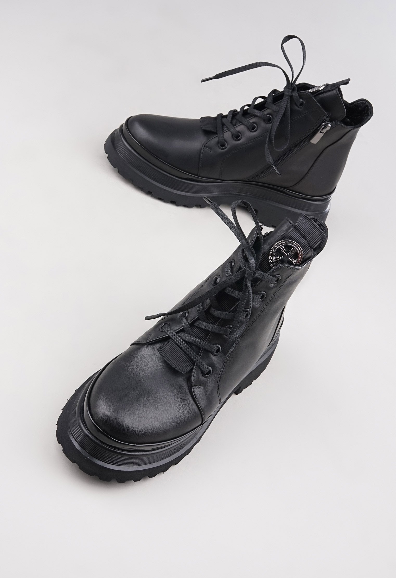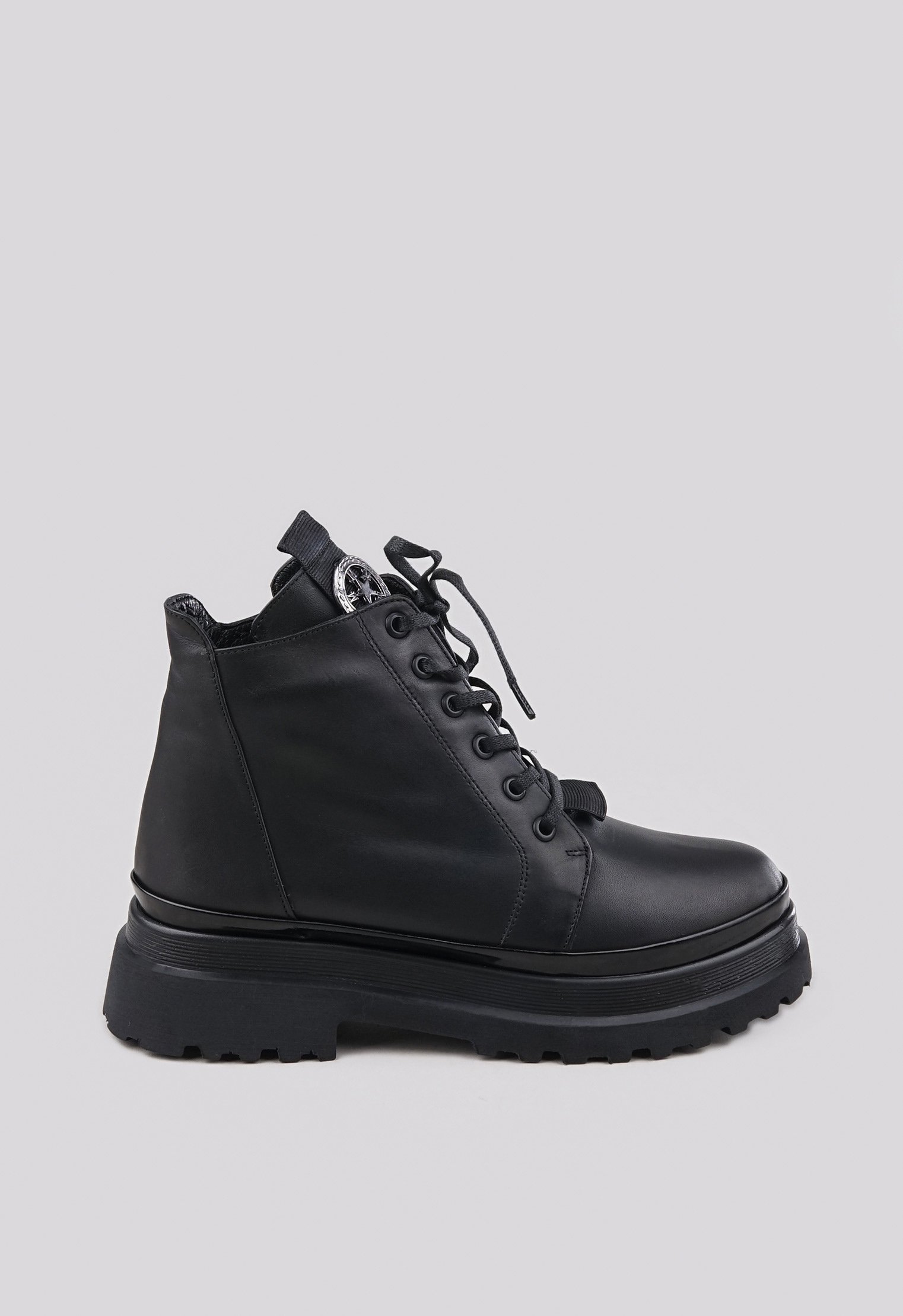 Обратите внимание: данная модель идёт в размер и отлично подходит для ног со средней полнотой и высоким подъёмом стопы. Однотонные ботинки на шнуровке выполнены из натуральной гладкой кожи и представлены в новой коллекции в классической расцветке. Шнуровка обеспечивает особенно комфортную посадку, мягкая подкладка из байки подарит тепло в демисезон. Лаконичная модель превосходно сочетается с элементами базового гардероба и никогда не выйдет из моды.