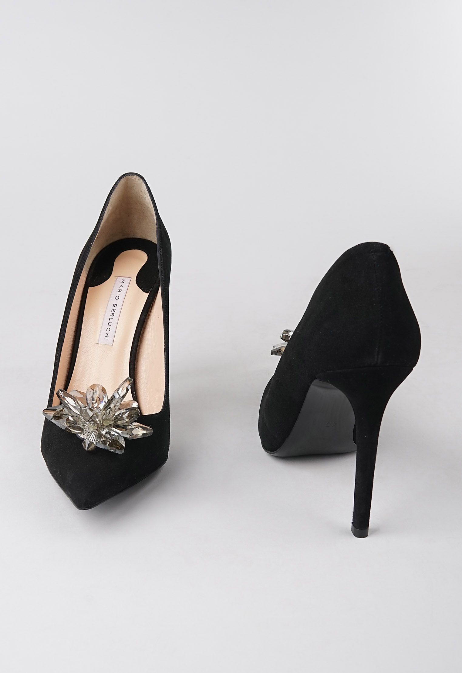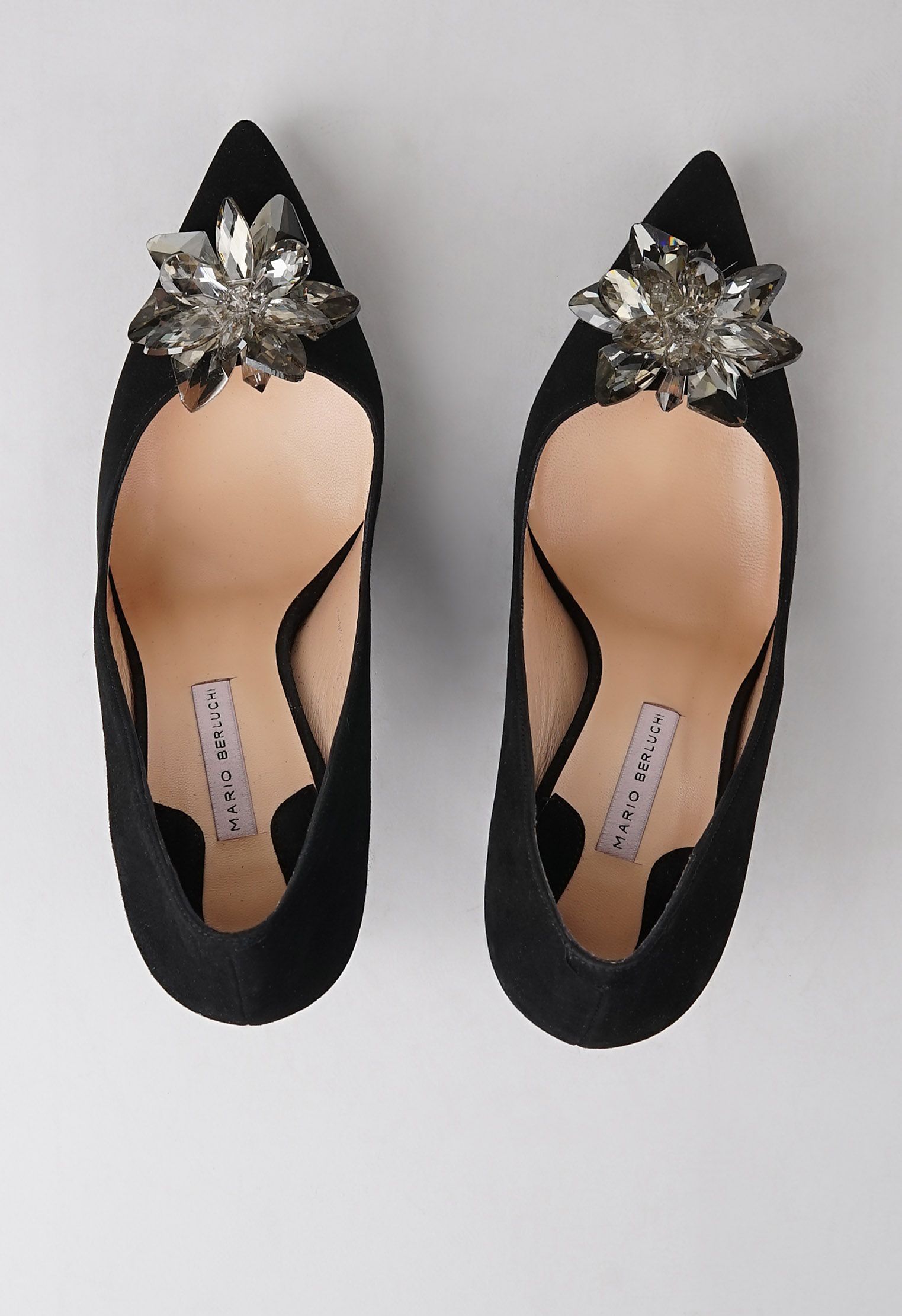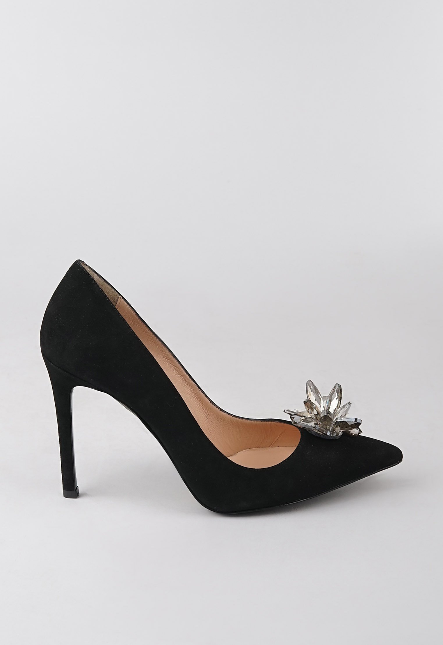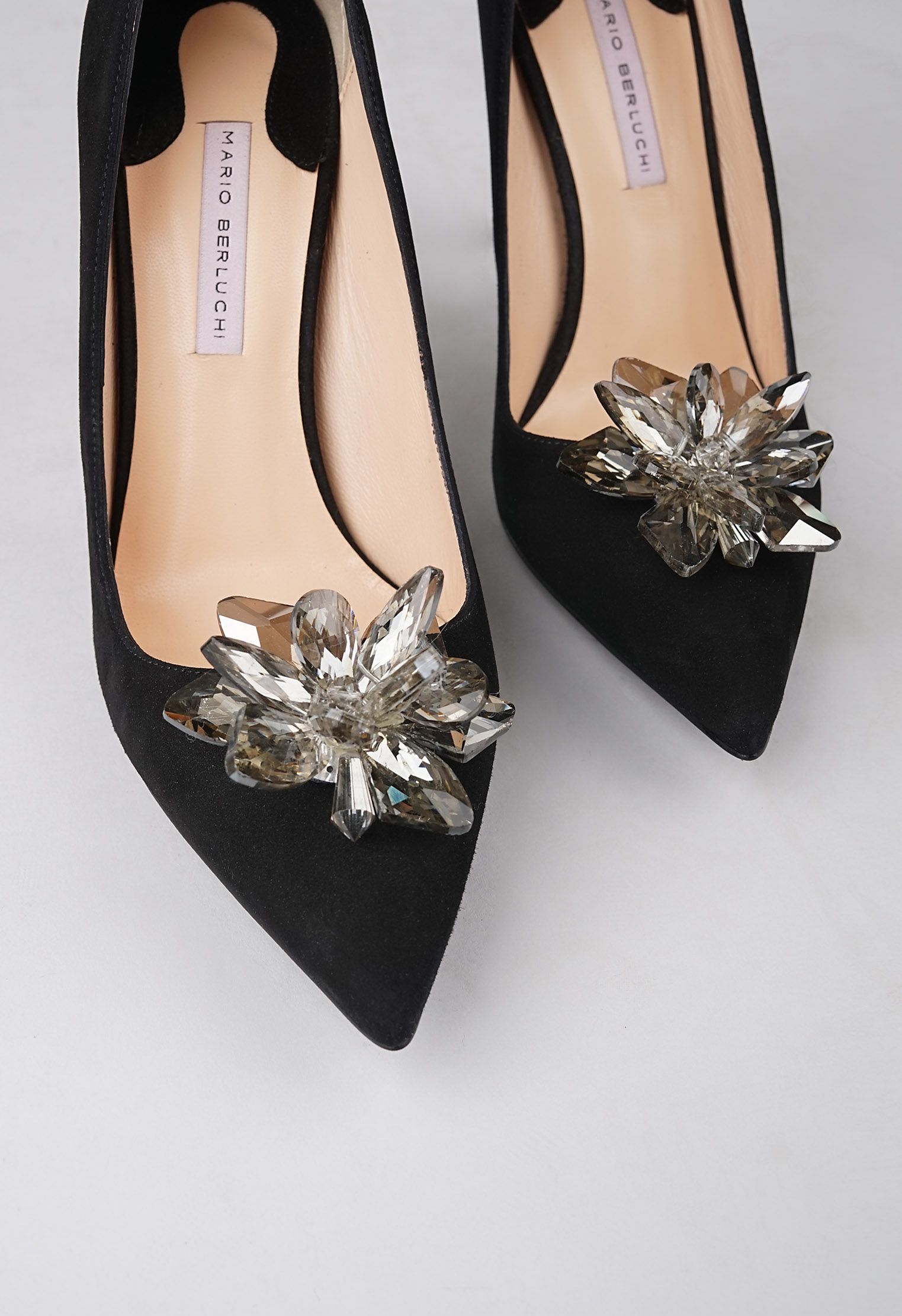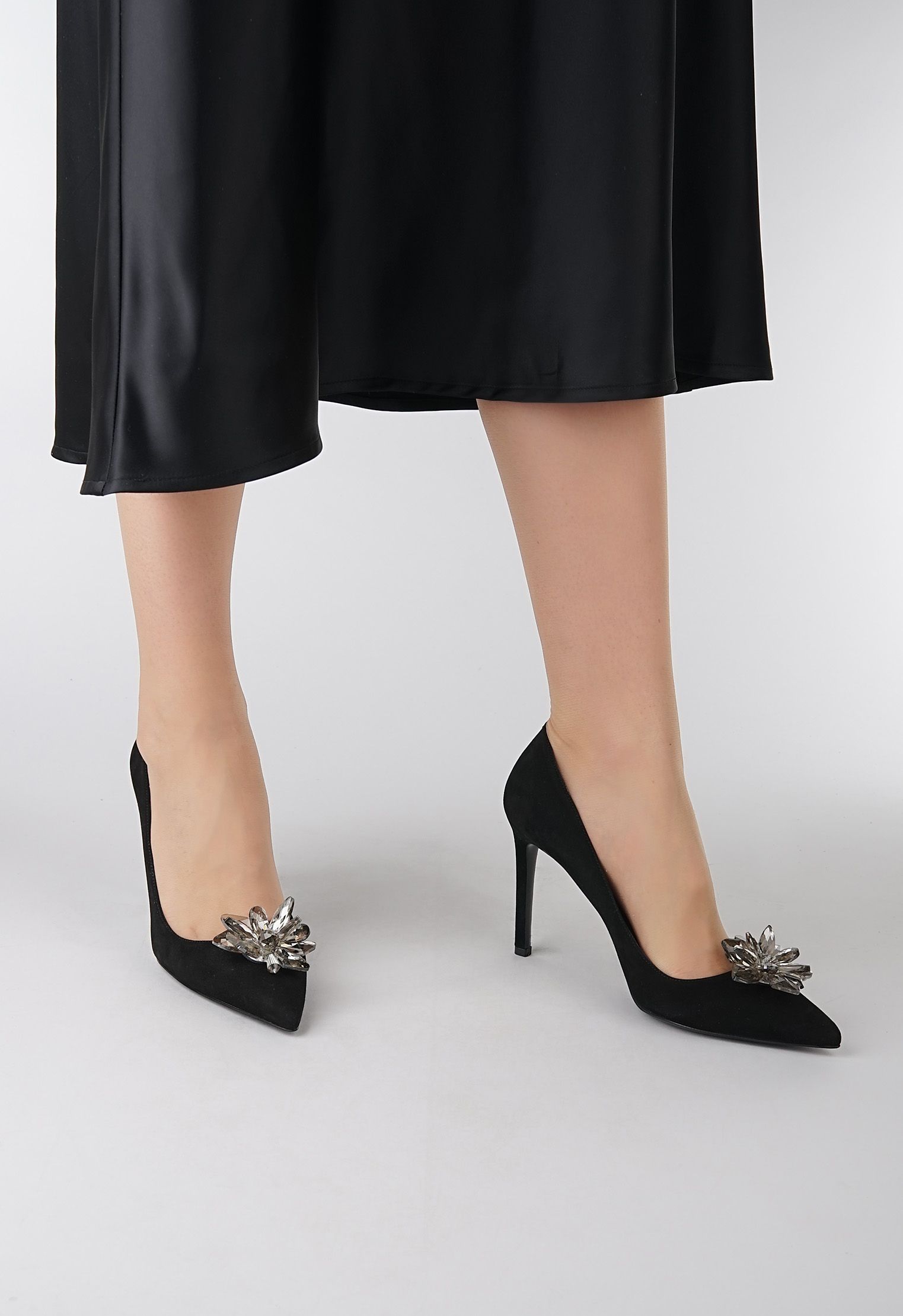 Обратите внимание: данная модель идёт в размер и отлично подходит для ног со средней полнотой стопы. Советуем проконсультироваться с менеджером по выбору наиболее подходящего Вам размера. Эти туфли станут настоящей жемчужиной вашей обувной коллекции! Отвести взгляд невозможно - роскошное декорирование заостренного мыса в виде крупного ослепительного цветка завораживает с первой же секунды! Высокий тонкий каблук в сочетании с благородной черной замшей идеально подчеркнет женственную элегантность наряда. Идеальная пара для вечернего образа!